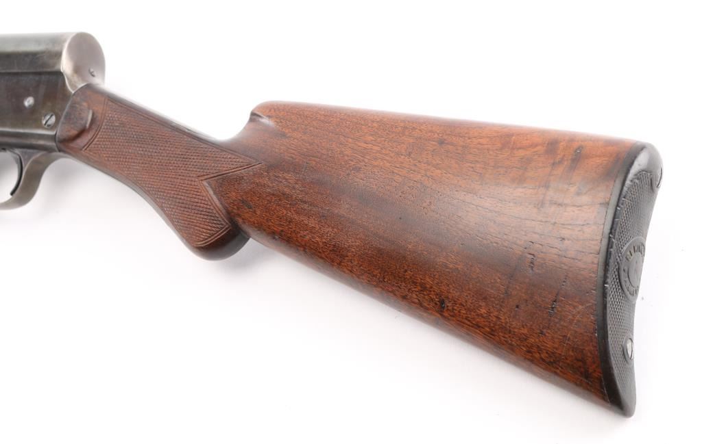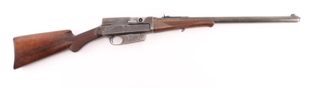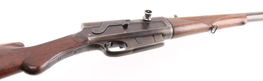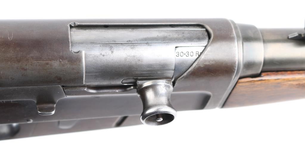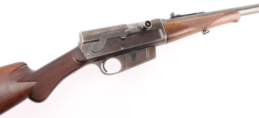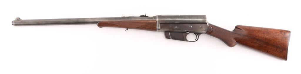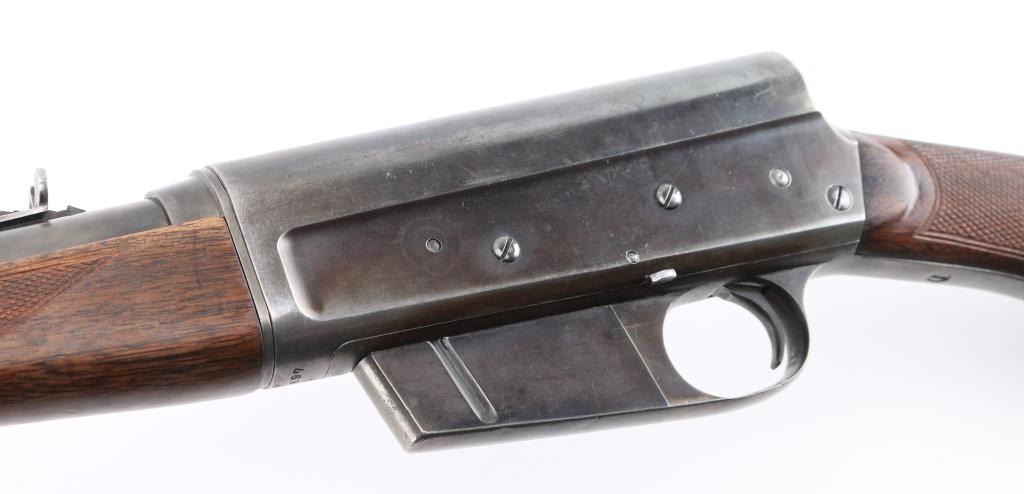 Vintage semiautomatic rifle ( Manufactured 1927) features blued finish, checkered wood forend, checkered 'Prince of Wales' style grip stock with curved steel buttplate, 22" barrel, buckhorn type sights, manual safety. Can be taken down for compact storage or transport. Bore is very good, strong rifling. Blue is about 60% thinning, with handling wear, mostly on the receiver, minor scratches/dings. Wood is very good overall,. with scratches/dings, factory hard rubber buttplate. Condition is NRA Good++. C&R Firearm.