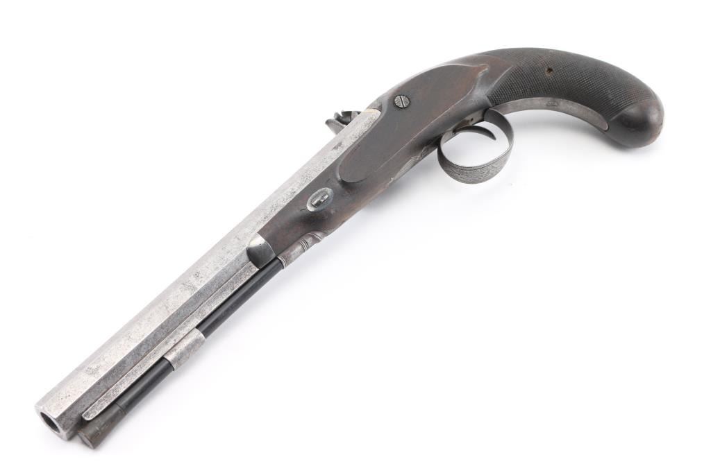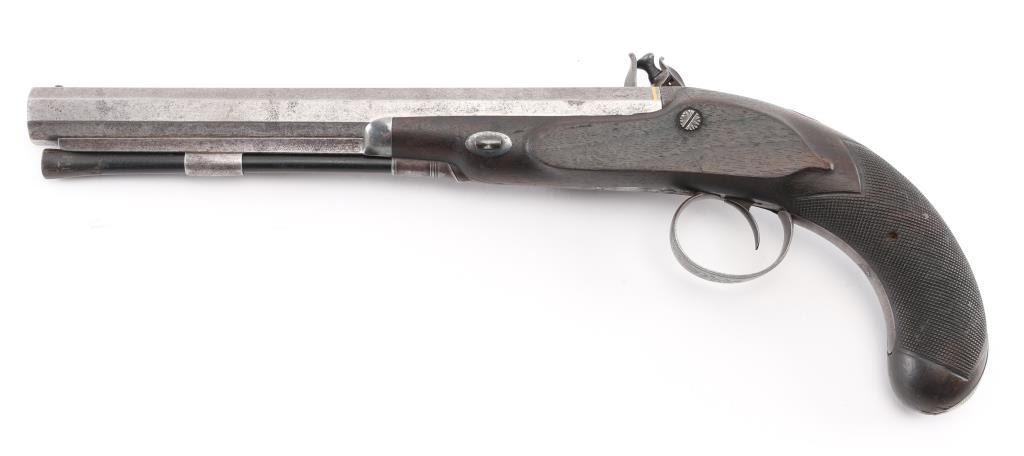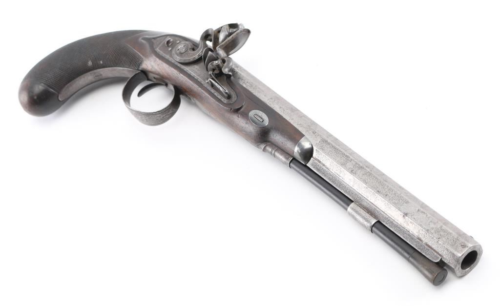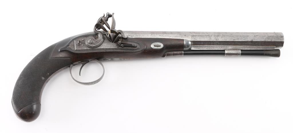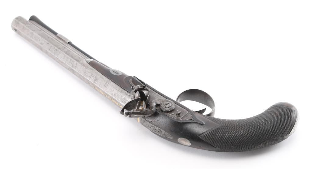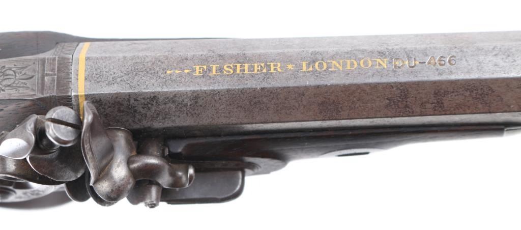 Ornate gold inlayed English flintlock target/Dueling pistol. 10" octagonal barrel, half wood stocks with checkered bag grips with steel fore cap, wood ram rod with horn tip. Lock plate marked "Fisher", top flat of barrel inletted in gold is "Fisher London". Gold band on rear of barrel, and gold touch hole insert. Small sterling silver plate behind the tang, and sterling silver butt cap engraved in a sunburst pattern. Furniture and screw heads are engraved, including the British "Union Jack" shield on triggerguard, tang, and lock plate, lower tang is a engraved pineapple. Smooth bore looks good, a little dark/dirty, two-cock action locks up tight, barrel is ion the white with scattered light pin-prick pitting. Wood is good with minor scratches/ding, there is a small dent in the left grip. Someone has stamped "DU-466" on the top barrel flat forward of "London" marking. All markings are clear/crisp. NRA Condition-Very Good as Antique Firearm.