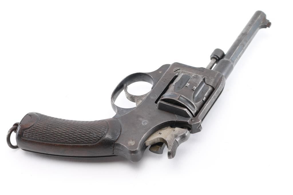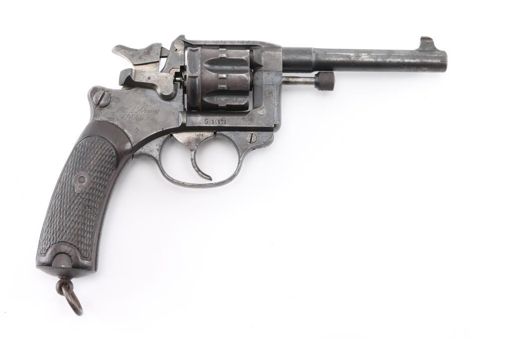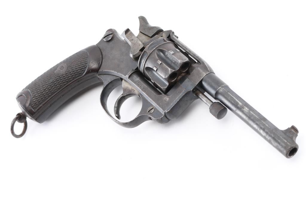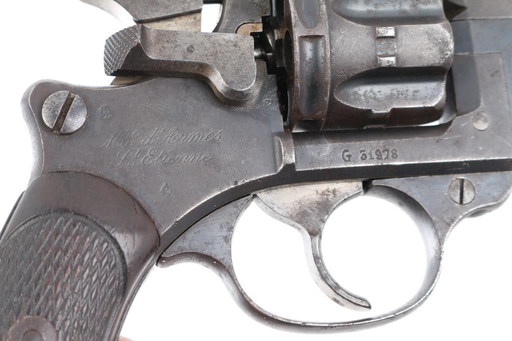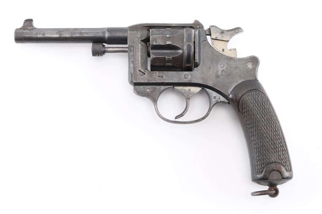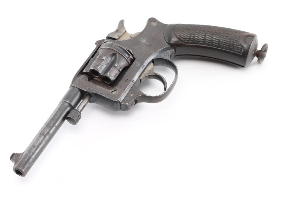 French military revolver chambered in 8mm Ordnance revolver cartridge. Manufactured 1892-1924 this one manufactured 1899. Features 6 shot cylinder that swings out to right side for loading and unloading, fixed sights,. 4.5 inch round/octagonal barrel, and lanyard ring on butt. Operates single and double action. Action works fine and lock-up is tight. Bore has rifling and moderate amount of light pitting. Metal finish has turned a gray mottled patina. Good condition wood grips with worn checkering and a few small dents. No import marks observed. Arsenal markings on right frame, "Mle 1892" on top of barrel, along with 'S 1899", French proof marks. All markings are crisp/clear. Condition is NRA Very Good as Antique Firearm.