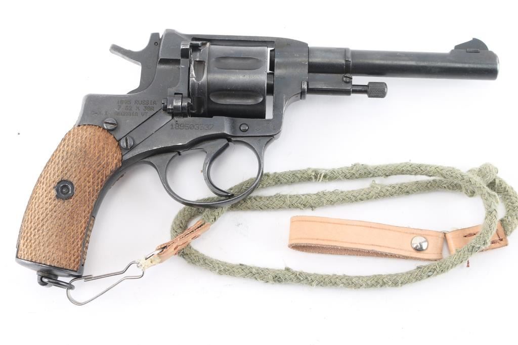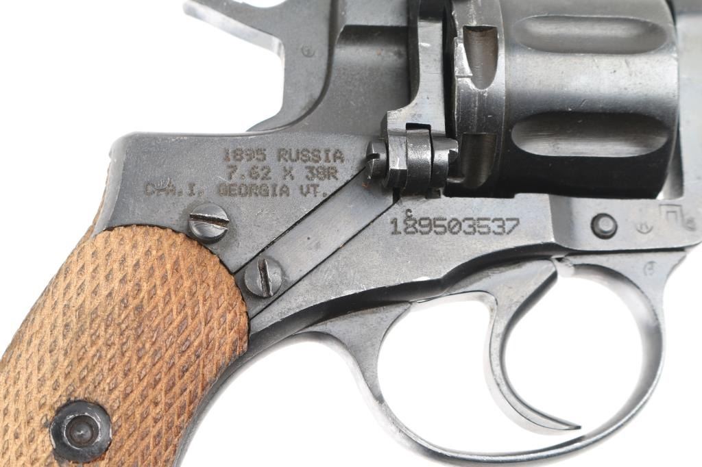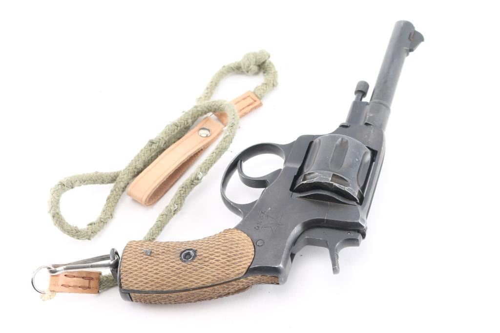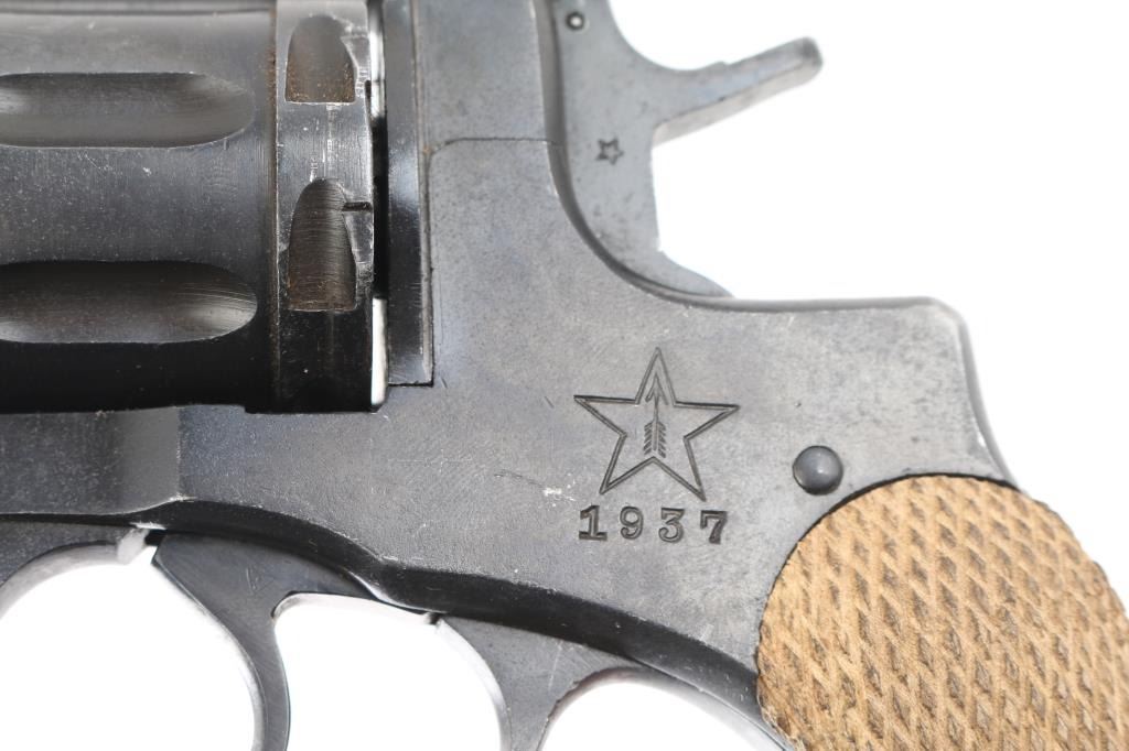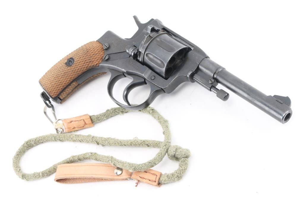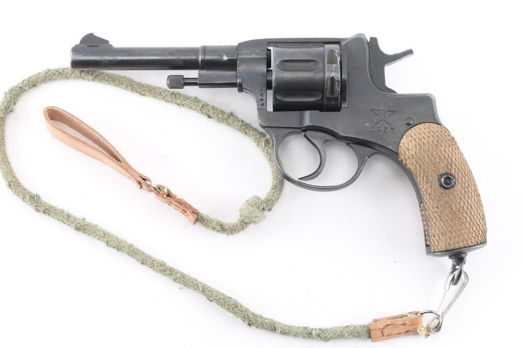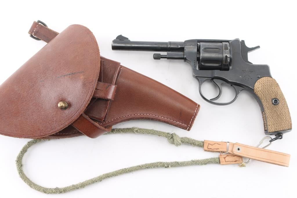 Russian military "gas seal" revolver imported by CAI, Georgia VT. Dated 1937. Features a matte blued finish, brown wood checkered grips, 4.4" barrel, fixed sights, double/single action, lanyard ring at butt. Bore and chambers are very good condition. Retains 90% dark blued finish, possibly arsenal reworked. Grips are good condition. Action operates properly with tight lock-up. Includes newer brown leather full flap holster, lanyard. Condition is NRA very good (possible arsenal rework) C&R Firearm
