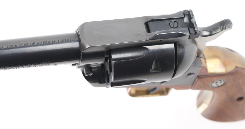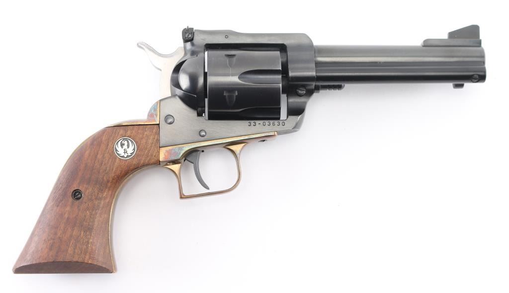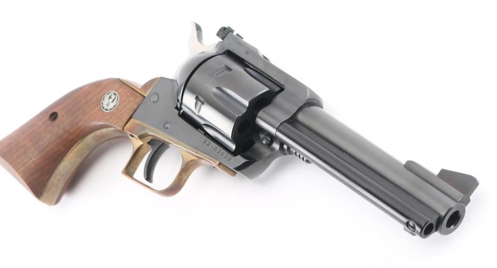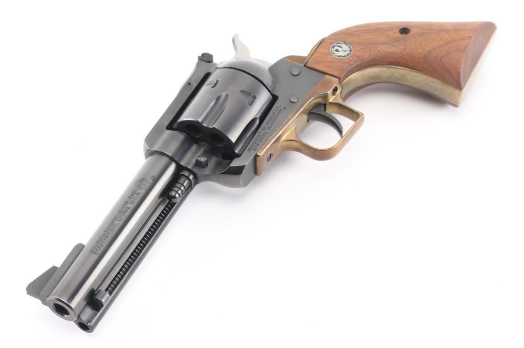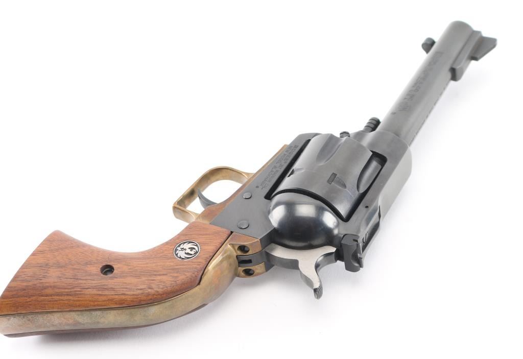Single action revolver with 4.62" barrel, blued finish, ramp front sight, notch rear sight adjustable for windage, serrated hammer spur, smooth trigger, brass grip module with smooth wood Ruger grips. Finish is very good, cylinder has scratches. **NRA Very Good** Modern Firearm