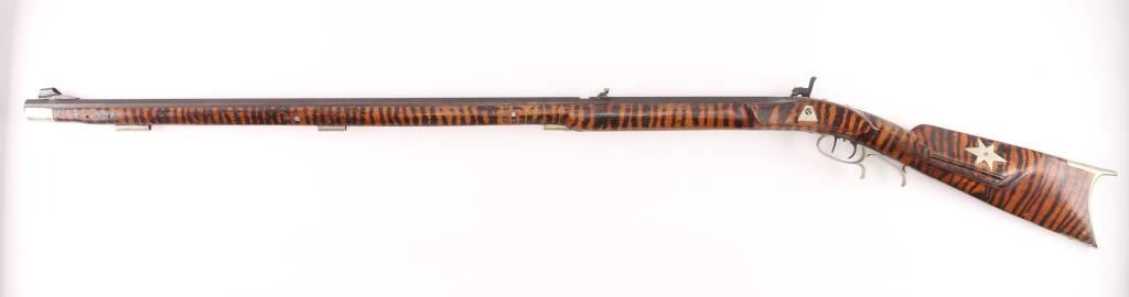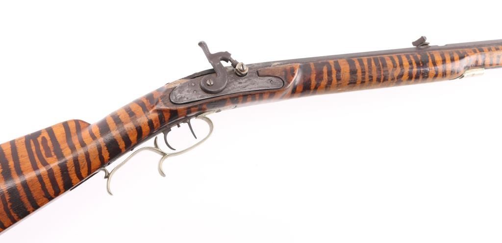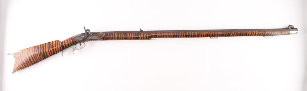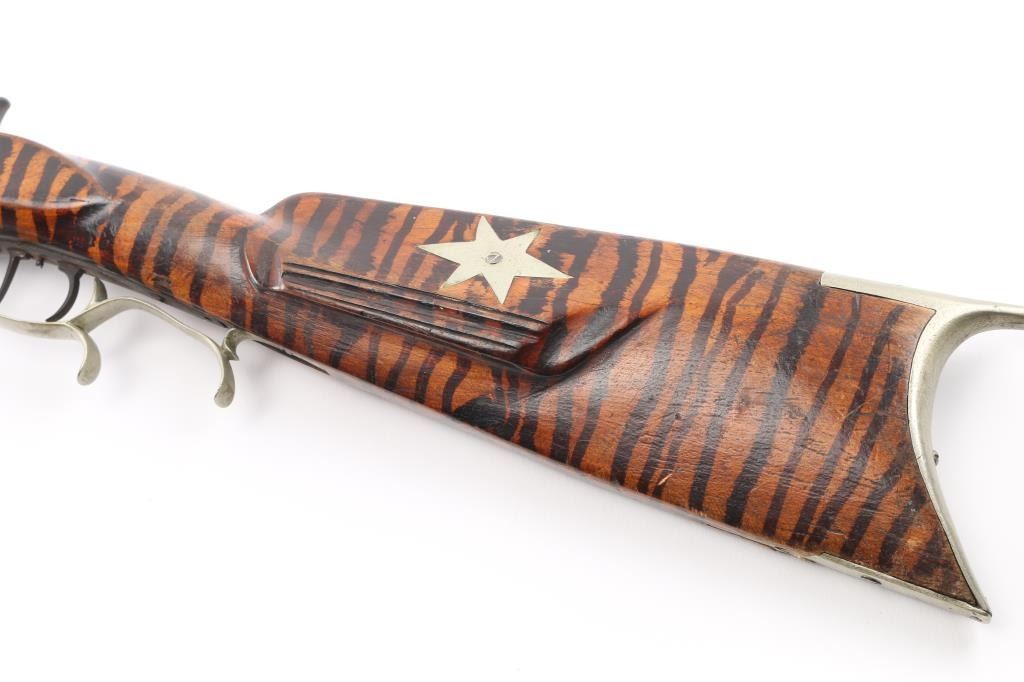 Percussion Kentucky rifle. Original parts mixed with newer parts, Barrel & lock/hammer & fittings appear to be original. 40" octagonal barrel with hooded front bead and u-notch rear sights, approx. .36 cal., double set triggers, nickel crescent butt plate, triggerguard, cap, and ramrod fittings. Full length stock has been striped with what appears to be a sharpie .Tang is braised with brass to the barrel, there is a 3" chip out of the stock between the right tang and lock. missing ramrod, Nickel 6 pointed star inletted in left cheek piece, rear of lock has feint scene of water fowl. NRA Condition-Poor. Antique Firearm.