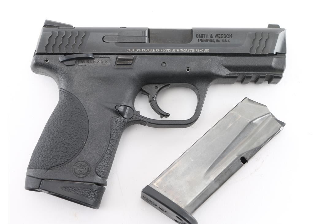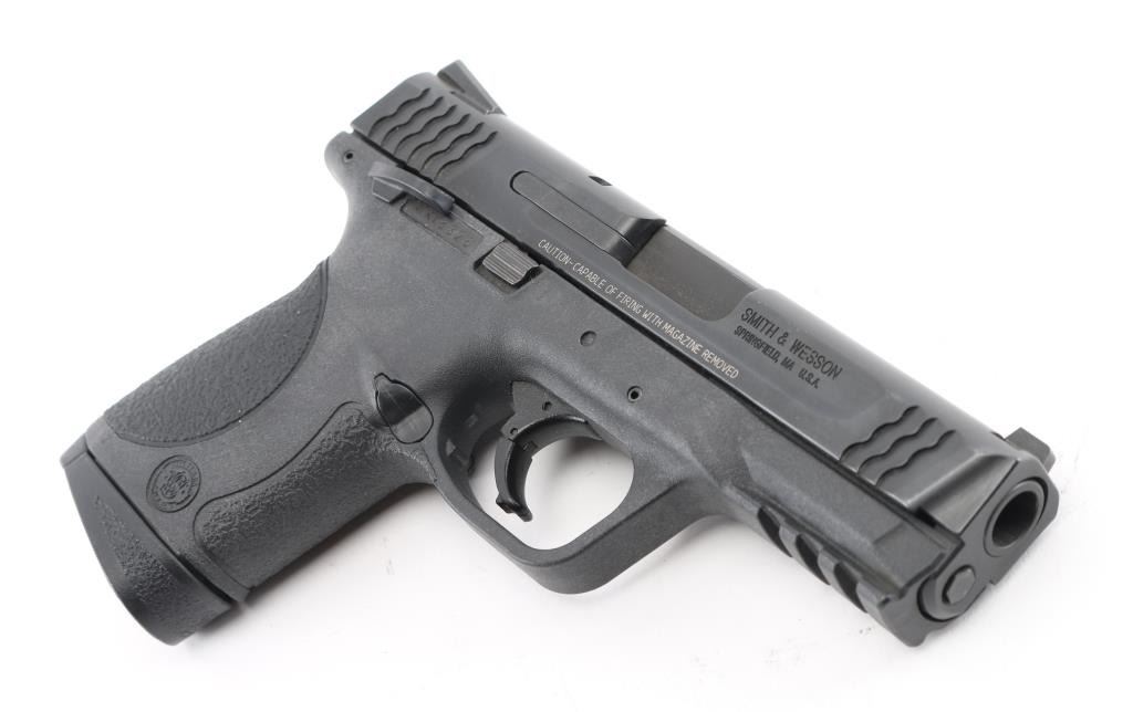 American made compact semi-automatic pistol, DA, thumb safety. striker-fired, short recoil operated, locked breech, the pistol frame is made out of Zytel polymer reinforced with a stainless steel chassis, approximately 4" barrel, the slide and barrel are made of stainless steel that after hardening is treated with a proprietary nitriding process called Melonite, a process that produces a matte gray non-glare surface with a 68 Rockwell C surface hardness rating, features a low slide profile which holds the barrel axis close to the shooter's hand and makes the M&P more comfortable to shoot by reducing muzzle rise and allowing faster aim recovery in rapid shooting sequence, front and rear serrations,, the slide has four contact points with the frame, done to make the rail system self cleaning, by leaving room for any dirt or small foreign objects to fall out of the weapon. standard iron sights are of the three dot type and made of steel, an integrated Picatinny rail can be found underneath the slide on the front of the frame, 8-round magazine. Includes the original plastic case with an extra magazine. **NRA Near Perfect** Modern Firearm
