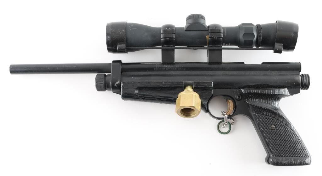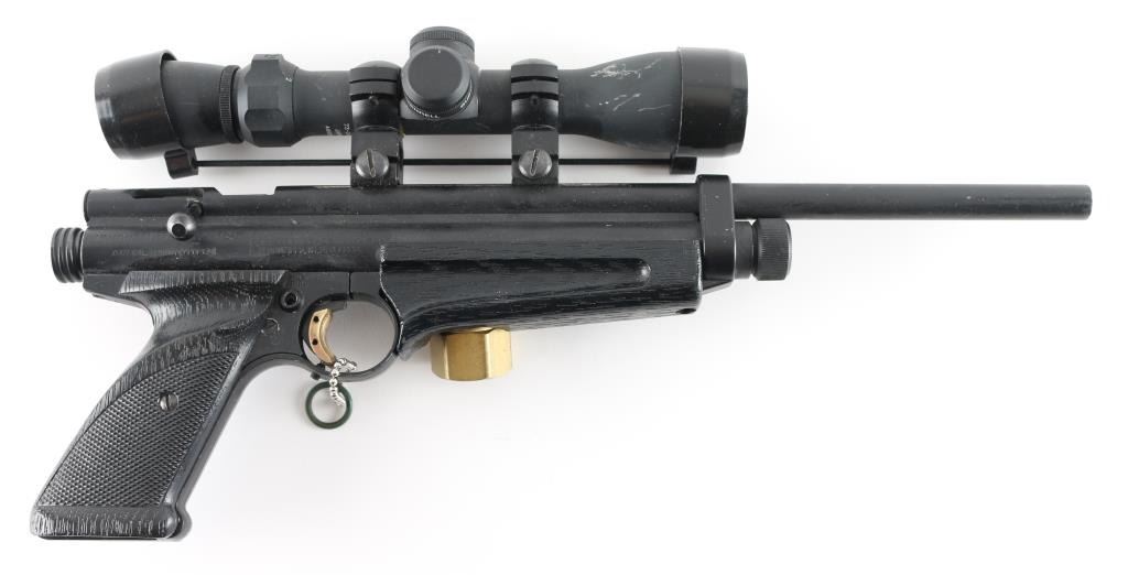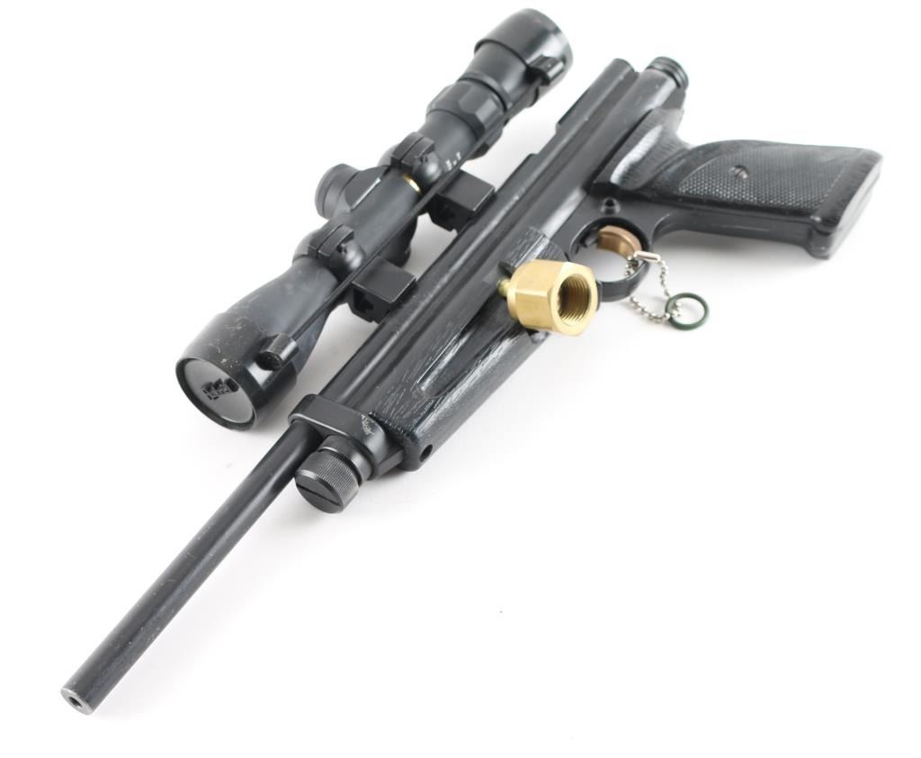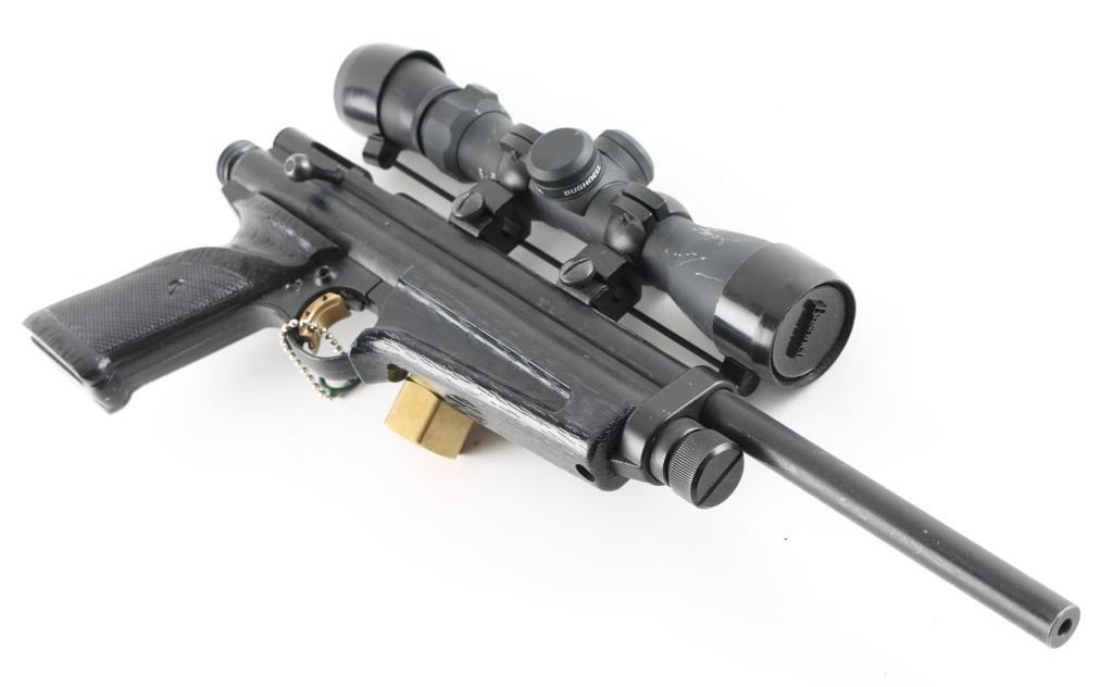Includes a "Bushnell high zoom rifle scope. Manufactured by the Crosman Corporation in the USA from 1989 -1995.Featuring dual power settings. The pistol uses a standard single CO2 bulb. The power is set by pulling the cocking bolt either one click or two clicks the first click sets lower setting the second click for the higher power setting. This particular model features .177 calibre, .20 calibre and .22 calibre barrels and is complete with the correct calibre inserts for the swing out loading port.It is in good overall condition showing minor wear to the finish.It has its correct open sights the rear sight blade is adjustable for a peep sight if using a shoulder stock or notch if using as a pistol. The pistol cocks and fires with no issues. Non-Gun