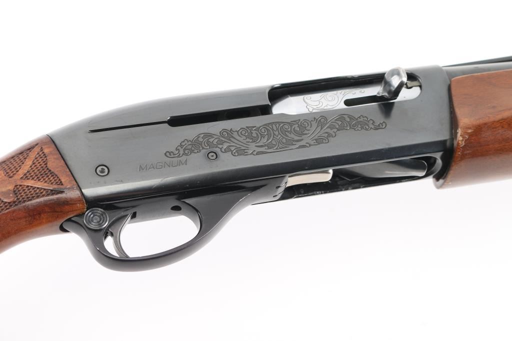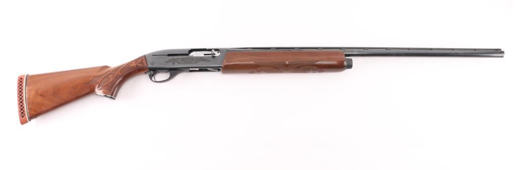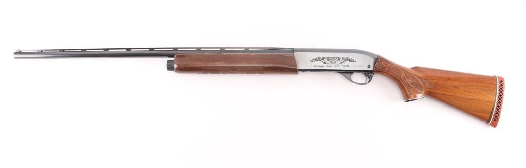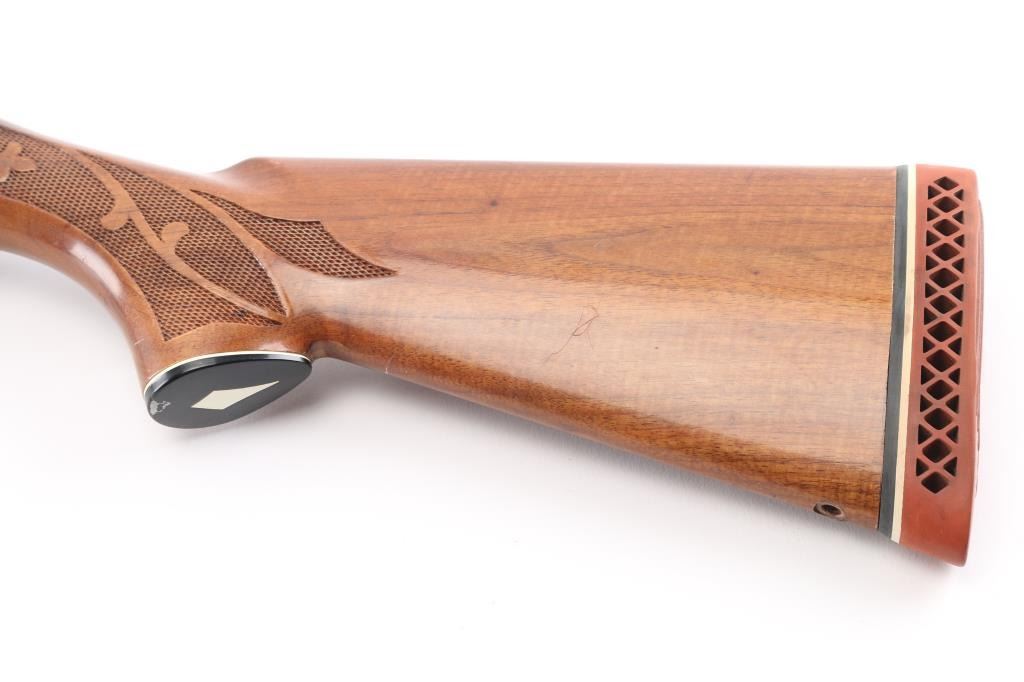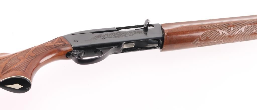 American made light weight gas operated semi-automatic shotgun chambered for 3" 20 gauge shells. Features a blued finish, 28" vent rib barrel, half-length tube magazine, barrel marked "Mod", steel bead front sight, simple roll-stamp engraved floral scroll on the receiver & bolt, smooth trigger with beveled edges, alloy triggerguard, serrated charging handle, push button safety, steel receiver, fancy press checkered walnut forend with high gloss finish, and pistol grip shoulder stock with grip cap & white Line recoil pad. LOP is 13.50". Bore is excellent/bright. Blue finish is about 98% with some minor scratches. wood is very good with minor scratches/dings, and some chips to the butt stock where the recoil pad was installed. Condition is NRA Very Good. Modern Firearm.