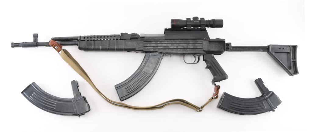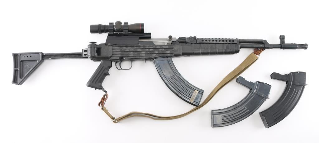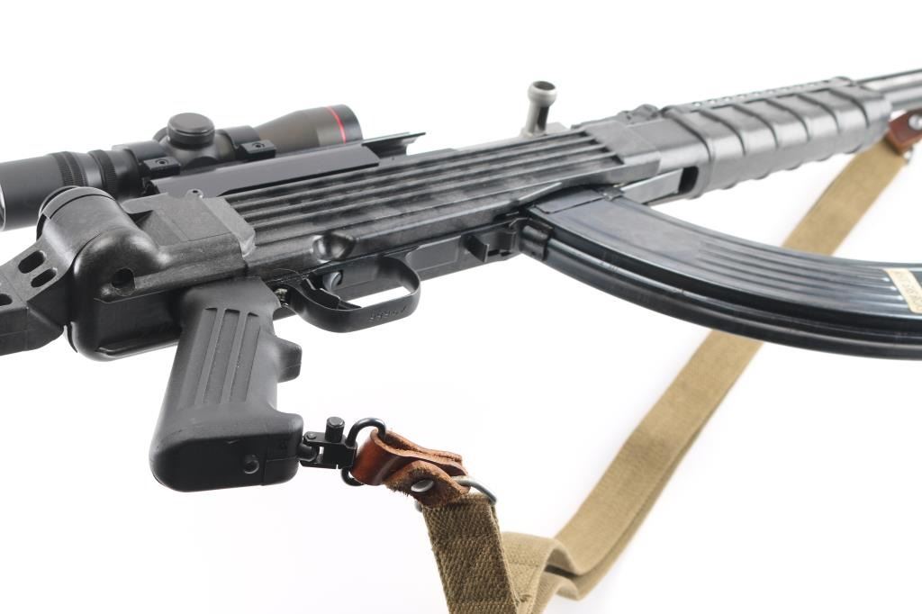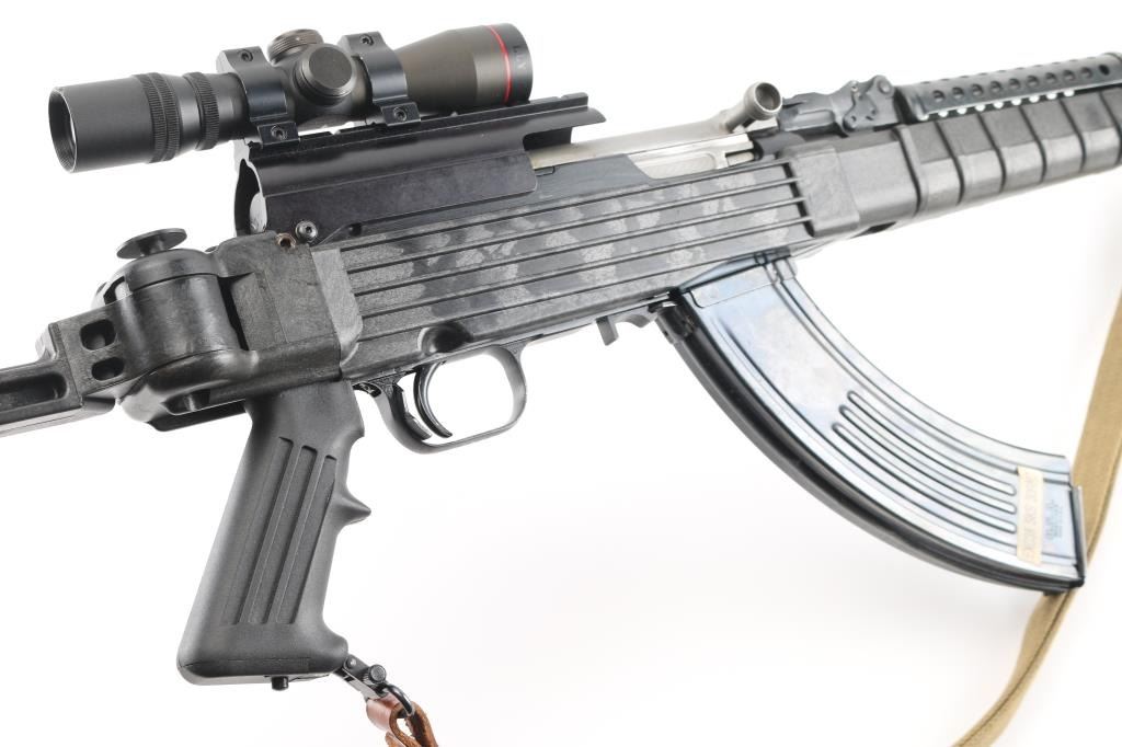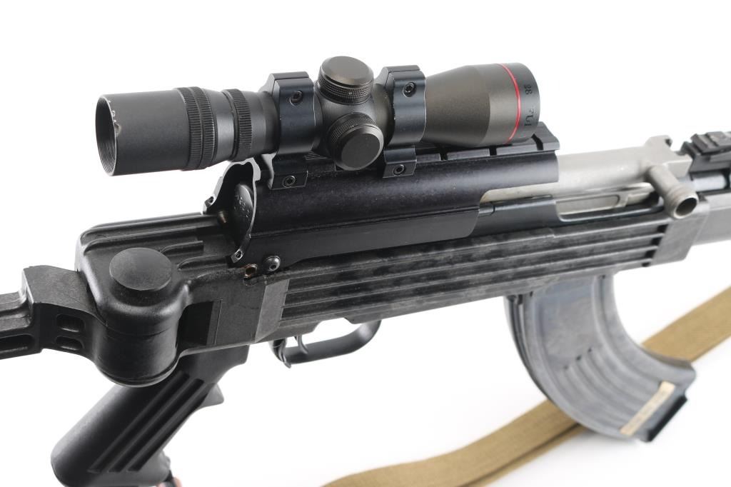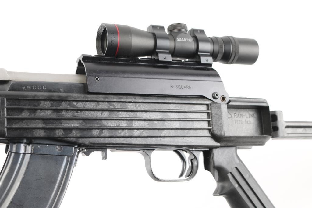 Semi-automatic SKS pattern rifle manufactured in China at Factory 26 (Jianshe Arsenal) with some modifications. This is the short-barreled Paratrooper carbine model. bayonet lug removed. no cleaning rod. Modified mag catch. B-Square scope mount on the side of the receiver. mounted with a Simmons SKS762 4x28 scope, clear optics16.5" barrel, with muzzle break, A-2 type flash hider attached, hooded , elevation adjustable front sight post, with rear sight removed. Blued metal finish, with Ram-Line black synthetic, pistol grip stock, with side-folding rear stock. Steel ventilated handguard. 30-rd, detachable magazine. Action is smooth/tight. Blued metal finish is about 97%, with some small scratches/rubs. Bore appears excellent/bright. Mismatched serial number on the triggerguard. Handguard is loose. Chinese green nylon sling attached. Comes with two 30-rd magazine.7 NRA Condition-Very Good. Modern Firearm.