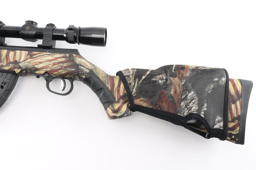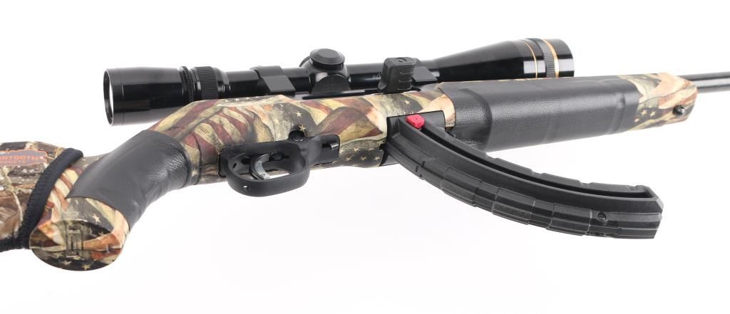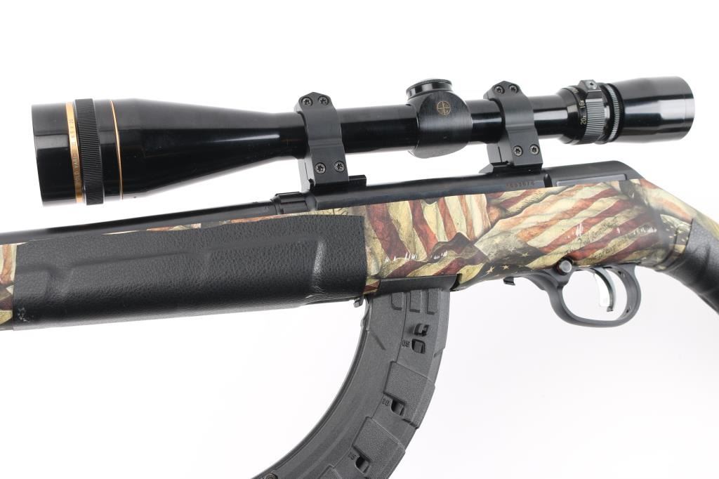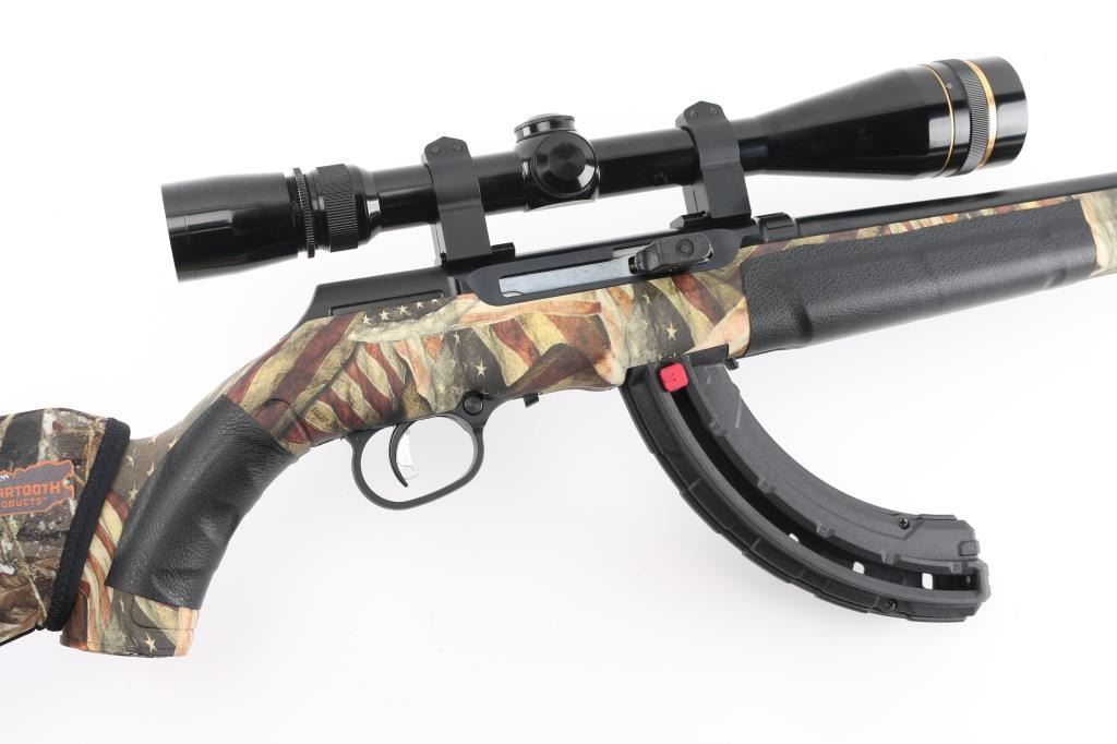 Canadian made Blued semi-automatic rimfire rifle in 17 HMR. Features 21 inch barrel, synthetic stock with American flags, the Constitution, and 2nd Amendment , factory rubber recoil pad, detachable magazine, studs for sling swivels, push button safety. Mounted with a Leupold Vari-X III 6.5x20, clear optics. Bore appears excellent/bright, Blue finish is about 99%. Stock is excellent. Someone has added a leather like material to the grip, and forearm, and a nylon camo detachable high comb on the butt stock. Action is smooth/tight. NRA Condition-Very Good+. Modern Firearm.