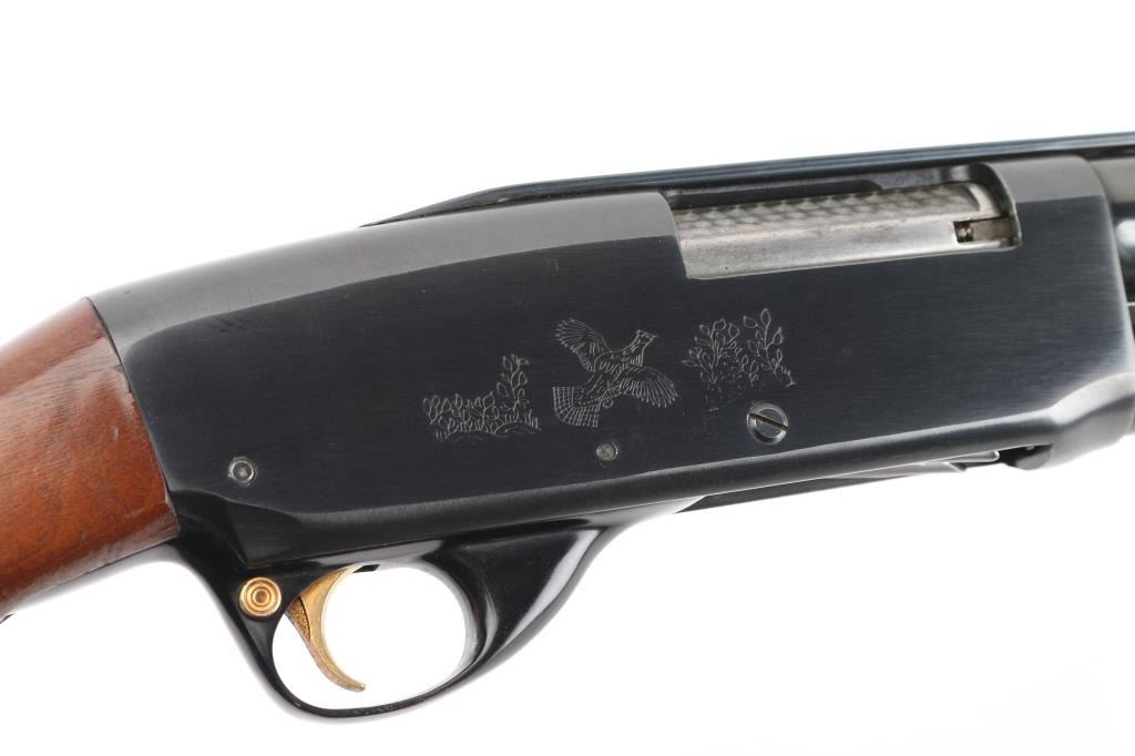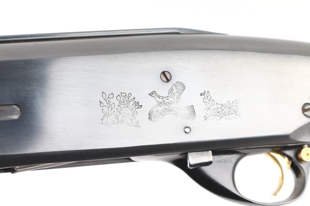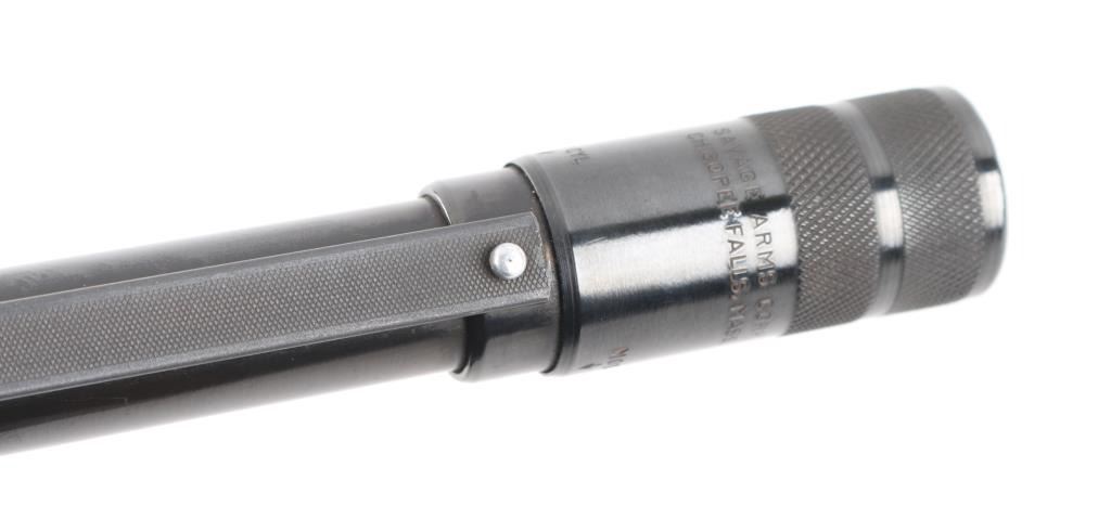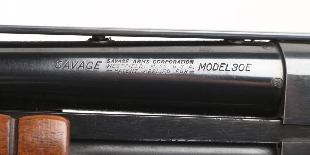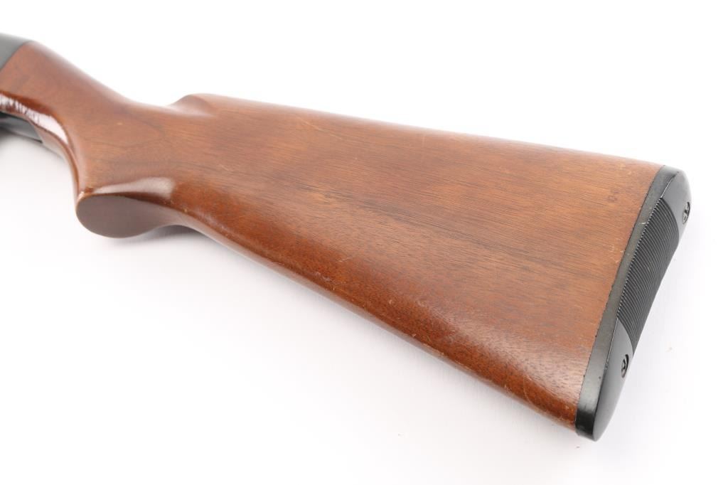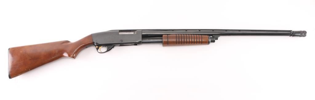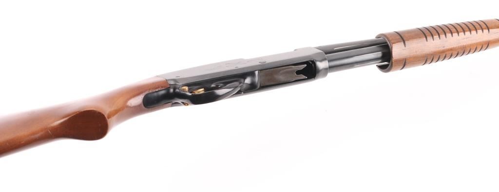 American made slide action repeating shotgun chambered for 2 3/4" shells, manufactured circa 1958-1970. Features a blued finish, 24" barrel with ventilated sighting rib & Savage poly choke, steel bead front sight, steel bead mid-sight, half-length magazine tube, single slide arm, jeweled bolt, smooth trigger with beveled edges, alloy trigger guard with push button safety, steel receiver with simple roll-stamped bird scenes, grooved wood slide handle and smooth wood pistol grip shoulder stock with serrated plastic butt plate. Gold color accents at trigger & safety. Bore is very good condition. Retains over 90% finish with handling marks and edge losses, rub marks from moving parts. Wood is very good with scrapes and small dents. Condition is NRA Very Good++ *** C&R Firearm ***