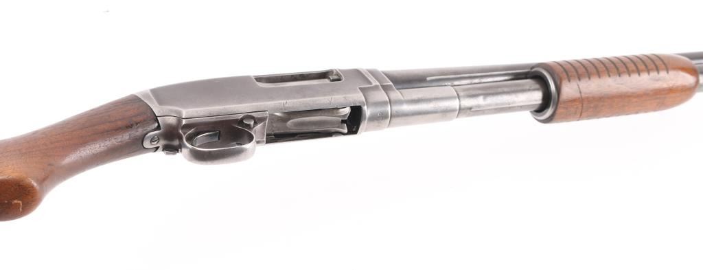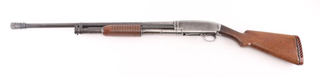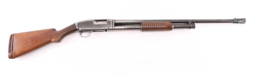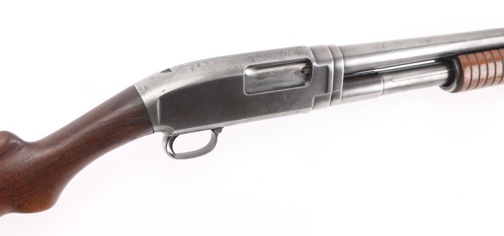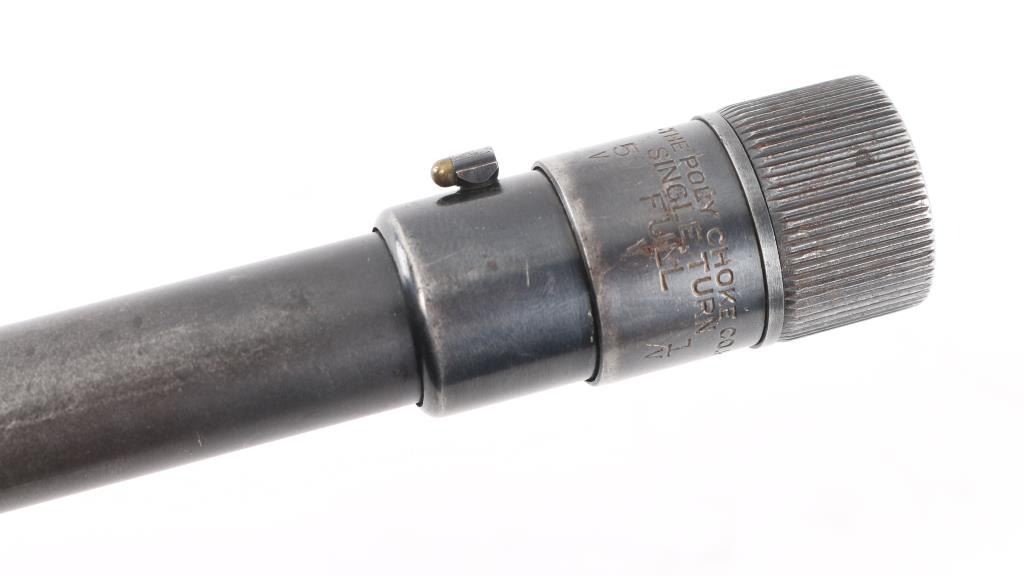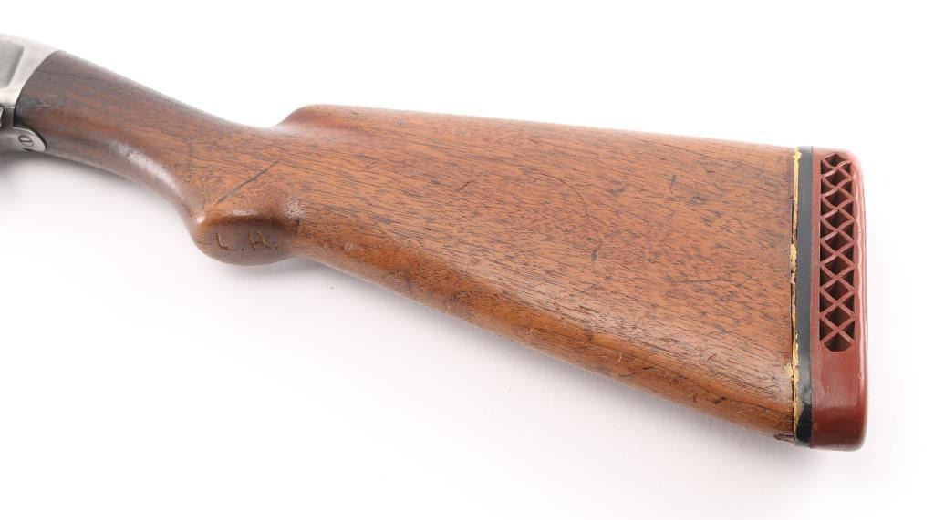 Take down pump action shotgun manufactured circa 1912, first year of production. Features 24" plain barrel, barrel marked "FULL" choke, brass front bead, Poly Choke adjustable choke attached to muzzle, blued finish, wood stock & pump handle, Pachmayr recoil pad has been been attached to the butt, push button safety. Bore is very good condition. Retains 20% finish with large bare metal areas, patina spots on receiver sides, some darker bluing on barrel, light pits in several places. Someone has scratched "BFC' on the left receiver, very feint, not really noticeable. Wood is good condition with scratches, scrapes. Someone has carved "L.R." on the bottom of the grip. Numbers match on receiver & extension. (Feint) LOP is 13 1/2". Condition is NRA Fair++. C&R Firearm.