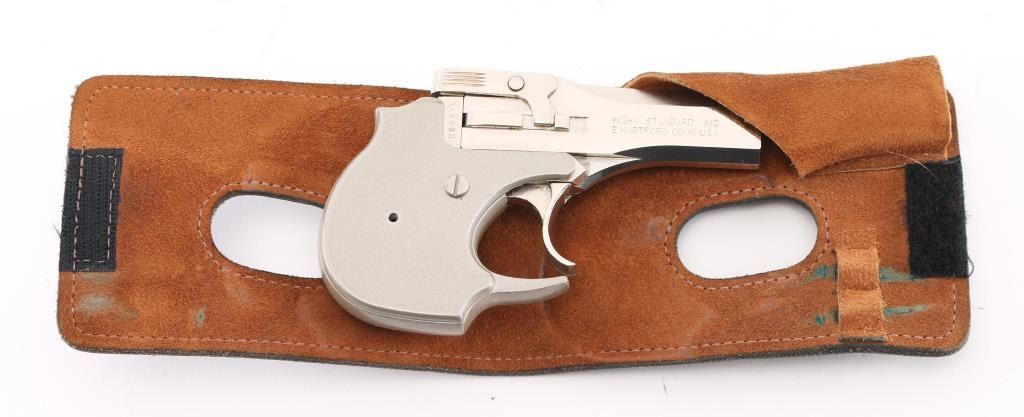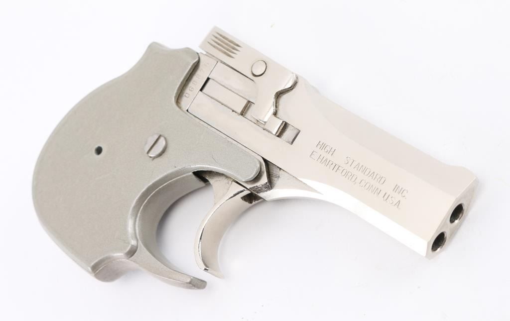 Made in America this is a .22 Magnum, tip up, double barrel derringer from High Standard. It has a machined front sight and notch rear, smooth, open trigger and no grip panels. Comes with a pocket holster that does not cover the trigger so you can shoot yourself in the leg. Metal finish looks good. Bore looks a little dirty. Condition is NRA Good *Modern Firearm*