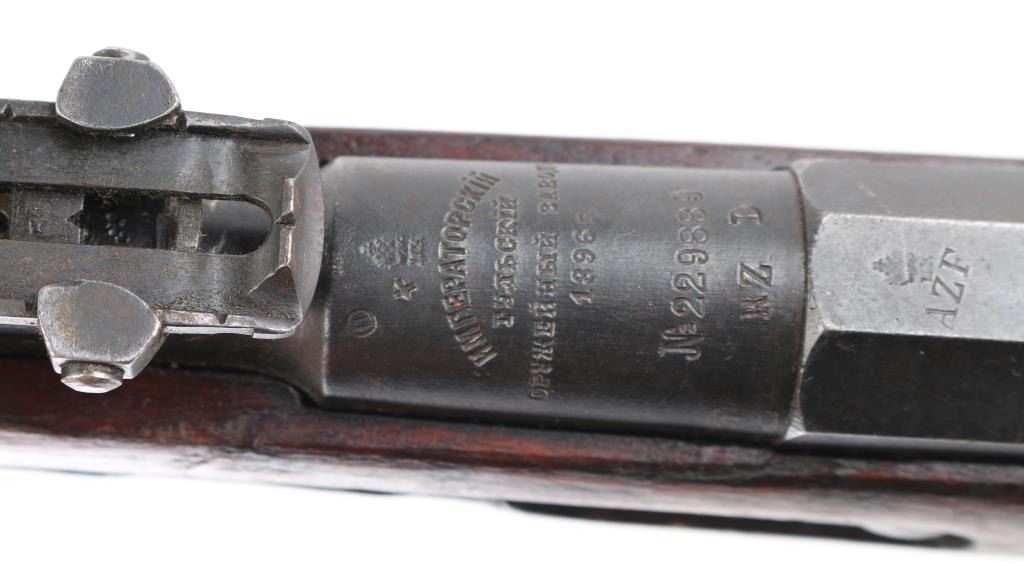 SN: 229889. Imperial Russian M91 Mosin-Nagant long rifle dated 1896. This is rifle captured by Austro-Hungarian forces in early WW1. It has the Austrian arsenal "AZF" stamp on the chamber. It appears this rifle stayed it its original configuration, as tens of thousands of these were converted to 8x50mm, no "A" or "W" stamped on the stock. No import marks, matching serial numbers on chamber, bolt, & magazine. 31 1/2" barrel with blade front & 'Konovalow' style rear sights, cleaning rod. Bore is fair, dark/rough, with rifling present, action is crisp, wood is sound/good with many scratches/dent. A scarce rifle. NRA Condition-Very Good. Antique Firearm.