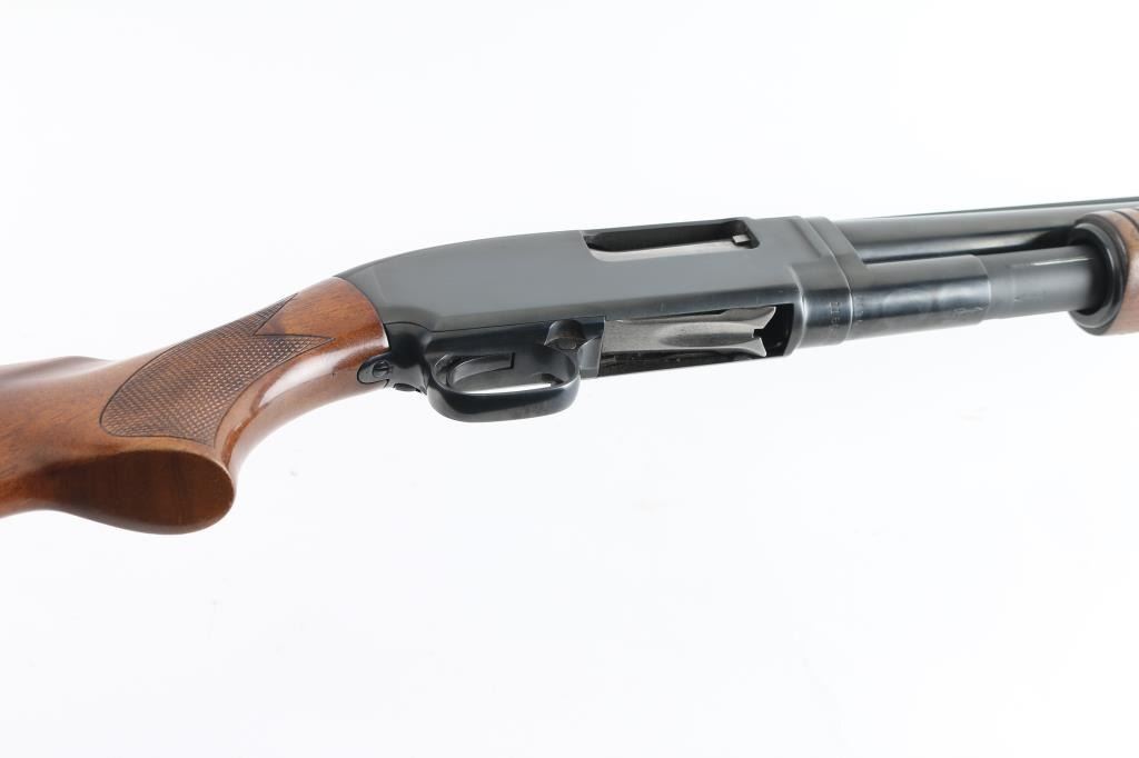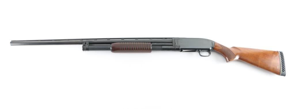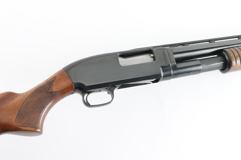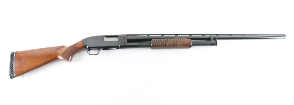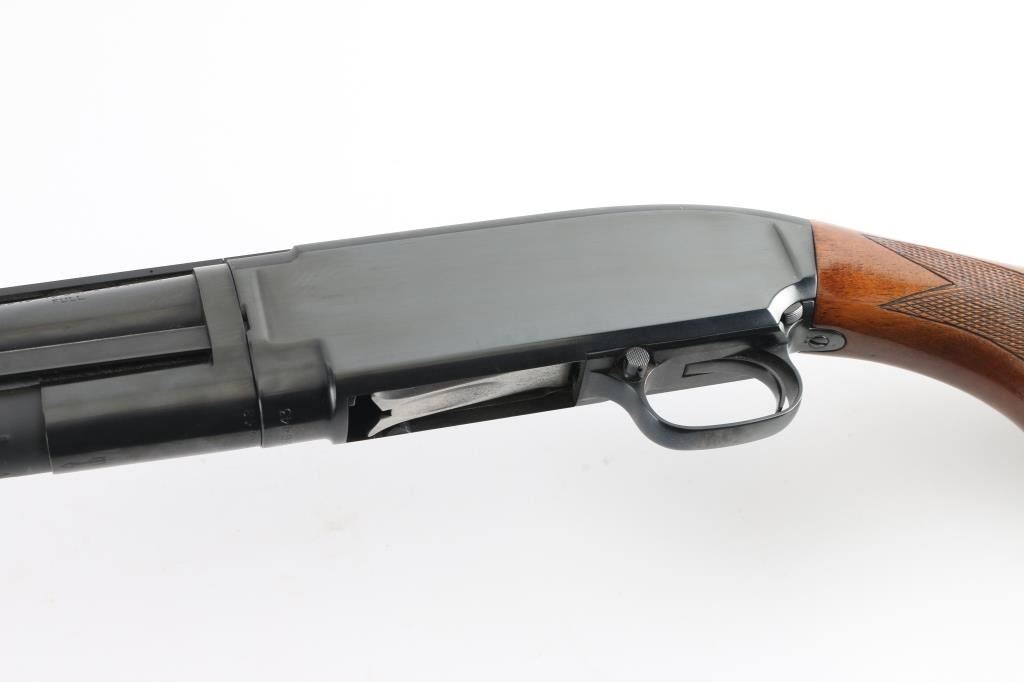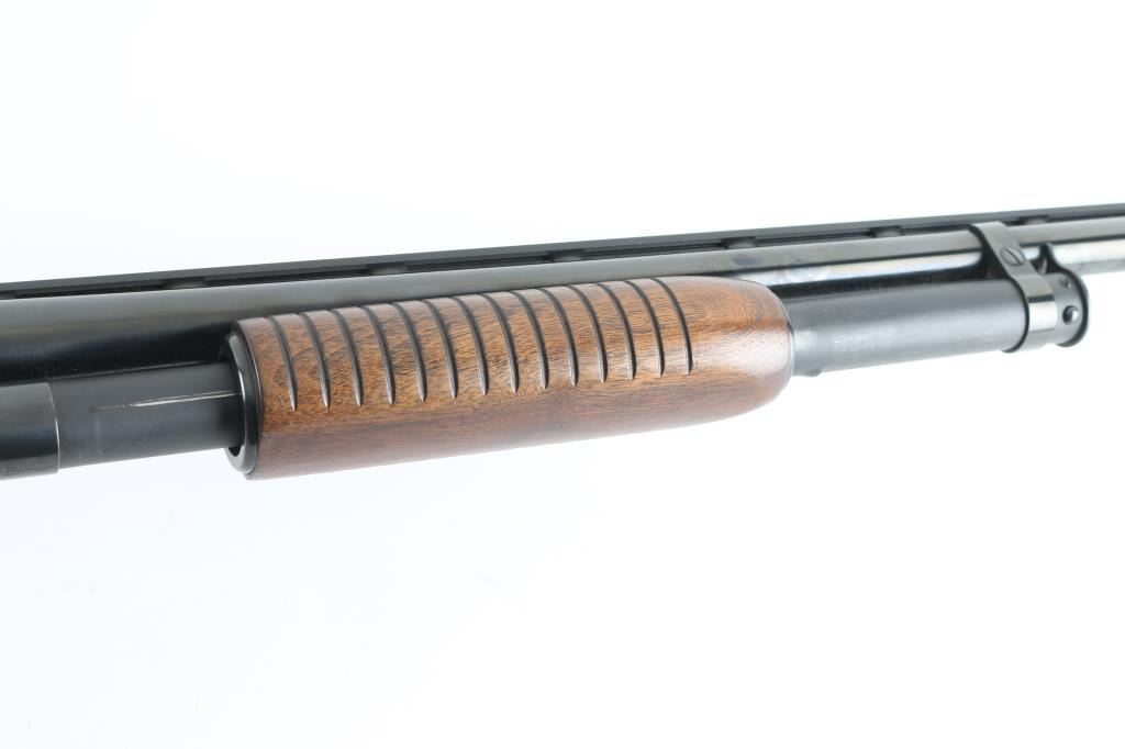 Take down pump action shotgun manufactured circa 1948. Features 30" vent rib barrel, barrel marked "FULL" choke & "2-3/4", red fiber optic front bead, blued finish, checkered walnut shoulder stock, grooved walnut pump handle, ventilated rubber recoil pad, manual safety. Bore is very good condition. Retains 95% re-blued finish, some edge losses and small scratches, rub wear from pump handle. Wood is very good condition with scratches & dings, some small gouges to left side of butt. Recoil pad fit is a bit off. Numbers match on receiver & extension. Condition is NRA Very Good++ (as reblued) *** C&R Firearm ***