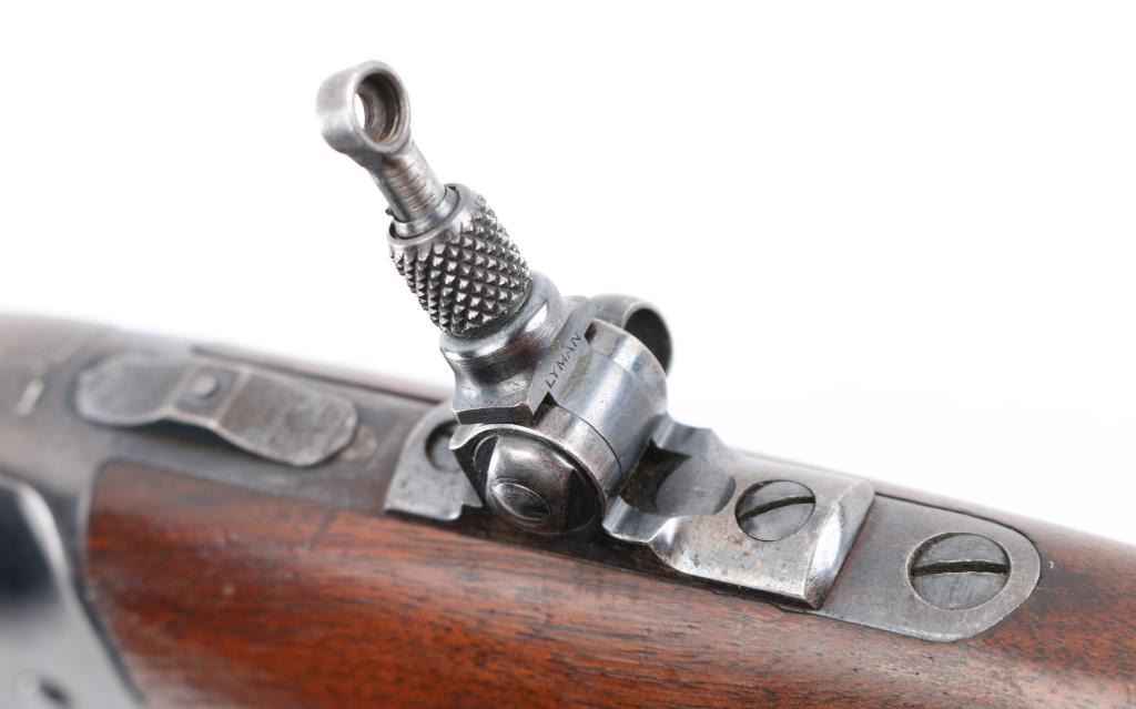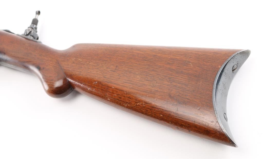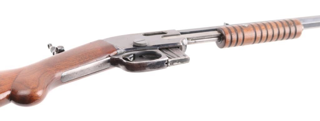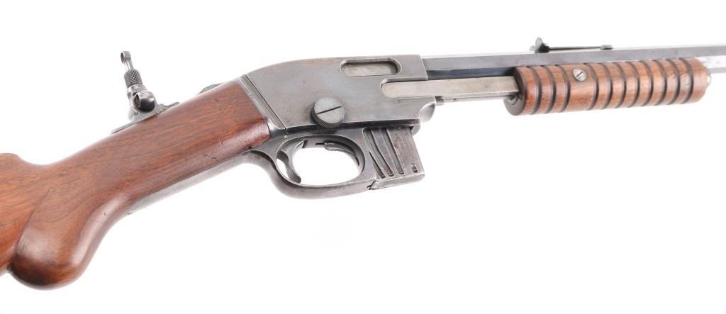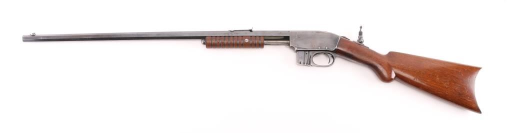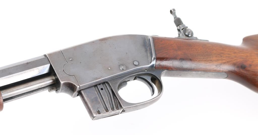 Slide action magazine-fed repeating rifle chambered in .22 caliber, circa 1903-1906. Features a fully blued finish 24" octagonal barrel, flip post/bead front sight, Half the circle around it has broken off, sporting rear sight, take-down receiver, smooth trigger, safety switch on tang, folding tang peep sight, 10 rd savage marked magazine, grooved pump handle, plain rounded pistol grip walnut stock and metal crescent buttplate. blue finish is about 70% with edge wear, handling wear mostly on the receiver.. Markings are good, action is smooth, bore is very good/bright and wood is very good. NRA Condition-.Good. C&R Firearm.
