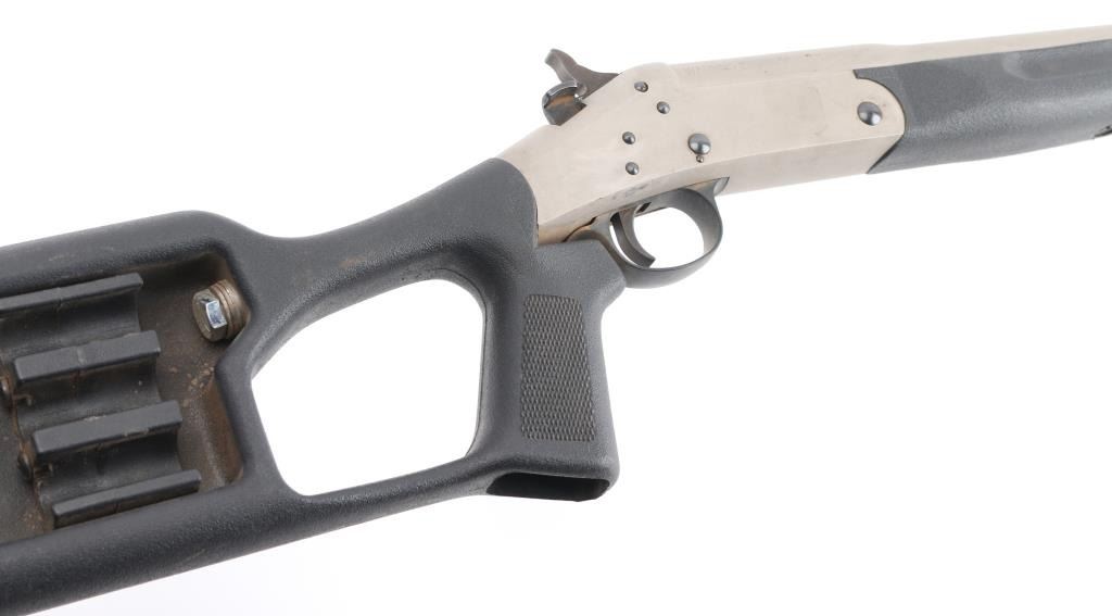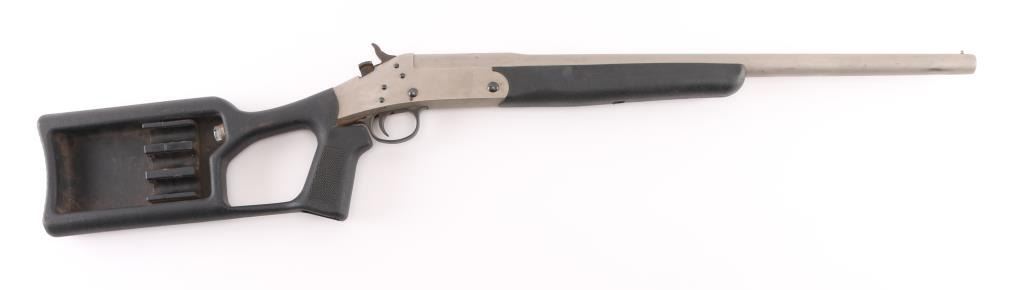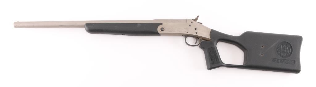 The "Tamer" is a single shot, break action shotgun, chambered for 3" 20 gauge shotshells. It sports a 20" barrel, a matte finish on the barrel and receiver, thumb release to open on the top of receiver on the right of the hammer with serrated spur. It has a smooth trigger and two piece, black synthetic stocks with a place for three extra shotshells on/in the right side of the pistol grip type butt stock. Metal finish looks good but does have a few areas on the barrel and receiver with a little loss of finish. Bore looks very good, a little dusty. Stocks are fine. Choke reads Modified on the barrel. LOP is 12". Condition is NRA Good+. *Modern Firearm.