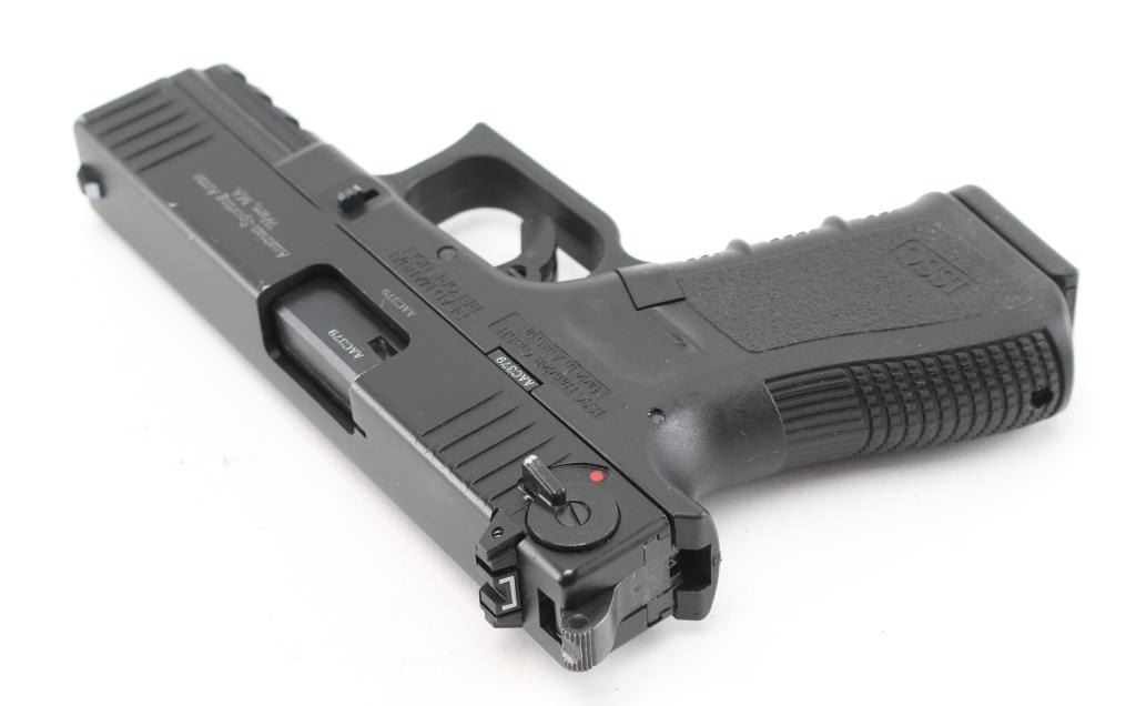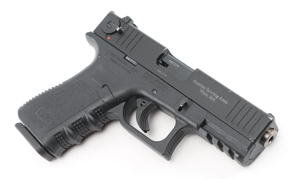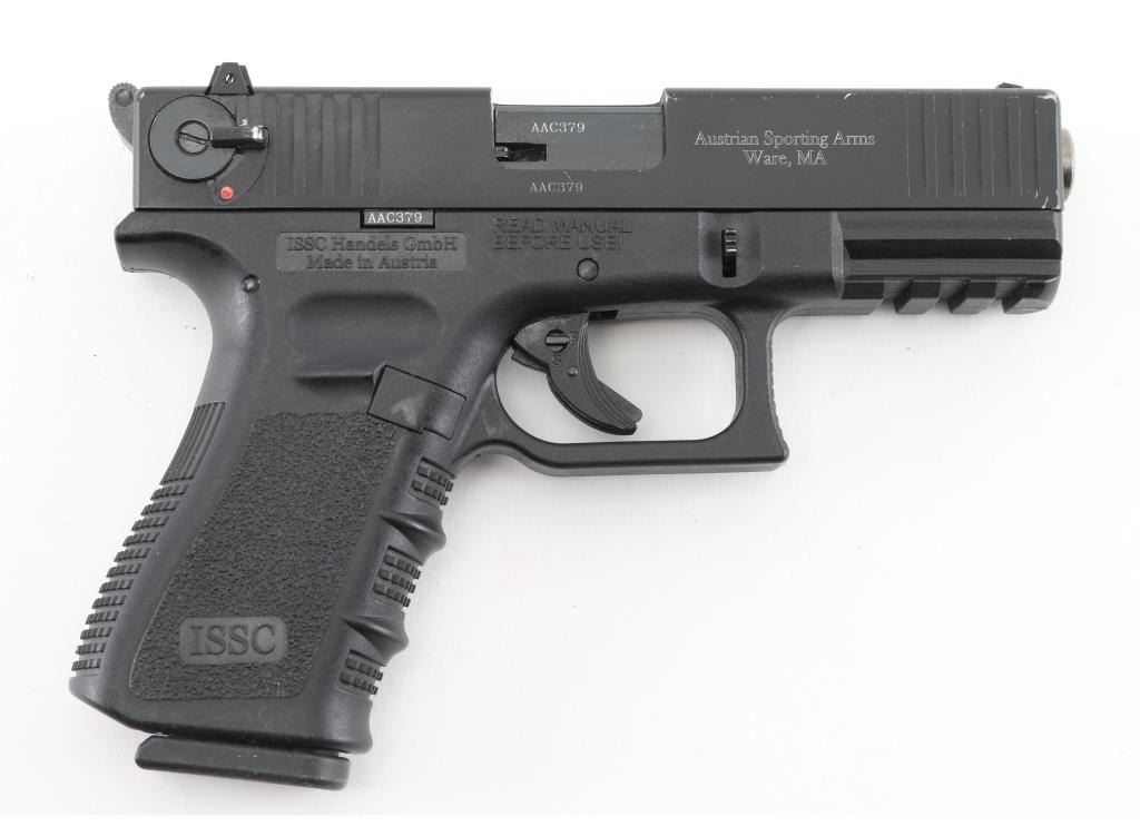 SN: AAC379 Austrian made single action semi-automatic pistol imported by Austrian Sporting Arms, Ware MA. Appears very similar to a Glock pistol, with exception of external hammer and ambidextrous slide mounted decocking safety. Features a matte black finish, 4" heavy barrel, blade front sight with white square, drift adjustable rear window sight with white outline, front & back cocking serration on the slide, serrated round hammer spur, trigger safety with internal locking safety on the trigger, push button magazine release, 10 round magazine and black polymer frame with integral accessory rail & finger groove grip. Bore is pristine. Appears like new with few signs of handling. Includes two magazines, manual, factory hard plastic case. Condition is NRA Excellent - like new *** Modern Firearm ***