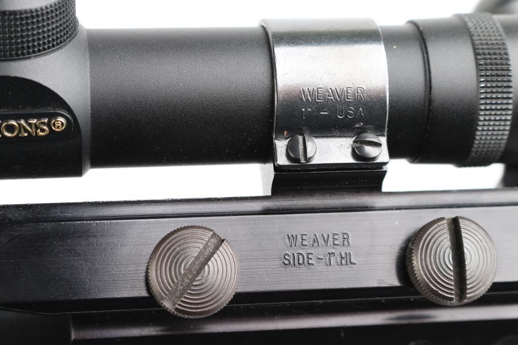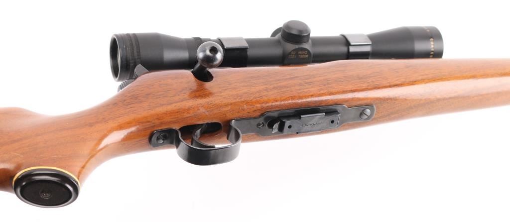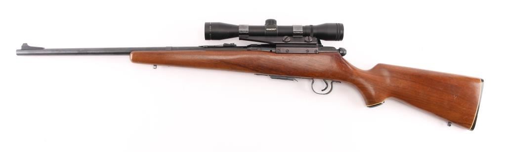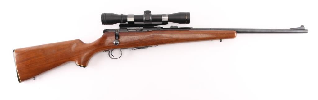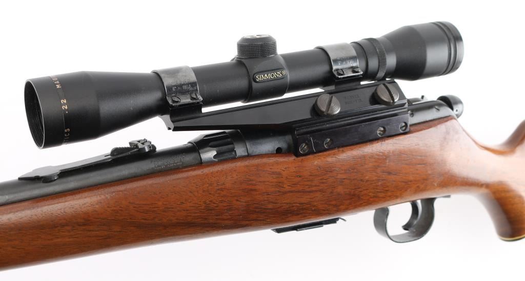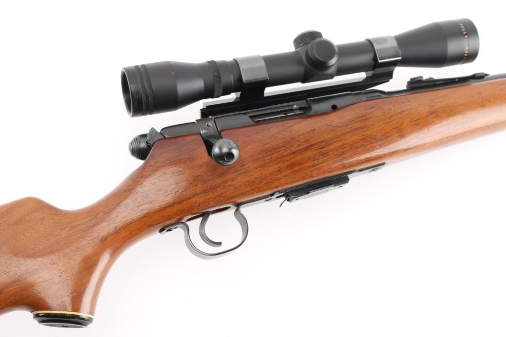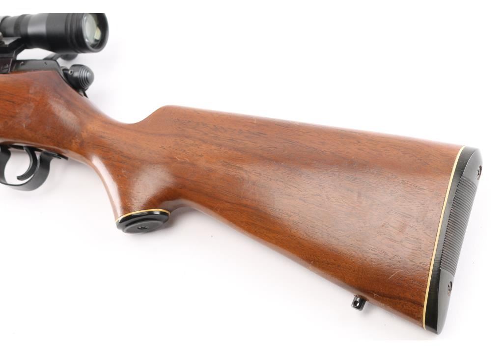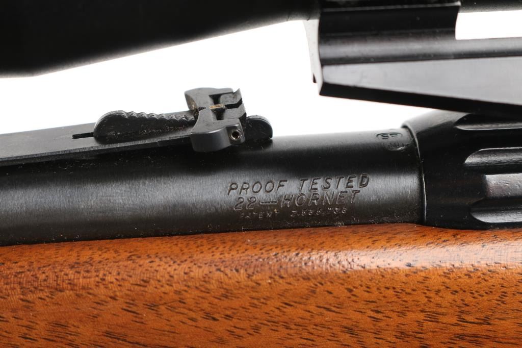 Bolt action rifle. 98% blued finish. One piece smooth wood stock, with sling swivel studs, factory buttplate & grip cap with white spacers 22" barrel. Bore appears excellent/bright, Action is stiff, 5 rd detachable magazine. Mounted with a Simmons .22 Hornet 4x32 scope, clear optics. Side mounted with old Weaver style mounts & rings. Very nice conditioned rifle, with some very minor scratches on the wood, metal. NRA Condition-Near Excellent. Modern Firearm.