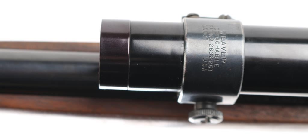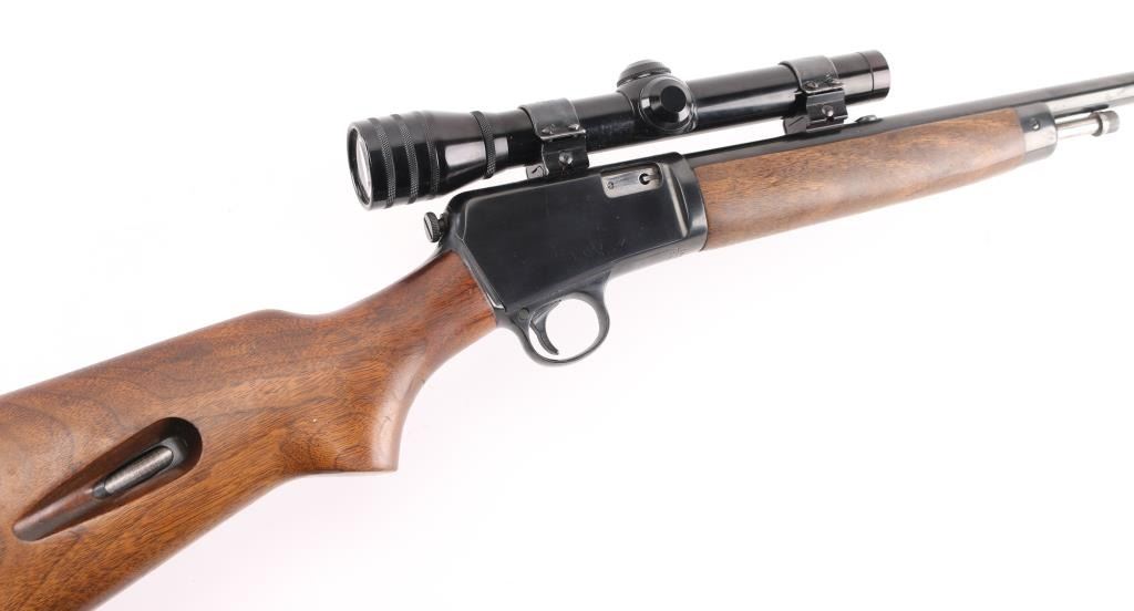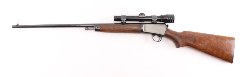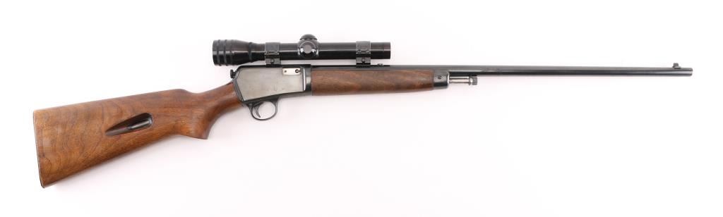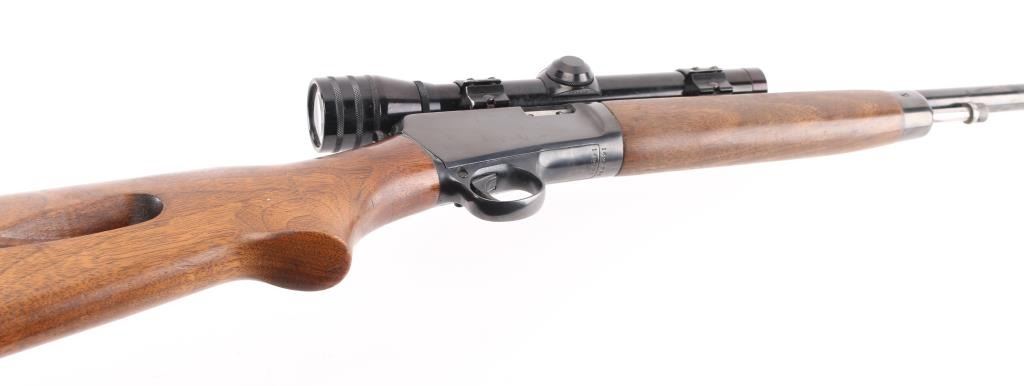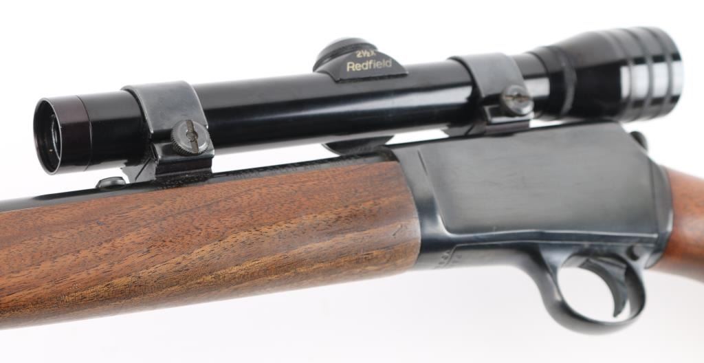 Vintage semiautomatic rimfire rifle manufactured circa 1955. Features reblued finish, wood forend with steel nose cap, wood butt with curved grip, steel buttplate, 23" barrel, dovetailed blade/bead front sight, no rear, insert in dovetail, magazine tube in butt, manual safety, takedown screw at receiver rear. Bore is very good condition. Mounted with a Redfield 2 1/2X scope with Weaver rings, clear optics. Retains 97% re-finish, some scratches/rubs on the barrel. Wood is very good condition overall. Action is smooth. Condition is NRA Very Good+(refinished) C&R Firearm.