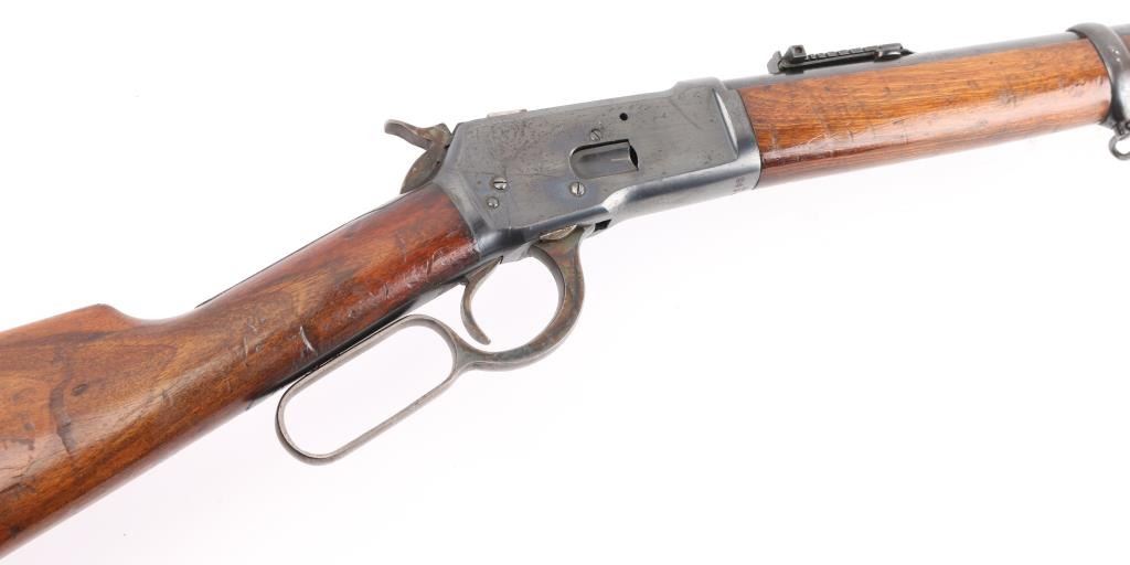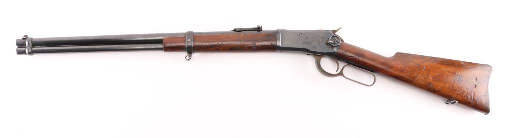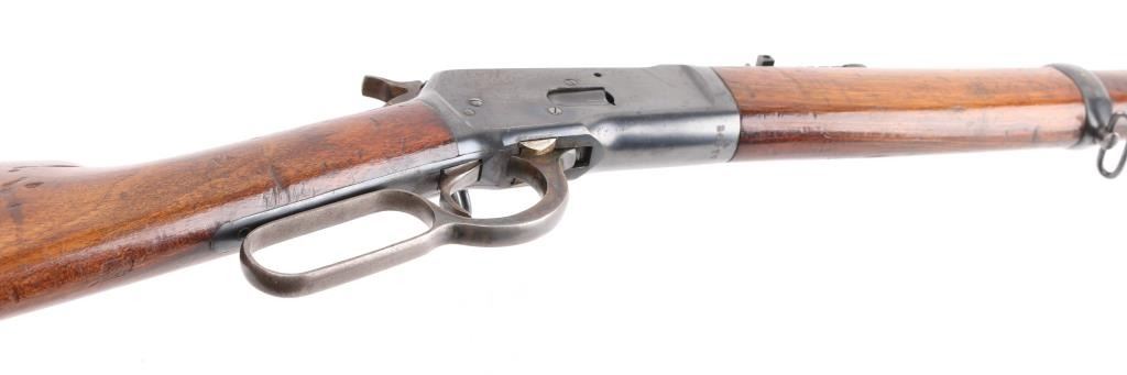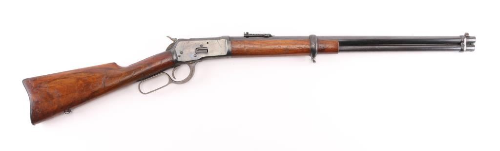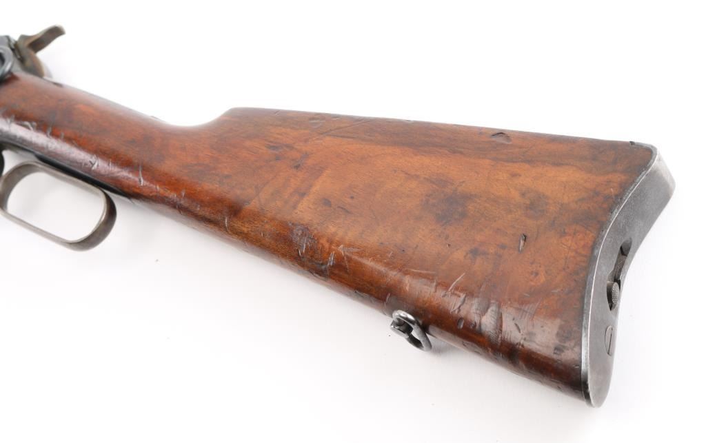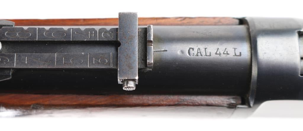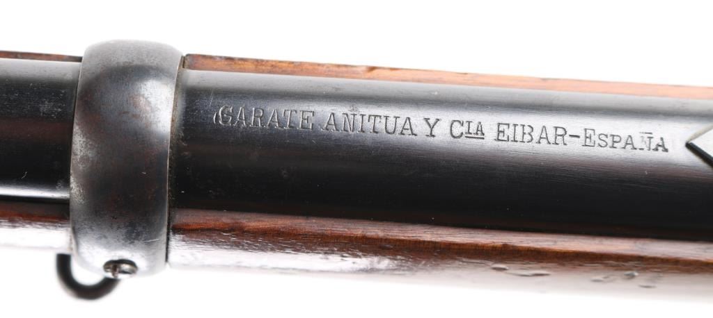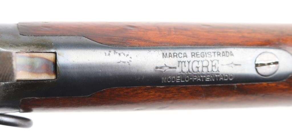 SN: A26307. The Tigre rifle was a Spanish copy of the Winchester Model 1892 lever action saddle ring carbine. Manufactured between 1915 and 1938. Used extensively in the Spanish Civil War, 22" round barrel with tangent leaf sights up to 1000 meters . Front blade. Maker/patent marking on barrel/tang. Barrel marked "CAL 44L. Left receiver stamped "Marca Registrada" with image of Tiger. Steel buttplate with sliding trapdoor. Sling swivels, saddle ring. No import marks. Action is crisp. Bore is excellent/bright. Blued metal finish is about 94% with minor scratches, edge wear. Wood stock/forearm are sound with many scratches/dents. NRA Condition-Near Very Good. C&R Firearm.