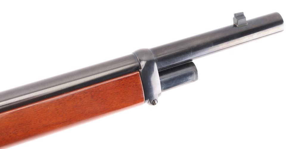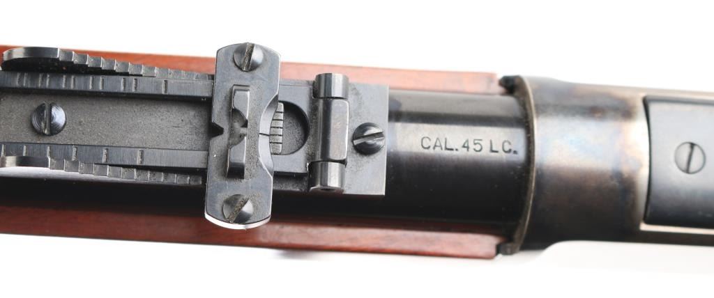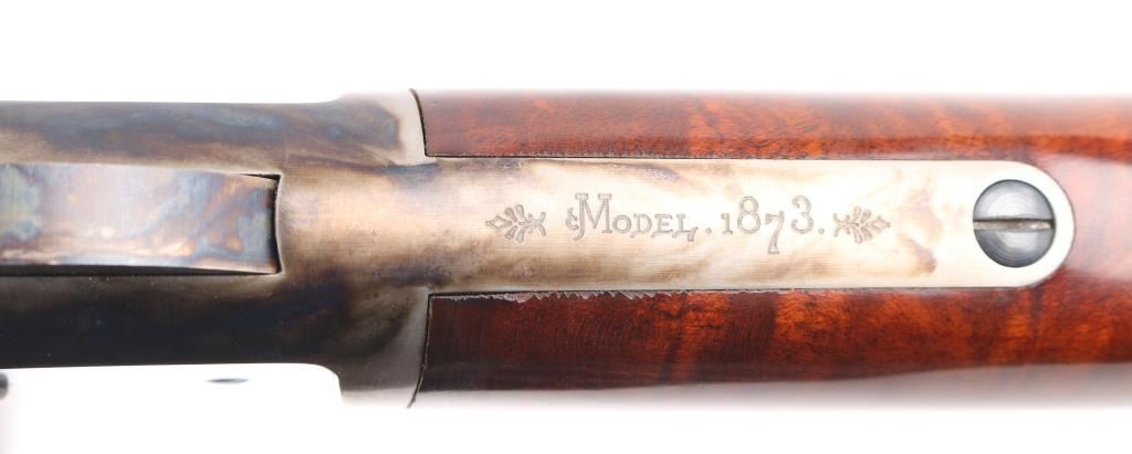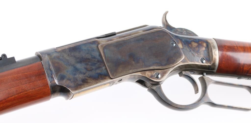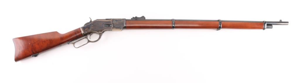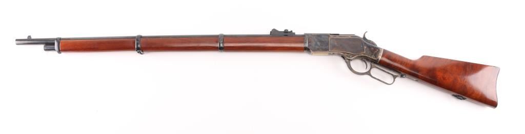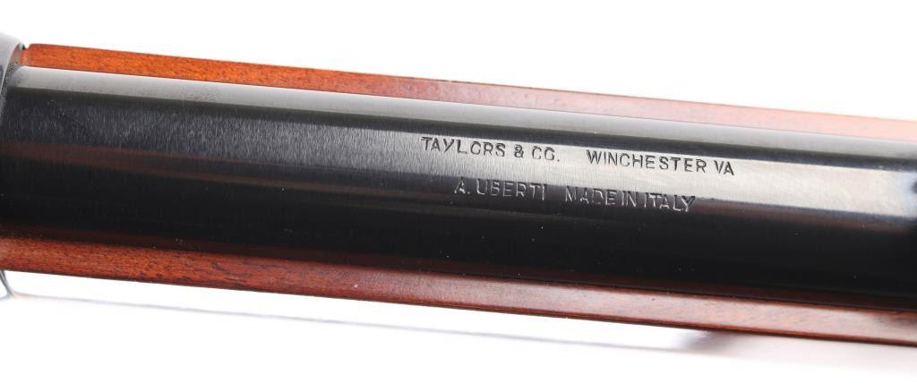 SN: WO3151.Italian made copy of the lever action Winchester Model 1873 musket chambered in 45 long Colt. Made by Uberti, imported by Taylor & Co, VA. Features a blued/case hardened finish, 30" round barrel, dovetailed blade front sight, adjustable ladder/notch rear sight, full length tube magazine, sliding dust cover, smooth trigger, knurled hammer spur, grip safety, lever lock on tang, brass lifter, smooth full length wood stock with metal cap and straight grip shoulder stock with crescent metal buttplate. Receiver & trigger case colors are very good, and the barrel and magazine tube retain approximately 99% of their blued finish. Action is very smooth, bore appears excellent/bright, and the wood stocks are excellent. Rifle little use. NRA Condition-Excellent. Modern Firearm.