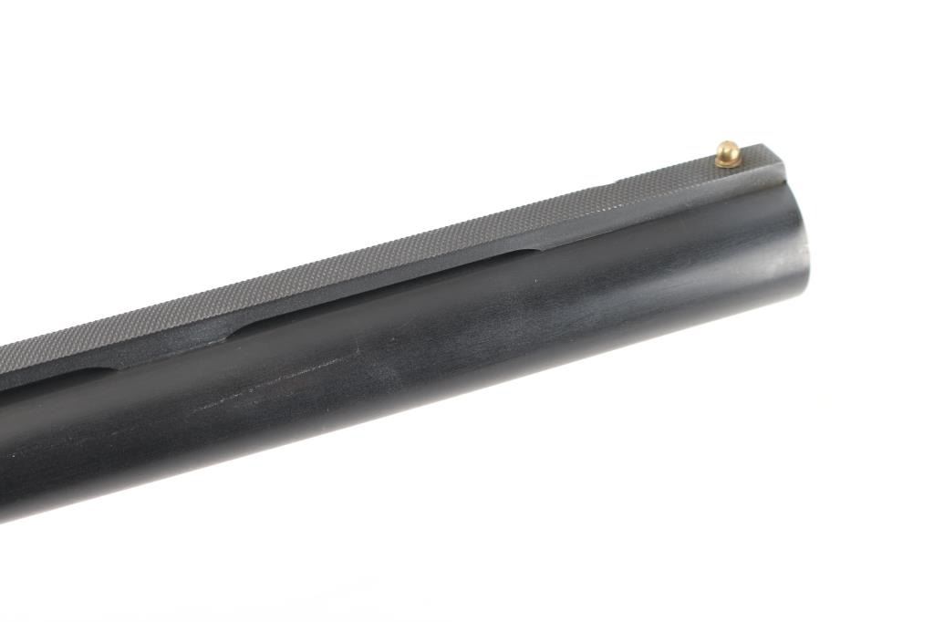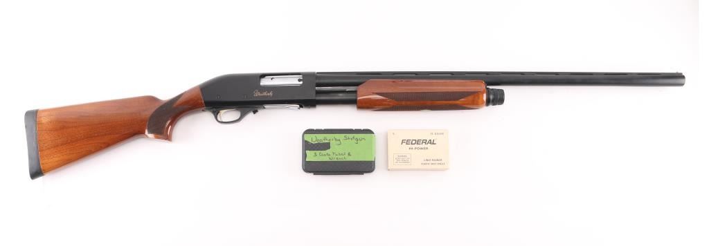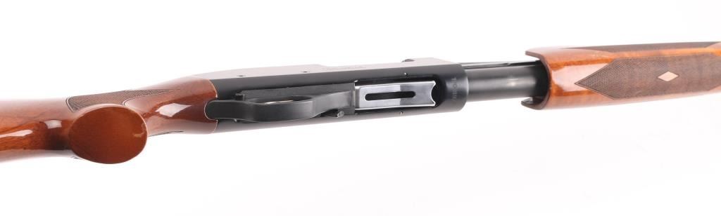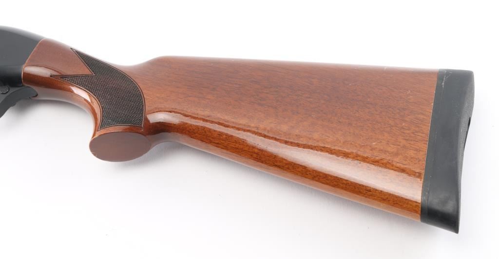 Turkish made slide action repeating shotgun chambered for 12 gauge shells. Features a blued 28" vent rib barrel with 3" chamber & removable IM cylinder choke, half-length tube magazine, smooth gold trigger, push button safety, black finished alloy receiver, checkered high gloss walnut slide handle and pistol grip shoulder stock with factory recoil pad & 14 1/4" LOP. Includes choke tool and modified & full chokes, and a box of five Federal 3" Magnum buck shells. Shotgun exhibits approximately 97%+ of it's original finish with scratches on the receiver Action is smooth, bore is mirror bright and wood stocks are fine. Condition is like NRA Near Excellent. Modern Firearm.