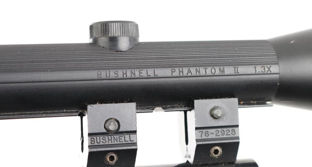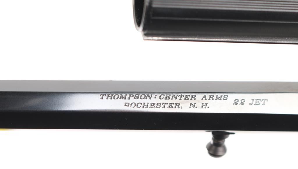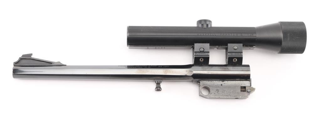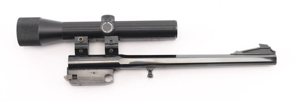 10" octagonal blue Contender barrel, .22 Jet, finish is excellent, bore is excellent/bright. Mounted with a Bushnell Magnum Phantom II 1.3X scope, clear optics, very good condition.