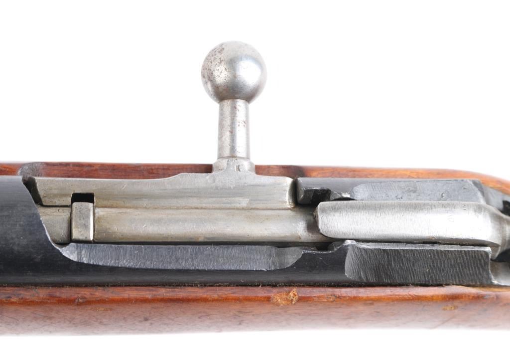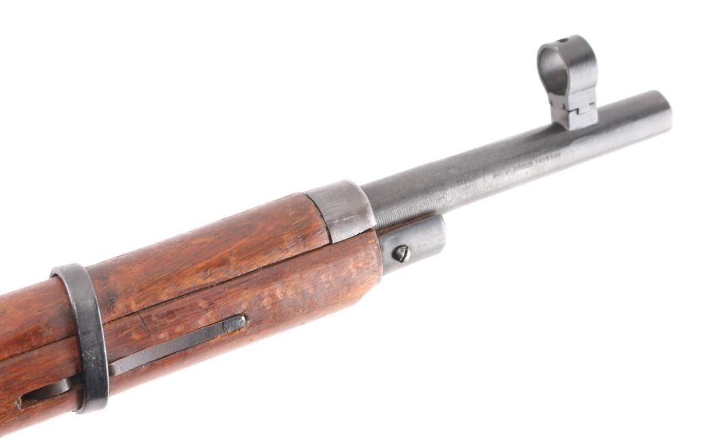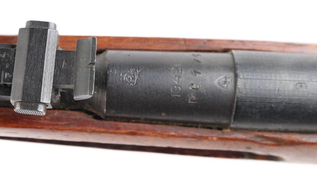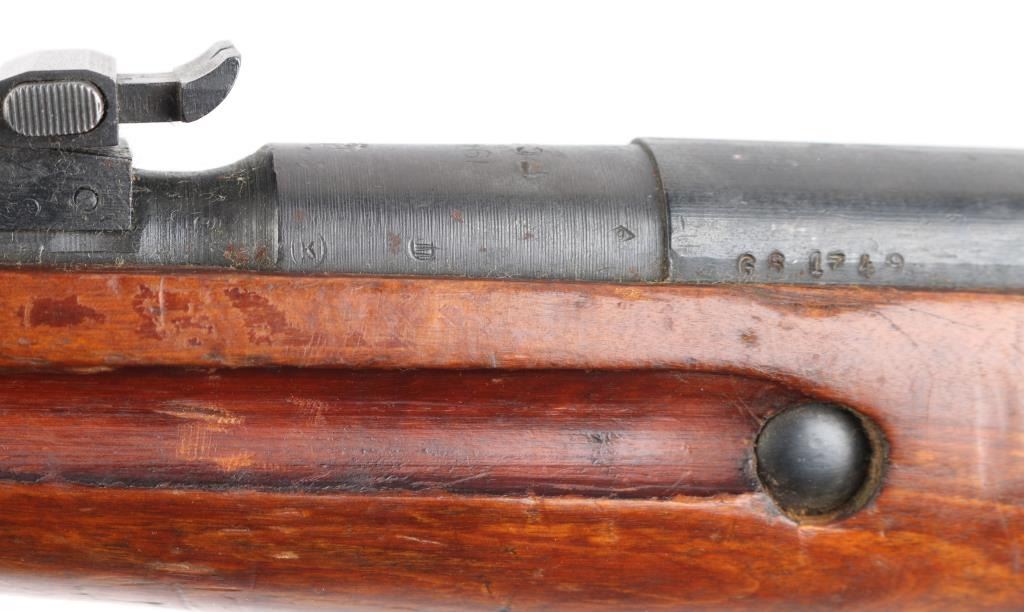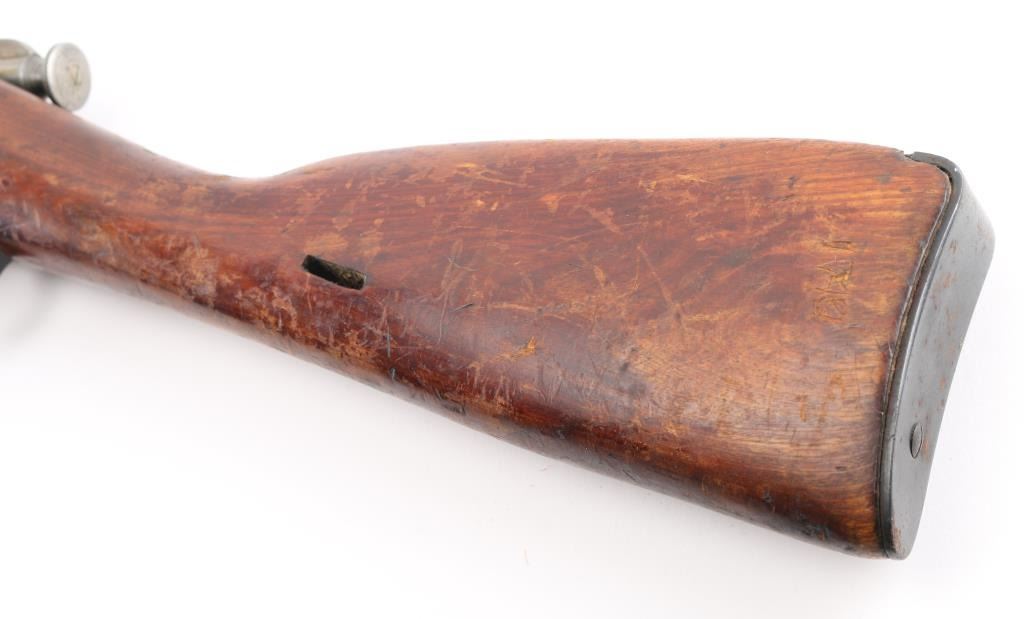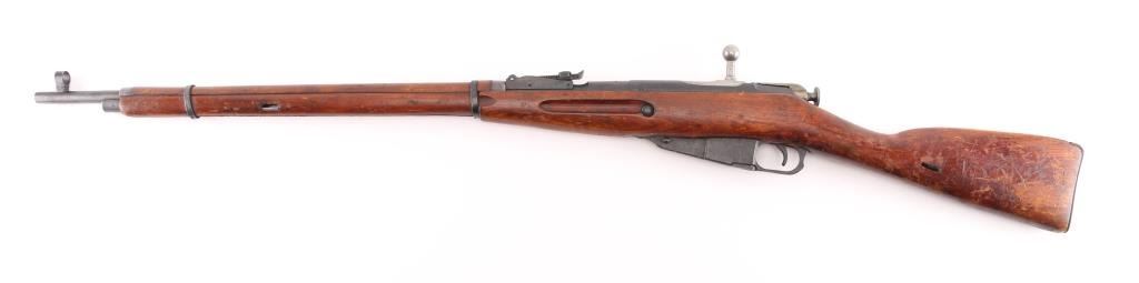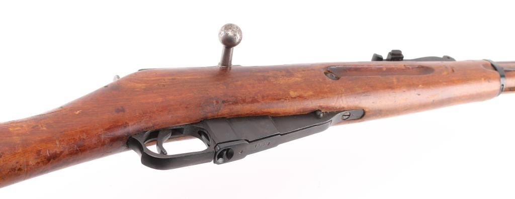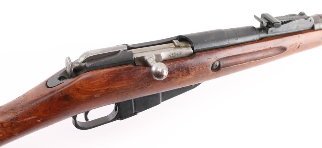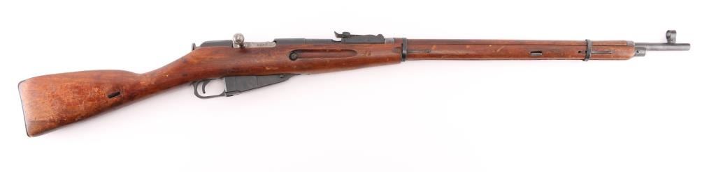 SN: GS1749. WW2 issued Russian (Soviet Union) military bolt action rifle dated 1942. Imported by CAI, St Albans VT. Features blued finish, wood stock & handguard, 29" barrel, post/ring front sight, tangent rear sight, manual safety, sling slots. No cleaning rod. Bore is lightly pitted with strong rifling. Metal retains 90% dark finish. Bare metal bolt is very good. Wood is very good. Mismatched numbers. Condition is NRA Good. C&R Firearm.