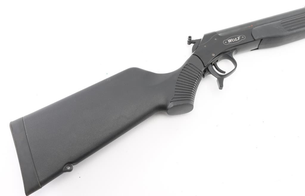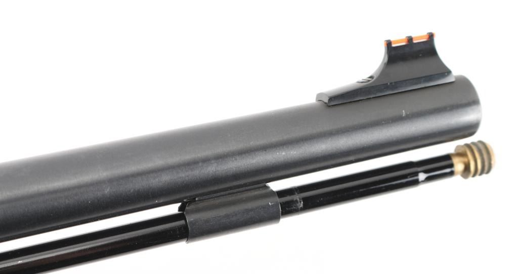 SN: 61-13-007579-08. Single shot black powder rifle made in Spain. Action breaks open to allow priming using a 209 primer. Features blued finish, 24" barrel, drilled/tapped for optics, ramrod under barrel, fiber optic insert adjustable sights, external hammer with offset cocking extension, lever behind triggerguard opens action. Black polymer furniture has grooved panels at forend and sides of pistol grip, high comb, solid rubber recoil pad, sling studs. Overall condition is excellent with no indication of having been fired, only minor handling marks, a couple of very minor rust spots on the lower right barrel, bore is excellent. Condition is NRA Very Good++. Antique Firearm.