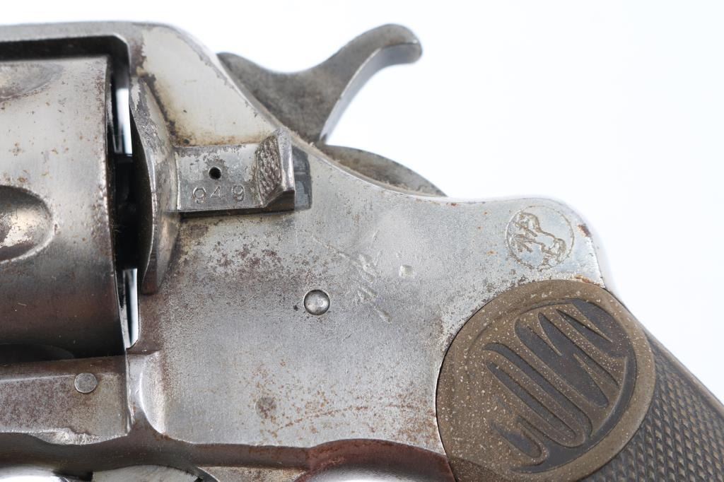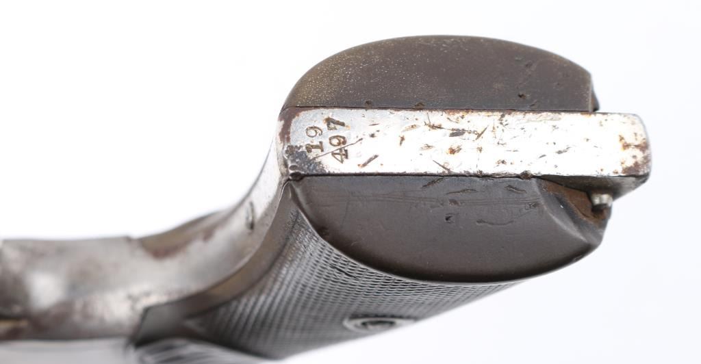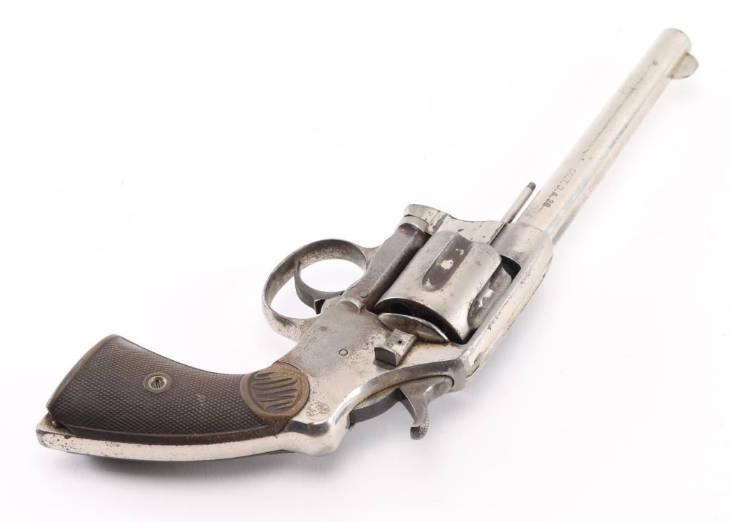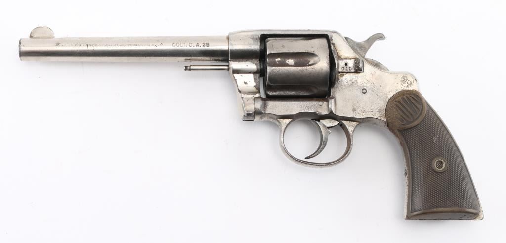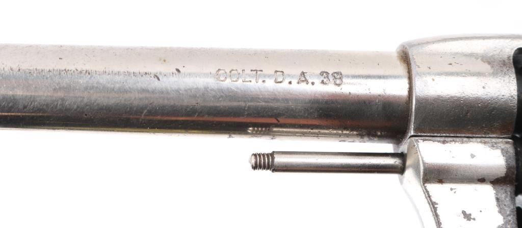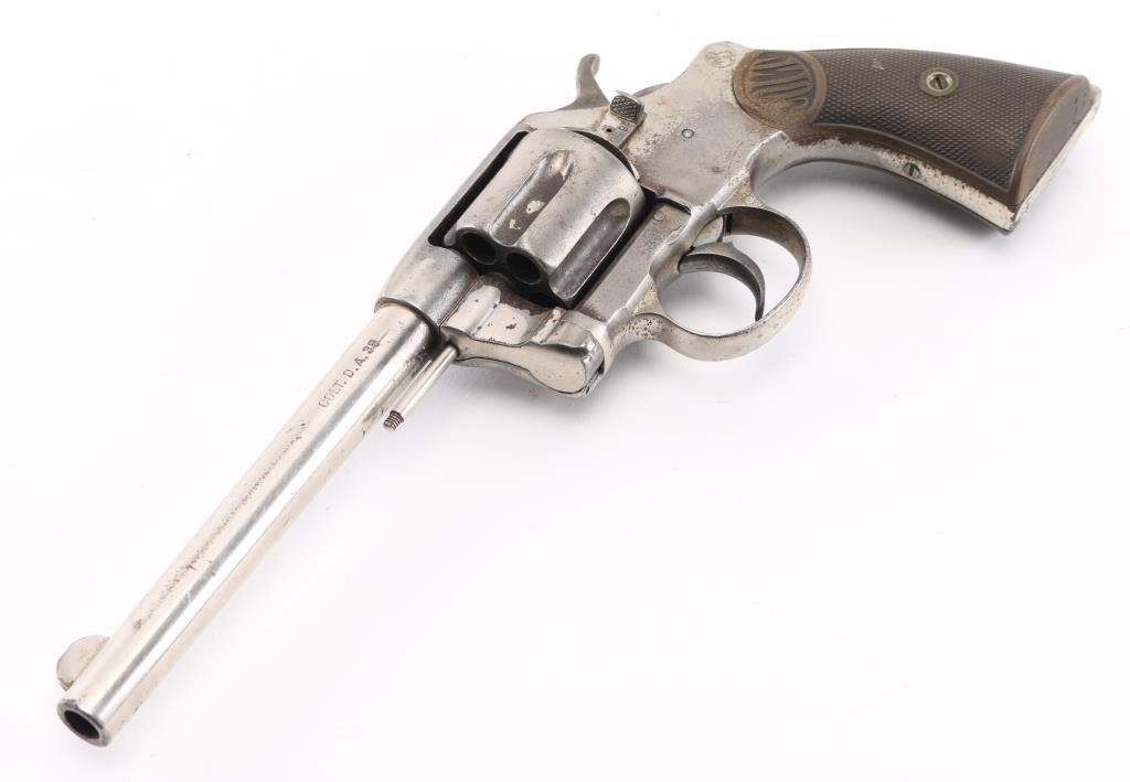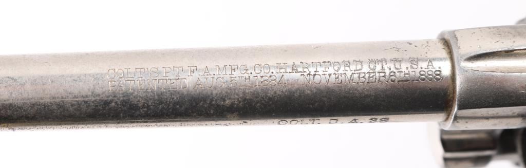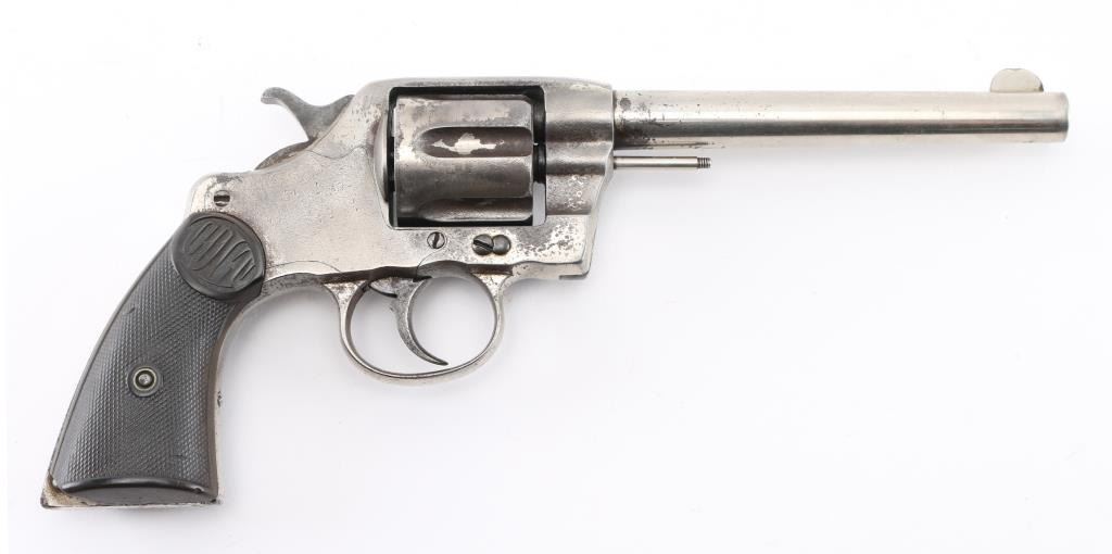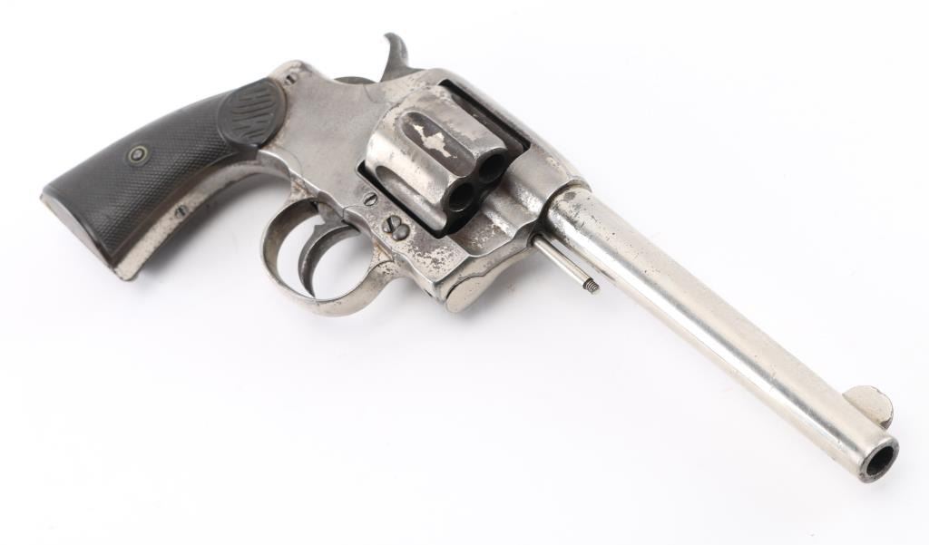 Antique commercial medium frame double-action revolver chambered in .38 Long Colt, manufactured circa 1895. Features a nickel finish, 6" barrel, round blade front sight, 'u' notched rear sight, non-shrouded ejector rod, fluted swing-out six shot cylinder, smooth trigger, knurled hammer spur and two-piece checkered black hard rubber grips with "COLT" , small Rampant Colt on left frame Matching serial numbers on frame, cylinder, heel, and cylinder release latch. Revolver exhibits approximately 40% of it's original nickel finish showing edge wear, thinning, scattered losses and some specks of light scattered rust. Action is stiff with solid lock-up, the bore has strong rifling, but has scattered light pitting, markings are sharp and the hard rubber grips are worn with 2 small chips out of both rear lower panels, ejector rod head missing. hammer action is crisp/tight, but cylinder spins, and does not index, Condition is NRA Fair as Antique Firearm.
