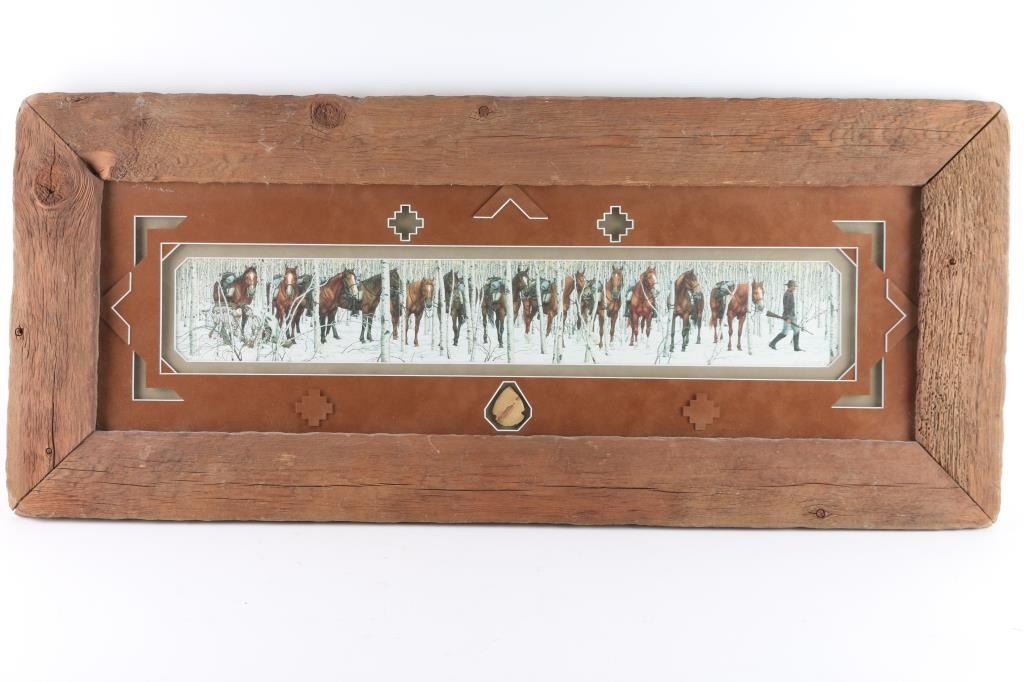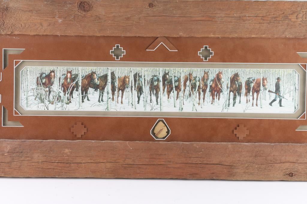 By "Bev Do little" entitled "Two Indian Horse' depicting two Indians sneaking around cowboy and heard of horses. Beautifully triple matted in bard wood frame with glass overlay. Image size measures 25x9