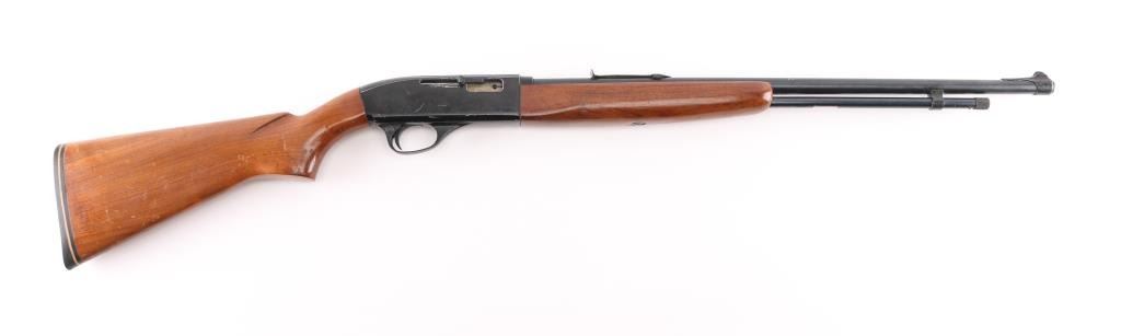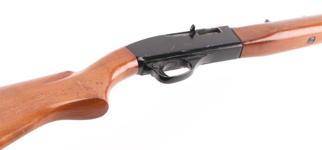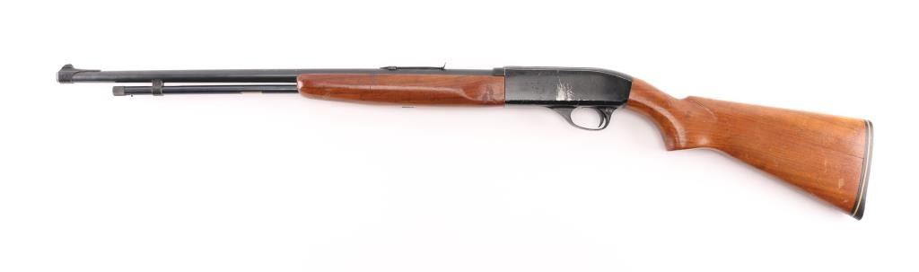 Semi-Auto Rifle With Tube Magazine. Made by Colt for Wards, same model as the Colt Colteer. 39 3/4” long, 22” barrel, grooved for scope. rear sight missing lifter. Made between 1957-1966. Bore is very good/bright, wood is sound with minor scratches/scuffs, black receiver has edge wear, left side has many scratches, blue barrel is good with muzzle, minor scratches. NRA Condition-Good. C&R Firearm.