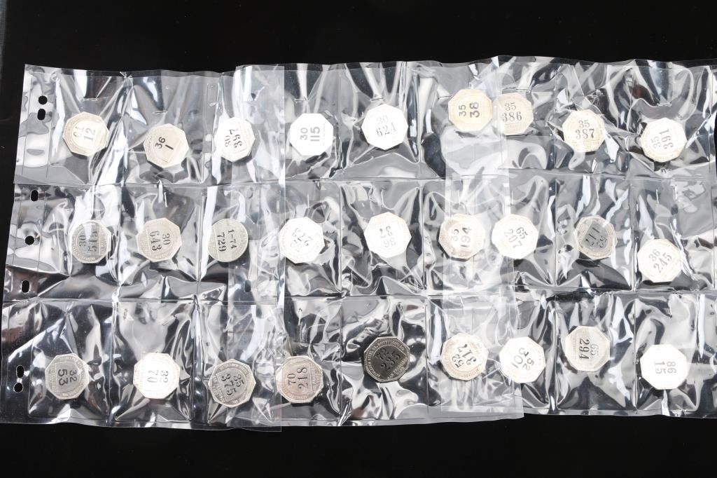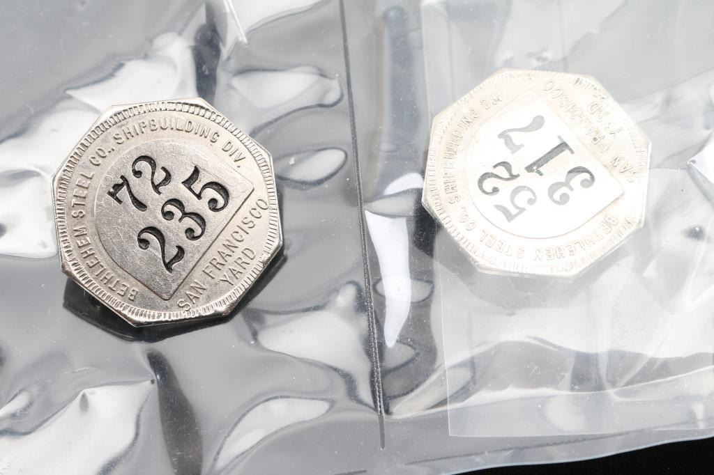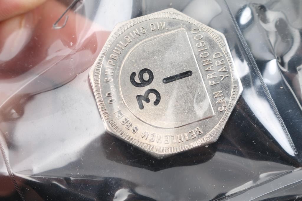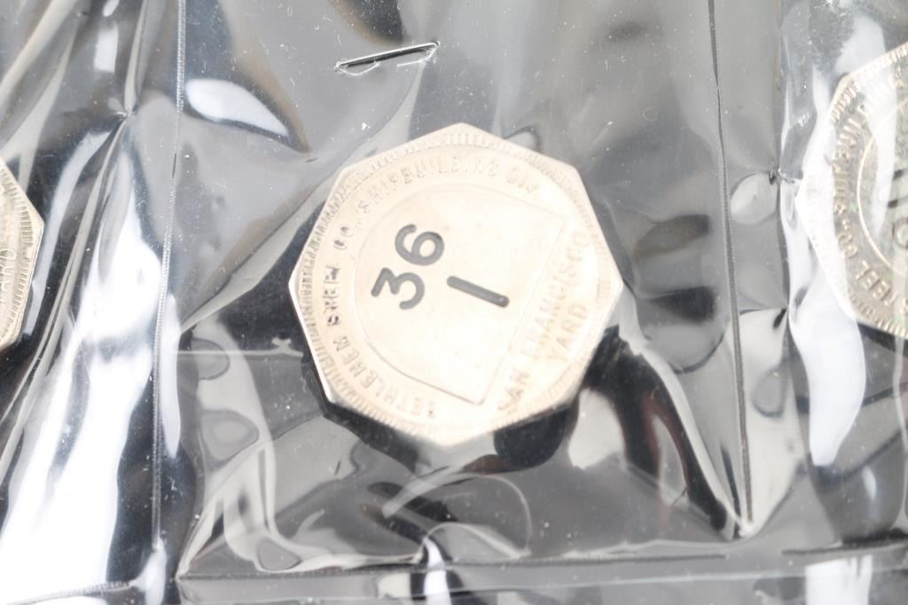 From the Bethlehem shipyard: San Francisco, total of 27 badges in plastic covers , all in very good condition, all are different numbers that correlate to workers, all have been constructed with steel pins on back of each badge.