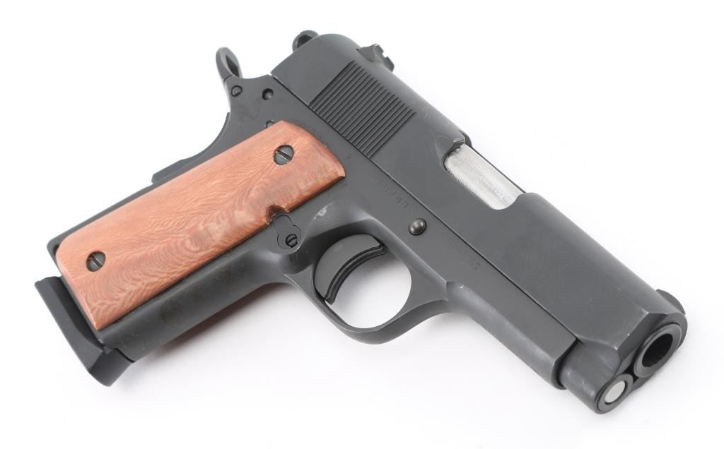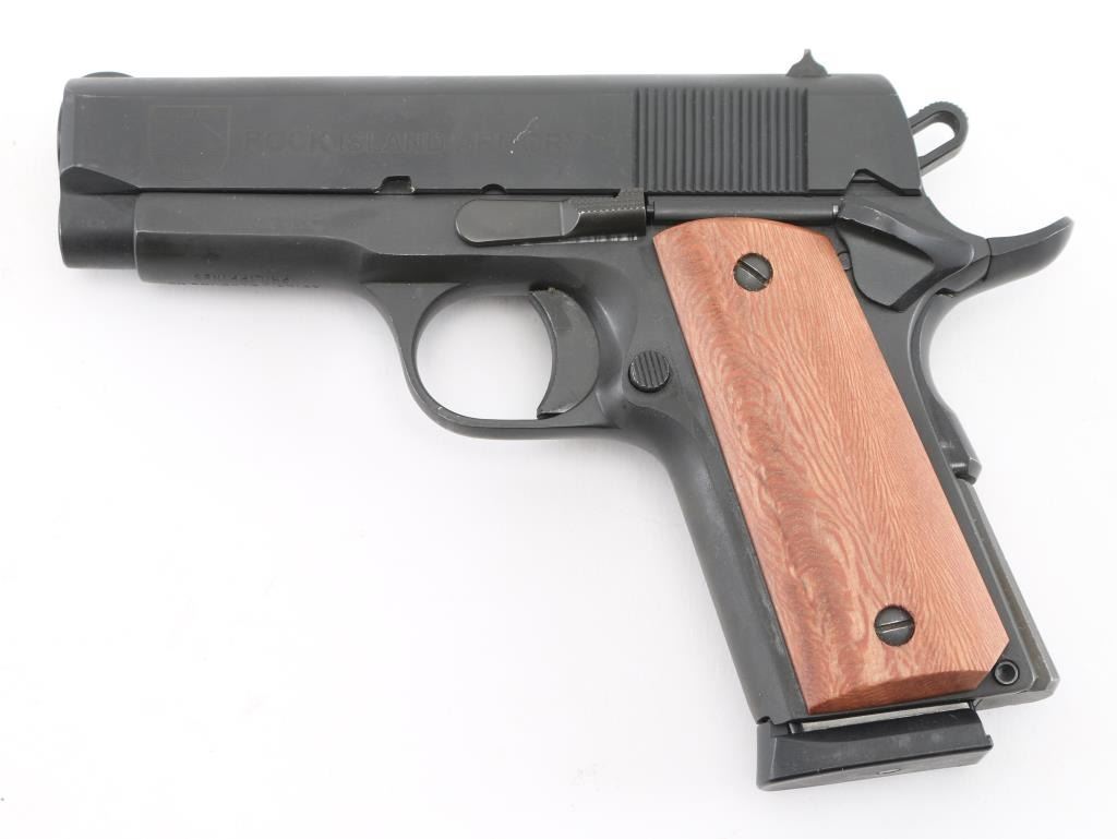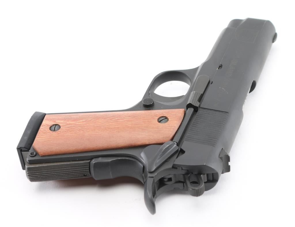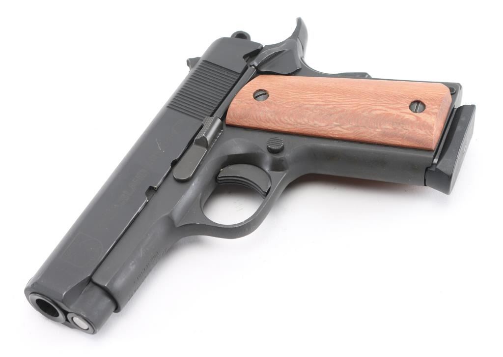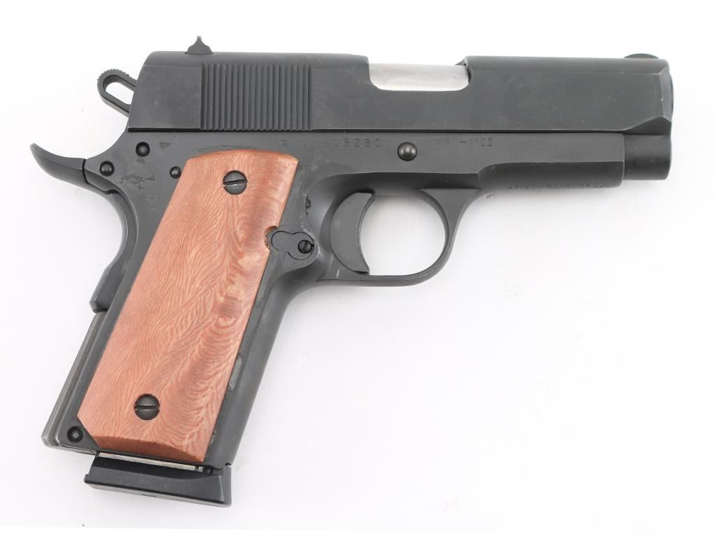 SN: RIA1216280 Phillipines made semiautomatic pistol, imported by APINTL, Pahrump NV. Features matte dark gray finish, smooth wood grips, 3.75" barrel, blade front sight, dovetail mounted rear notch sight, skeletonized hammer, single action trigger, frame mounted thumb safety, upswept beavertail grip safety, push button magazine release. Bushingless design with full length recoil spring guide rod. Bore is pristine. Retains 95% finish with rub marks from moving parts, handling marks. Grips are excellent. Includes one 7 rd ACT magazine, factory box, manual, spare Hogue black rubber wrap-around grip. Condition is NRA Excellent *** Modern Firearm ***