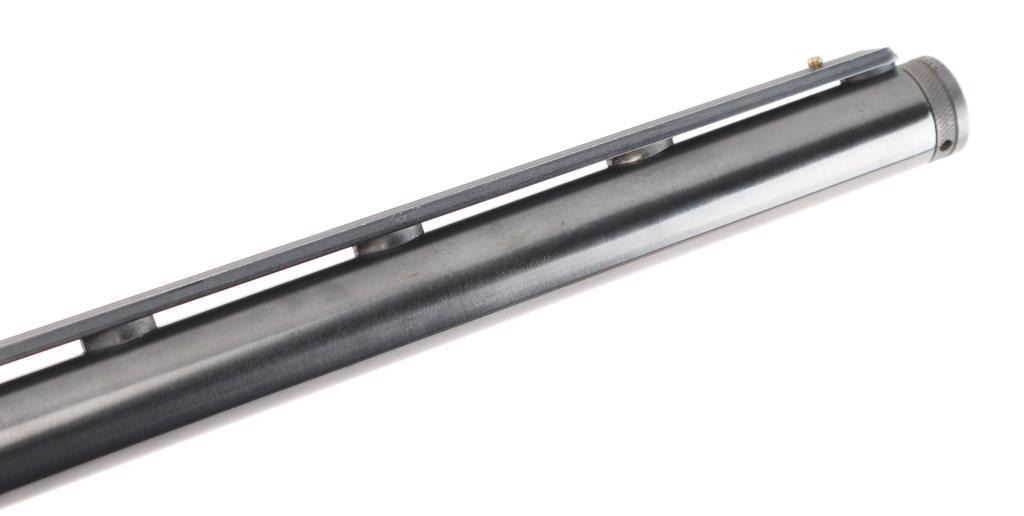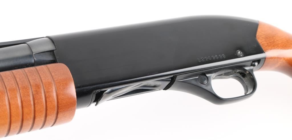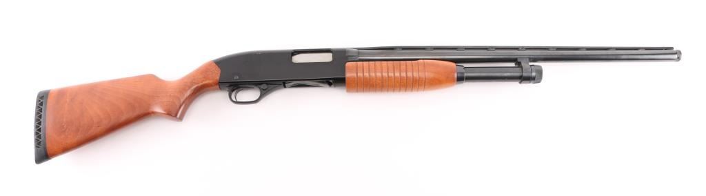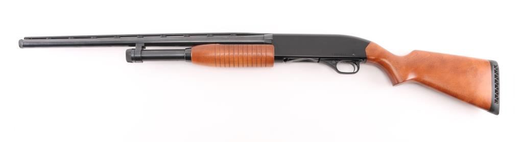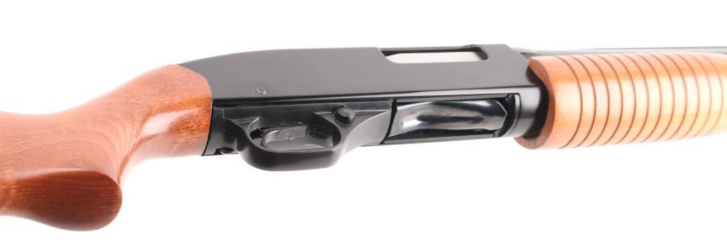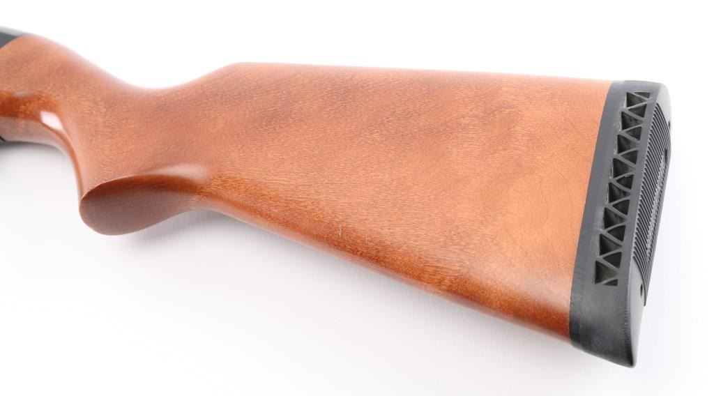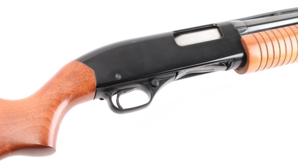 American made pump-action shotgun, blued finish, approximately 22 3/4" threaded vent rib barrel with a thread protector, bore is bright, brass bead front sight, smooth trigger, grooved forearm stock, smooth pistol grip buttstock, ventilated black rubber recoil pad. **NRA Excellent** Modern Firearm