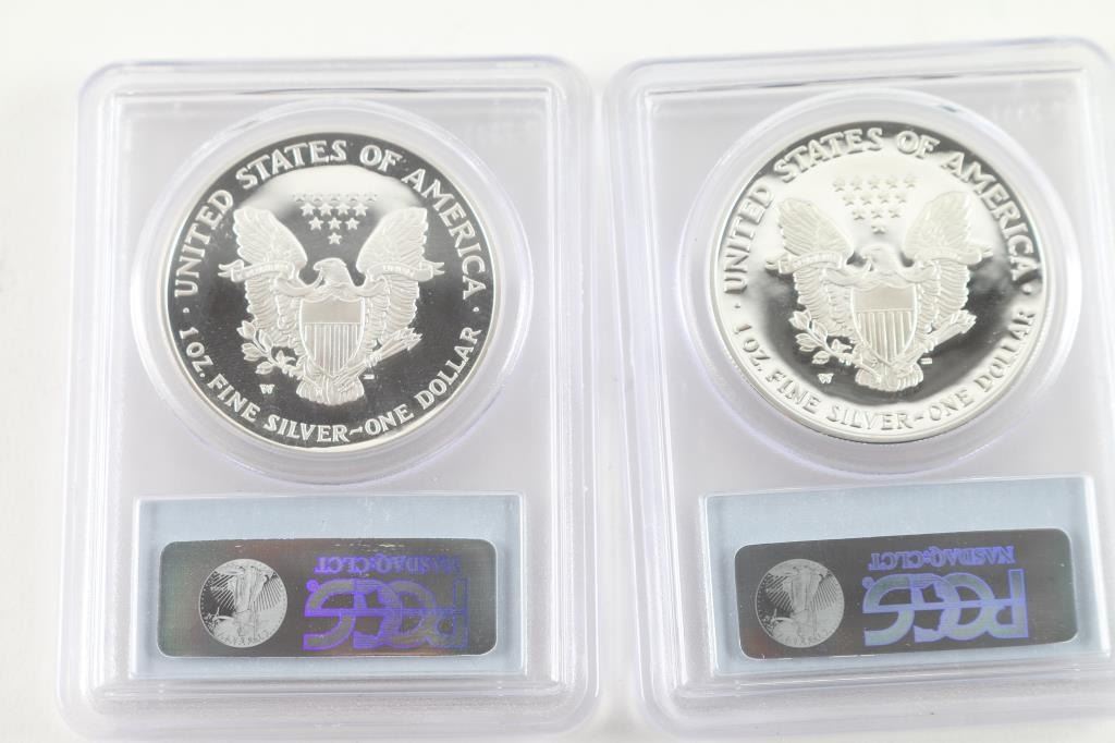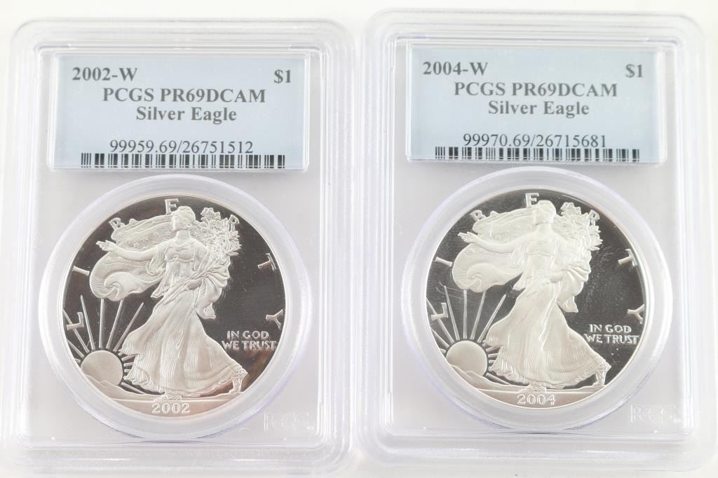 Dated 2002 and 2004, these two coins are PCGS certified and are in plastic protectors. In mint condition.