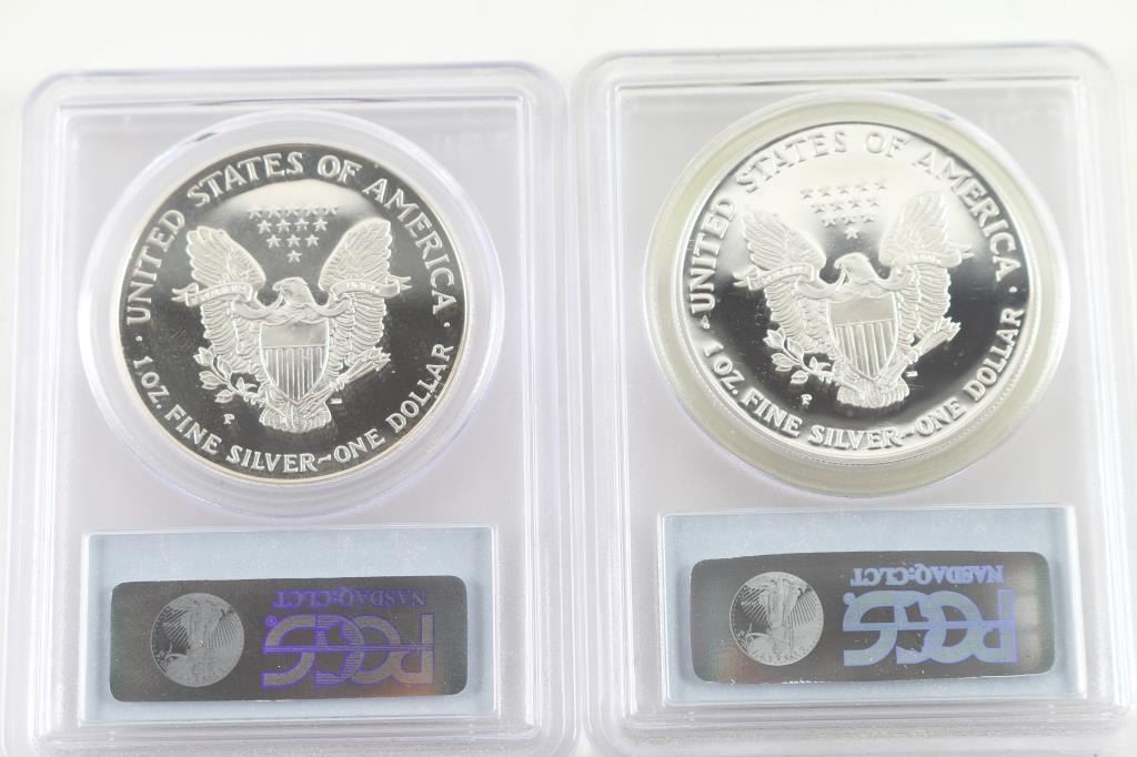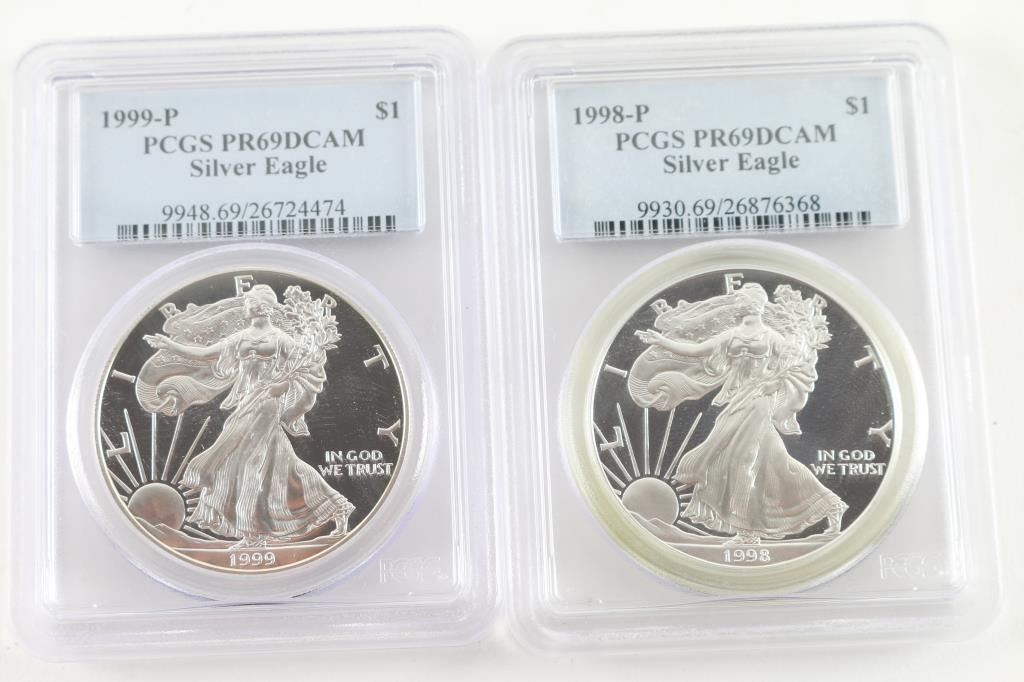 1.) 1998-P Sliver Eagle, with PCGS certificate. (2.) 1999-p PCGS certified both in plastic protectors.