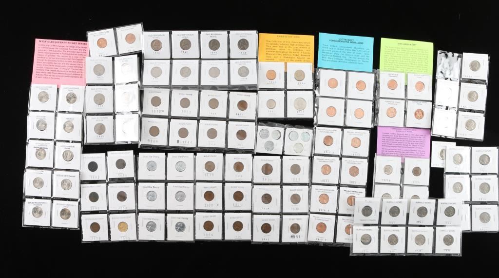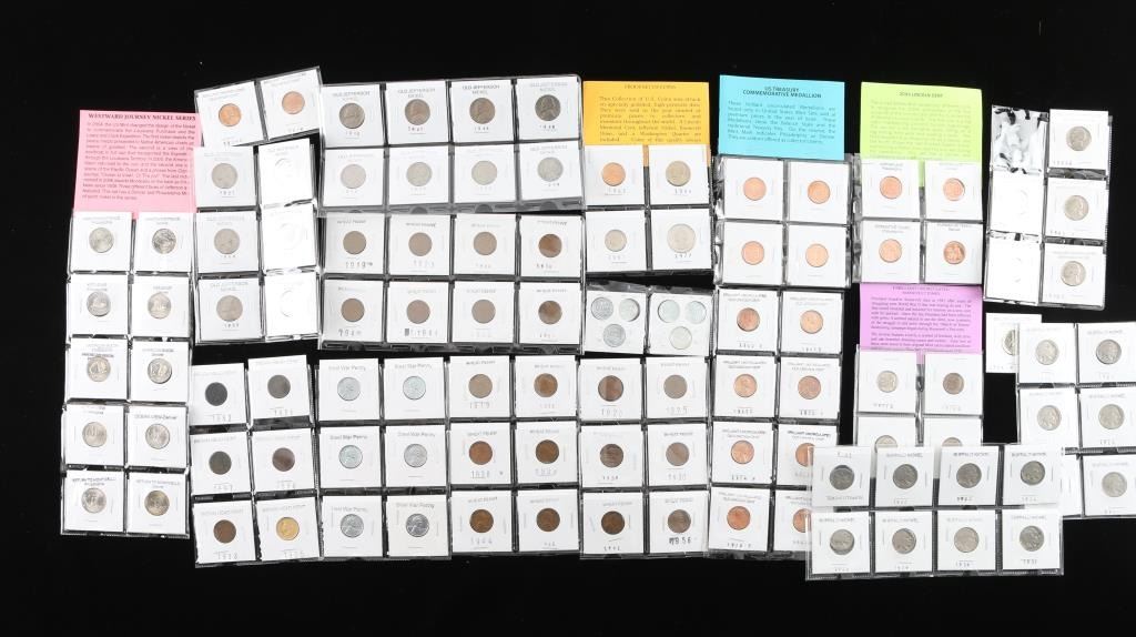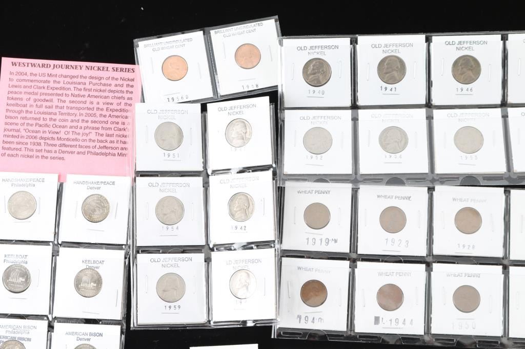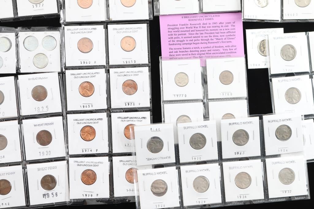 Includes a total of 40 nickels, from buffalo to uncirculated to old Jefferson, all various years an conditions.(1.) Includes 20 "wheat penny's. (2.) 8 uncirculated old Lincoln one cent coins, all in good condition.(3.) 12 steel war penny's(4.) 8 brilliant uncirculated Roosevelt dimes, in original mint condition.(5.) 8 mint US Treasury Commemorative medallions.(6) 8 mint 2009 Lincoln cent coins.(7) 6 Indian Head cent coins, in various conditions and years.(8.) Proof set of coins in mint condition.(9.) 1909 Lincoln head cent