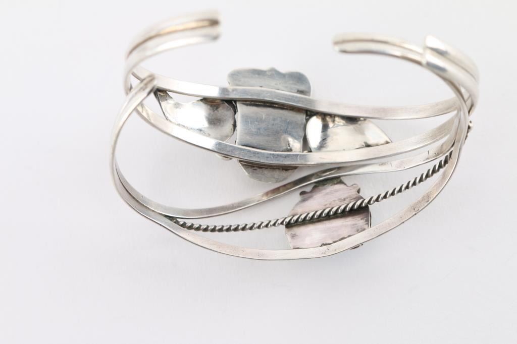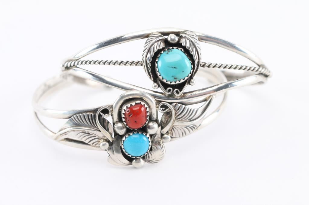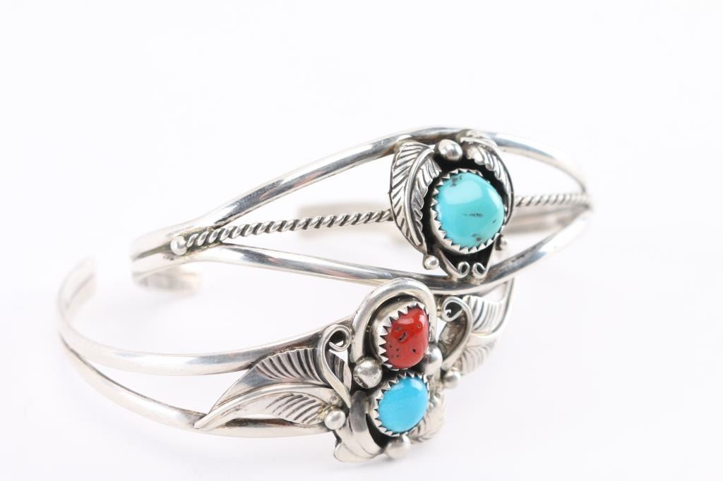 (1) Turquoise & Coral Bracelet set sterling (1) Turquoise Cuff set in sterling