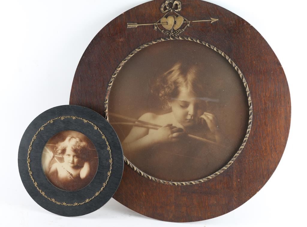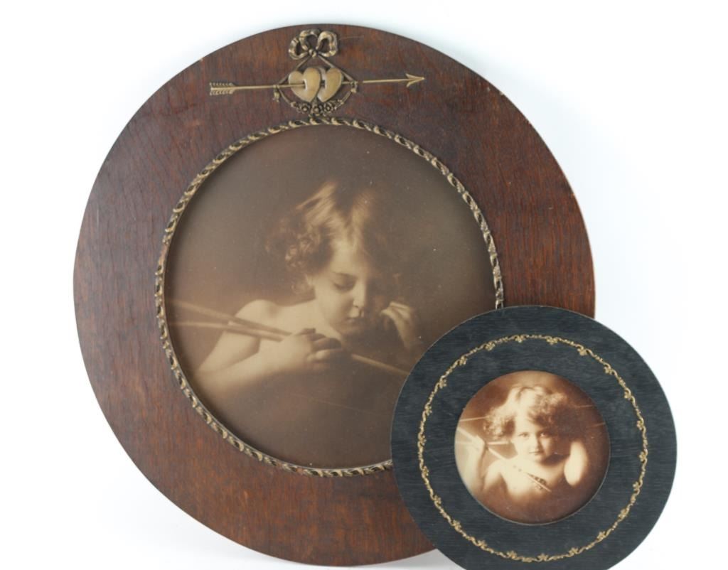 In antique frame, with brass floral style, measuring 5x11(1.) Is depiction of cupid , in wood frame measuring 7x12.