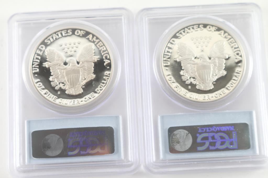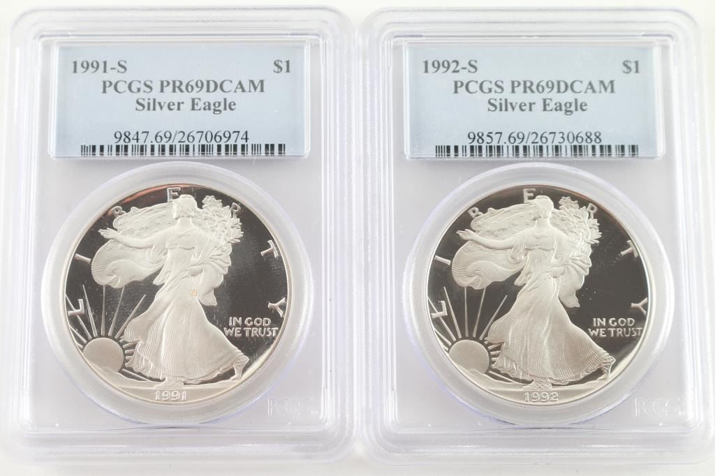 Includes a 1991-S PCGS certified Sliver Eagle coin. Also a 1992-S PCGS certified Sliver Eagle coin. Both in mint condition in plastic protectors.