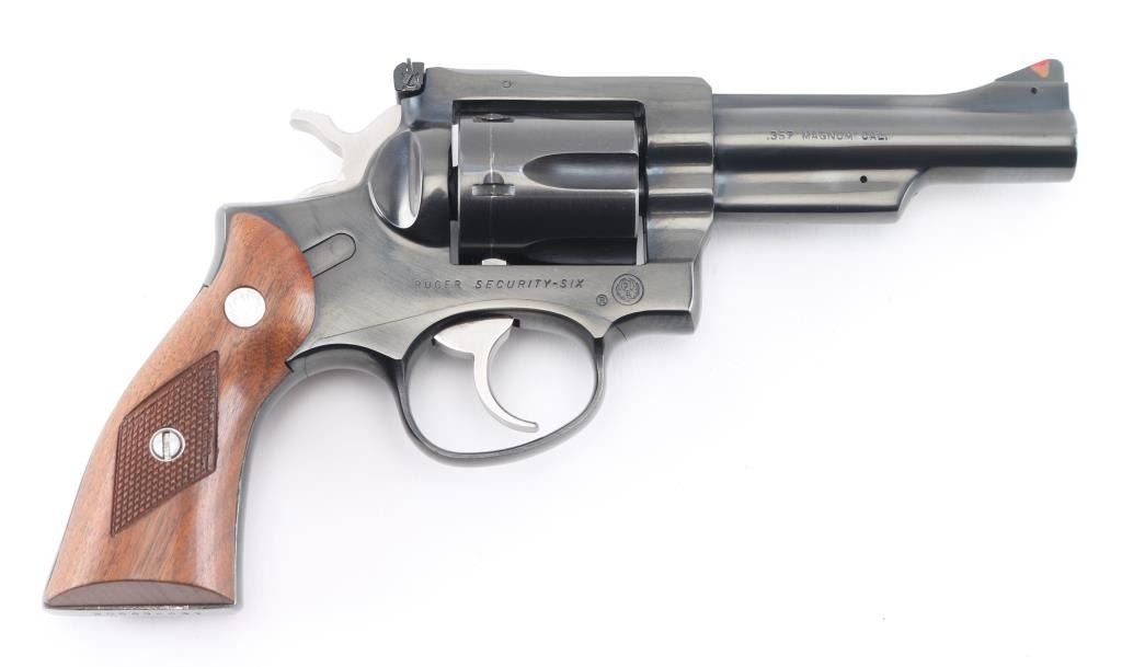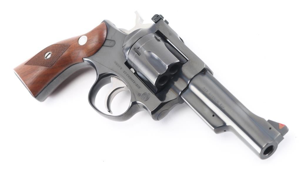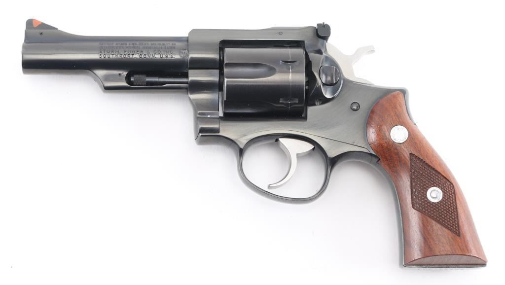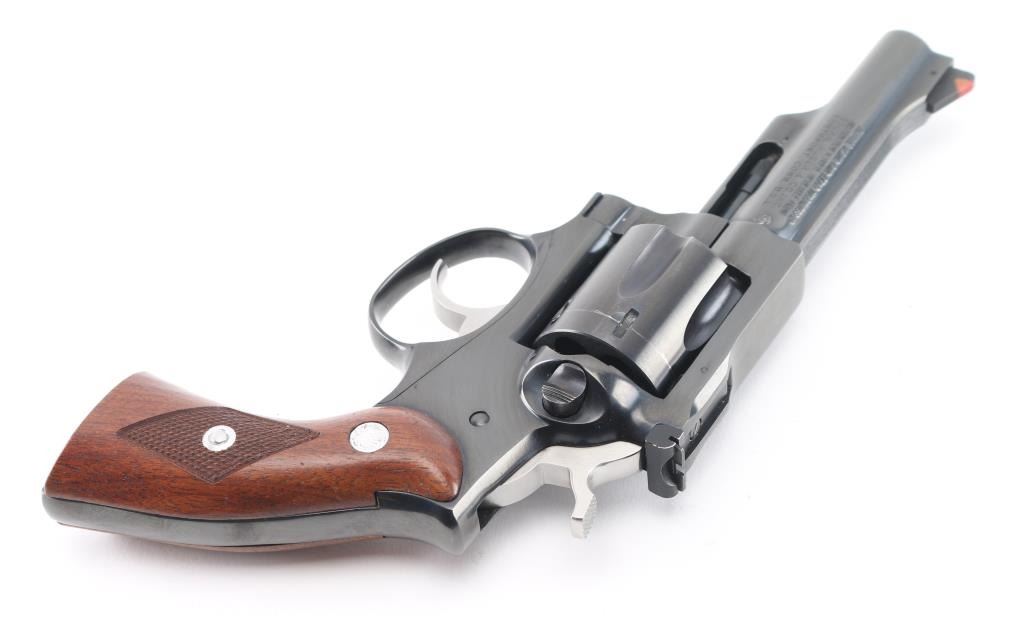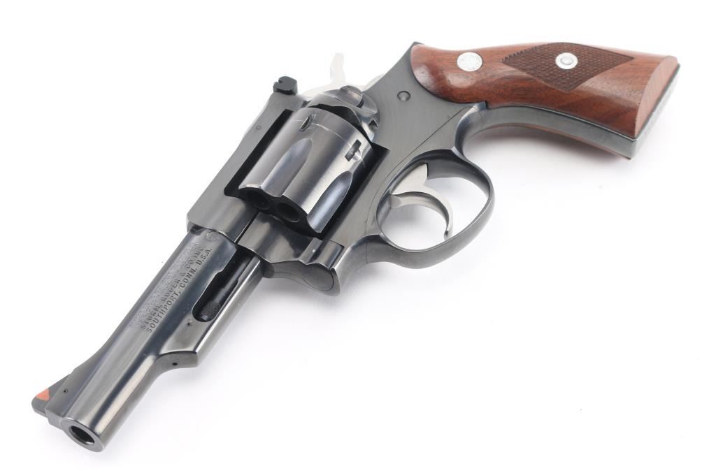 Medium frame double action revolver. Features 4" barrel, swing out 6 shot fluted cylinder, adjustable sights with orange ramp front, checkered wood grips with Ruger medallions, smooth faced trigger, knurled spur hammer. Bore and charge holes are excellent. Blued finish is 95% or better with cylinder drag line visible. Trigger and hammer appear stainless, excellent condition. Grips are almost excellent, with handling marks. Action operates smoothly. cylinder lock-up is tight. Condition is NRA Excellent. Modern Firearm.
