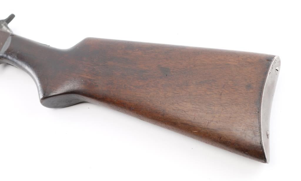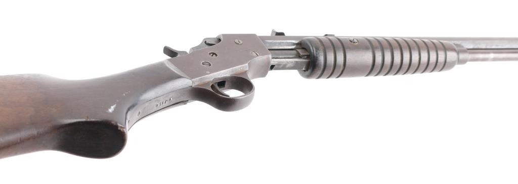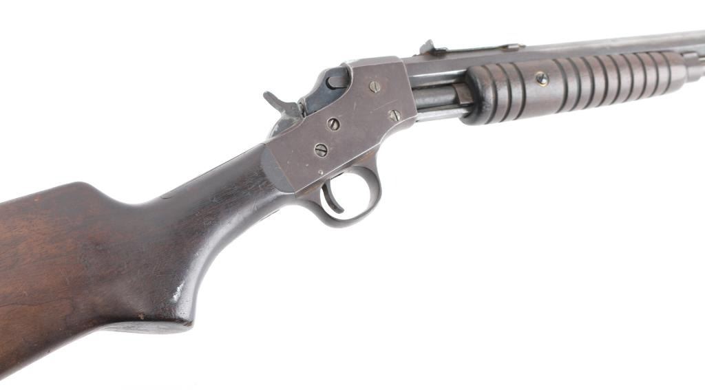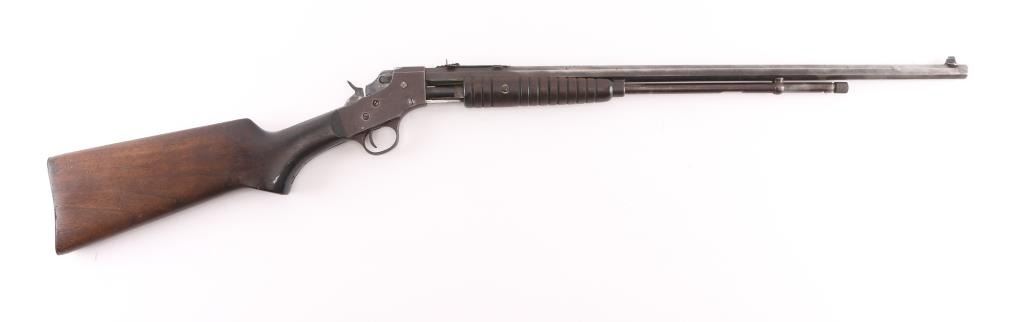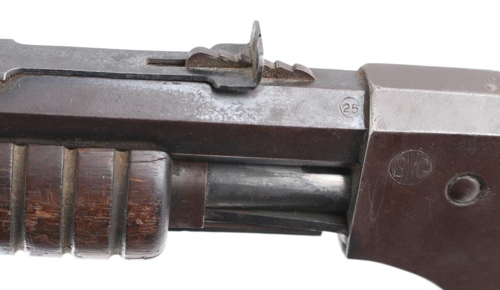 Vintage American made slide action repeating rifle chambered in .22 S/L/LR, "SVG" in circle on receiver, Savage owned Stevens 1920-34. Features a blued & case hardened finish, 24" octagonal barrel, 3/4 length tube magazine, dovetailed blade/bead front sight, elevation adjustable rear sight, grooved walnut slide handle and smooth straight grip shoulder stock with steel buttplate. Rifle exhibits traces of original finish with the majority of the metal surfaces displaying a mottled grey/brown patina. Action is sound, the bore is fair and the wood stocks are good small cracks around upper tang. Also some hairline cracks extending from the reciever. Condition is NRA Good. C&R Firearm.