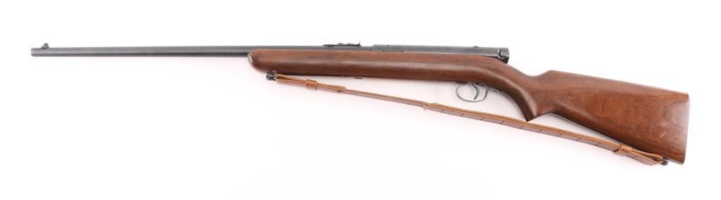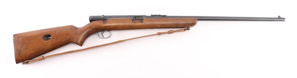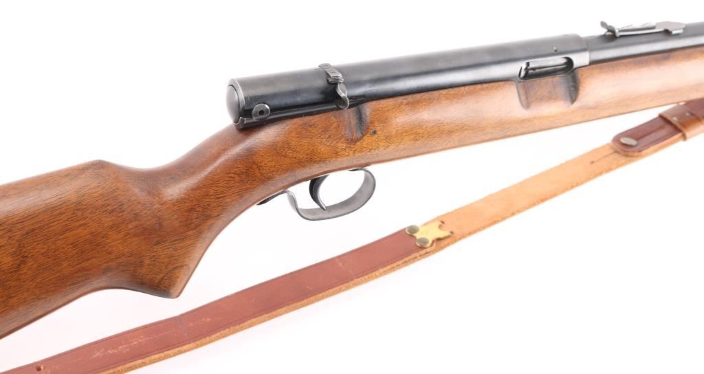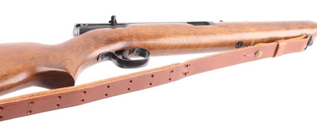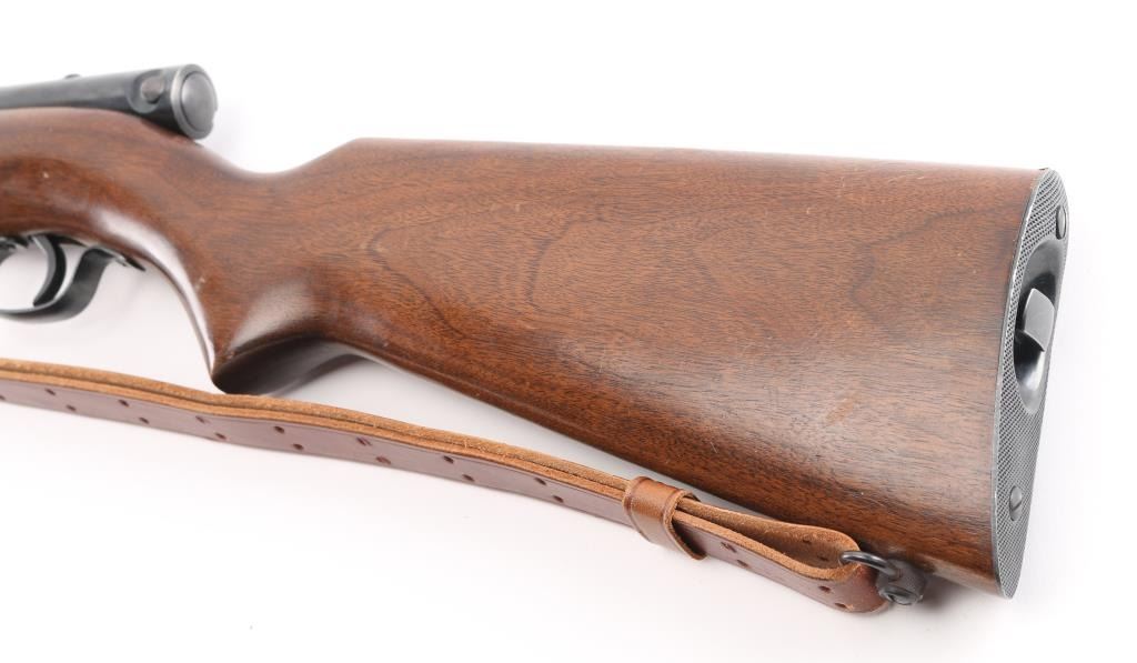Semiautomatic rimfire rifle manufactured circa 1953. Features blued finish, wood stock, magazine tube in butt, blade front & sporting rear sights, 22" barrel, manual safety on top of receiver. Bore is very good condition, bright with some frosting. Blue finish is about 95% with minor rubs, muzzle wear. Wood is very good with some very minor scratches. Brown leather sling attached.. Condition is NRA Very Good. C&R Firearm.