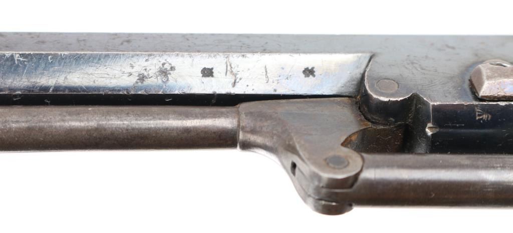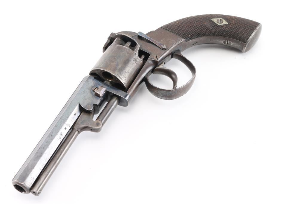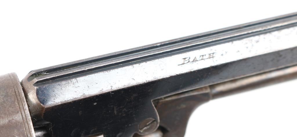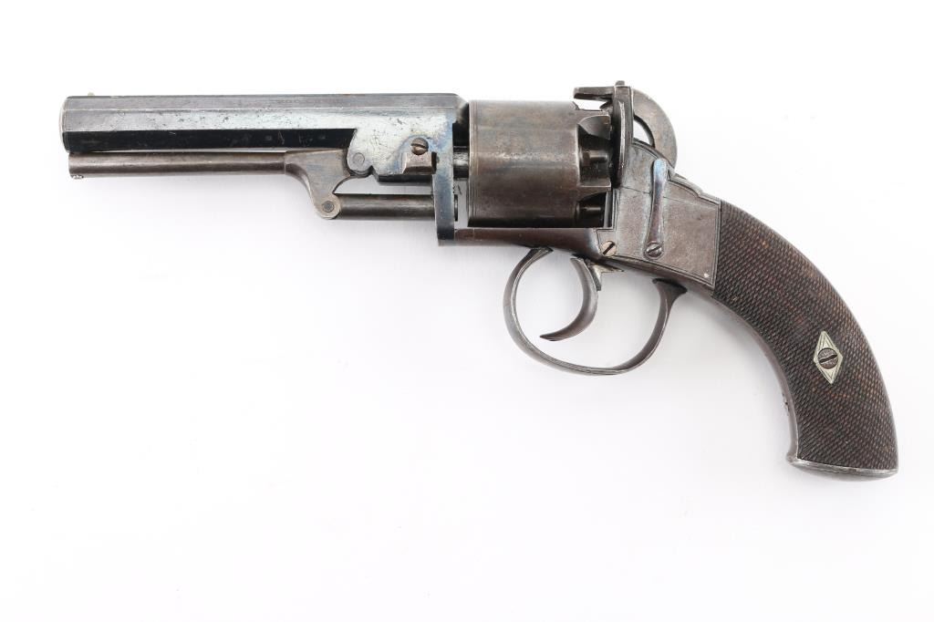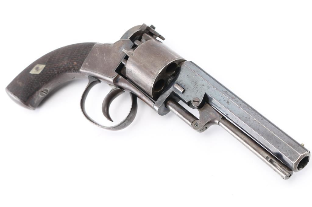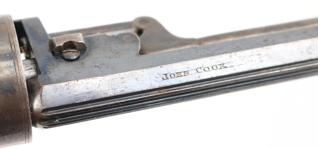 19th Century English double-action only Bentley style percussion revolver. .298 bore, 5 rd cylinder. Approx. 5" wedge retained octagonal barrel, front sighting bead, sighting channel on top of barrel, v-notch rear sight. Open top frame, Colt style under-barrel loading lever. Made by John Cook of Bath England (Marked on barrel) Small proofs on cylinders between chambers, and on barrel, but can't made them out. Checkered wood grips. Bore looks very good, rifled with 7 narrow grooves. Blue finish is about 35%, mostly on the barrel with traces of blue mixed with a brown/gray patina. Possibly an old re-blue. Looks like its been on there a long time. Action is crisp/tight. Wood grips are very good. NRA Condition-Very Good to Fine as Antique Firearm.