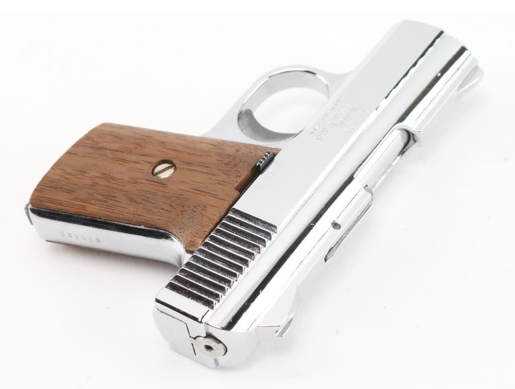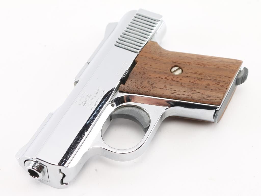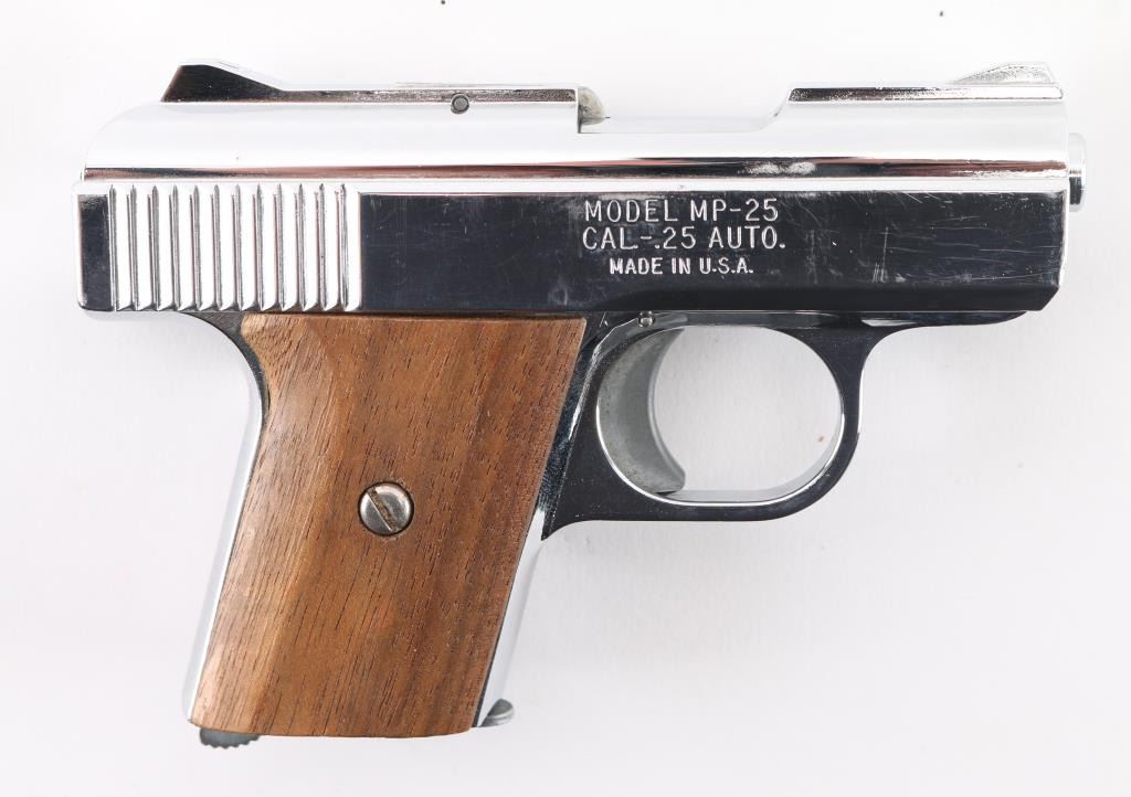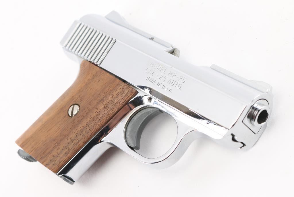 American made semi-automatic pocket pistol chambered in .25 Auto. Features a stainless steel finish, 2.25" barrel, fixed sights, cocked indicator, manual safety, heel magazine release, 6 round magazine, and two piece wood grips. The metal finish is very good with minor scratches. Wood grips are fine. Bore looks good. Condition is NRA Very Good. Modern Firearm.