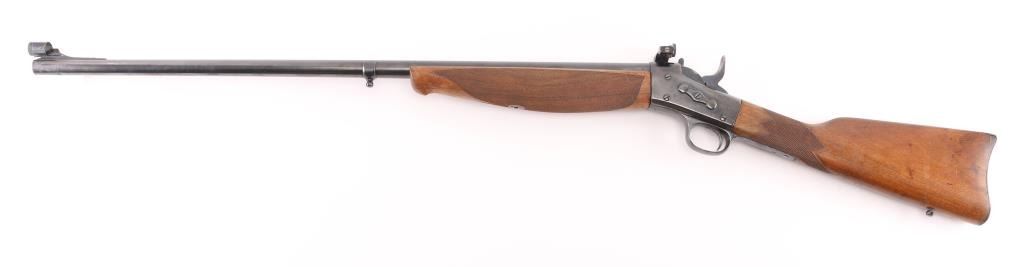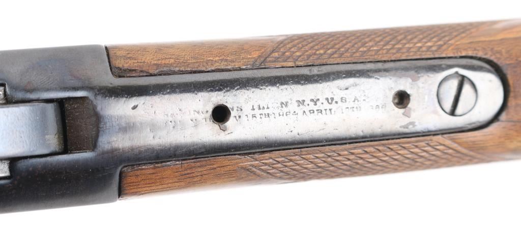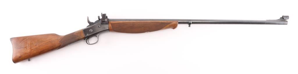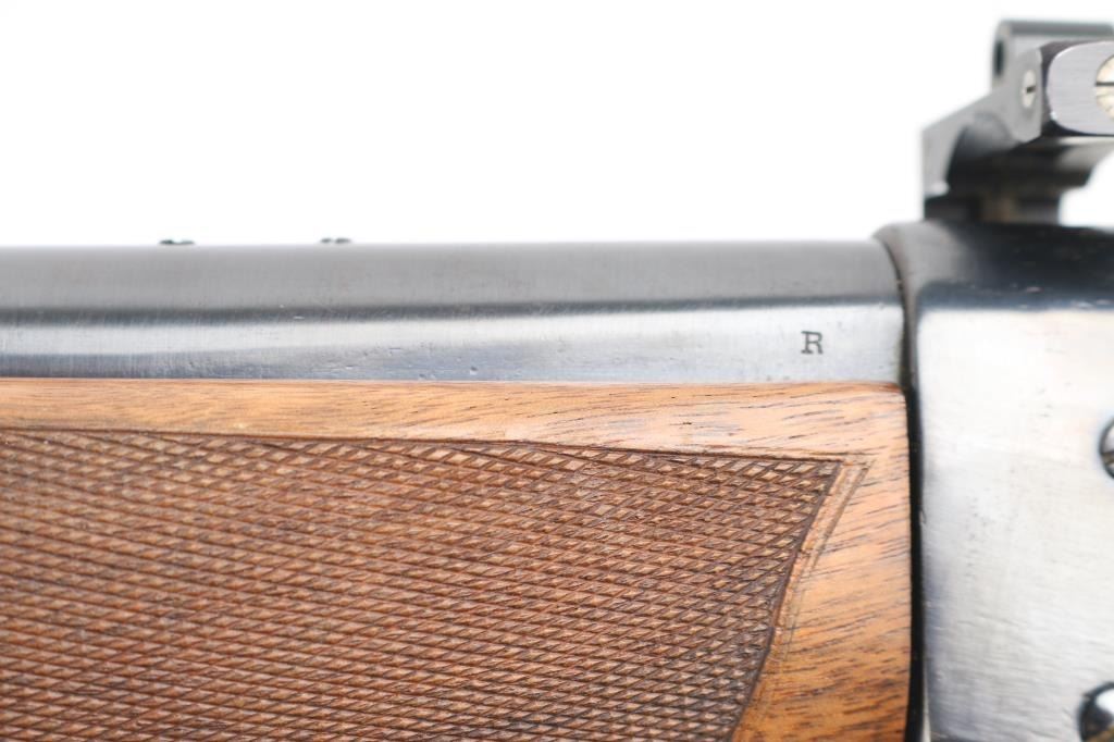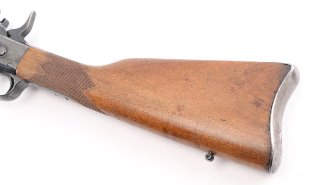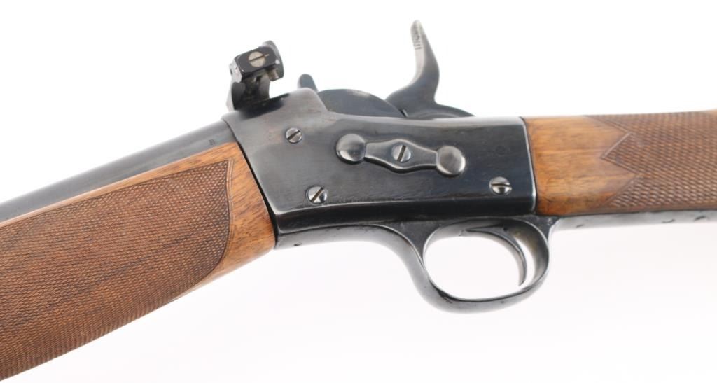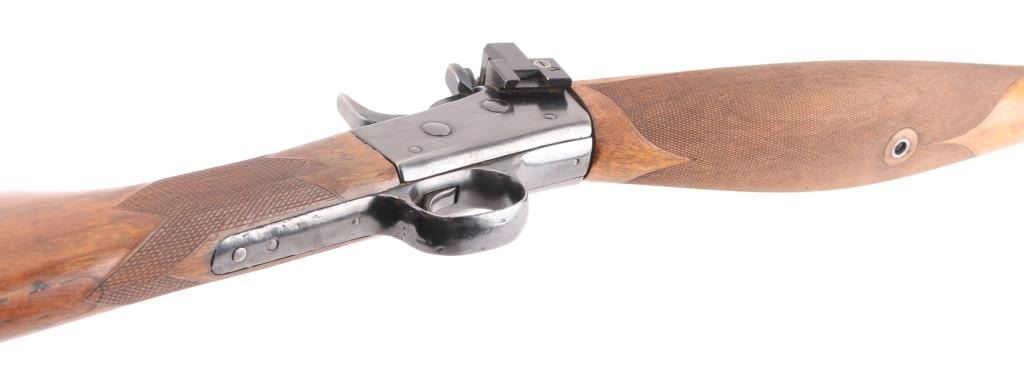 This is a custom rifle built on a vintage 3-screw rolling block action, two-line tang markings read REMINGTONS ILION N.Y.U.S.A. PAT. MAY 30 NOV 15TH 1864 APRIL 17TH 1868. (Very Feint) 30" barrel with ramped. hooded front sight, and a Williams adjustable peep sight mounted on receiver. Wide schnabel tipped, checkered forearm, straight checkered wrist butt stock with steel butt plate, (ex military with rack number '31' stamped above plate tang, and wood inset where sling swivel was). Sling studs,Tang is drilled/tapped for peep sight. Bore is very good/bright, refinished wood is very good with minor scratches/dings, action is crisp/tight, re-blue finish is very good with edge wear, rubs. Some light pitting visible under the blue on the receiver. NRA Condition-Excellent as Restored. Antique Firearm.