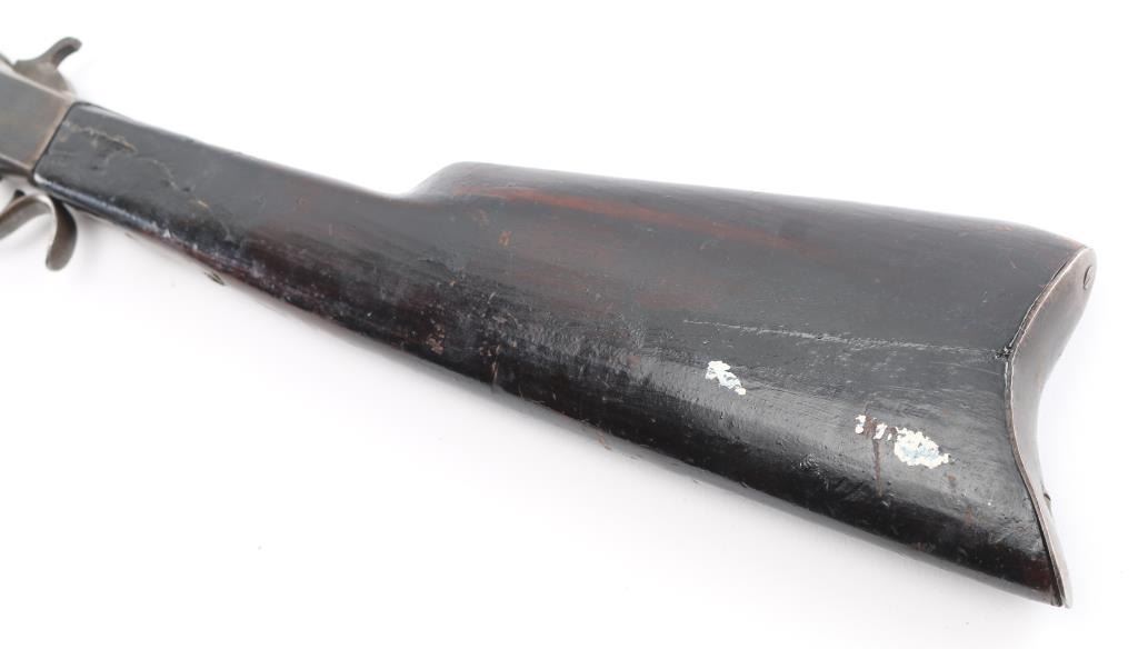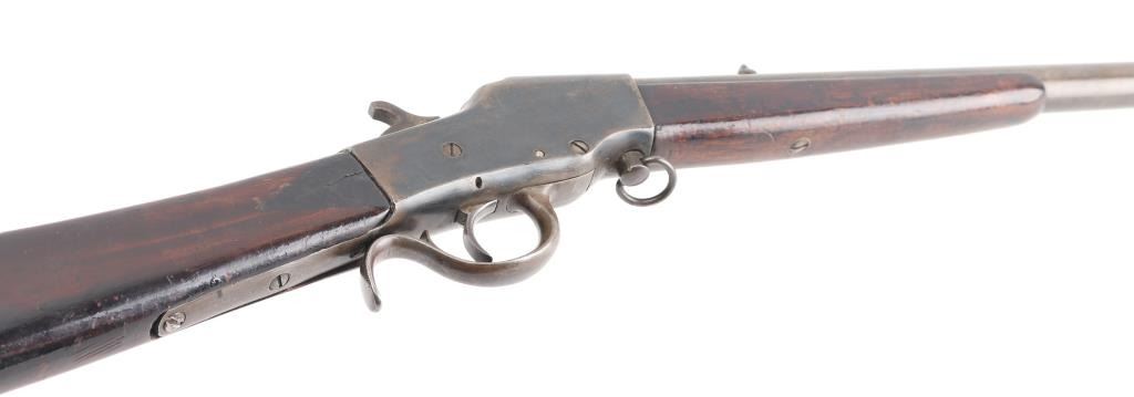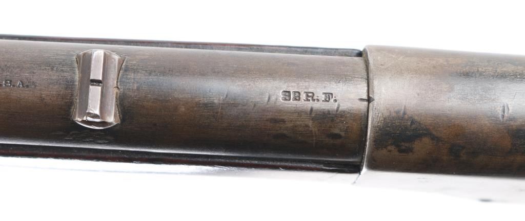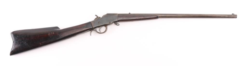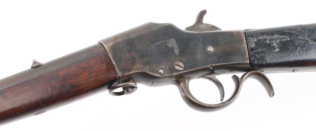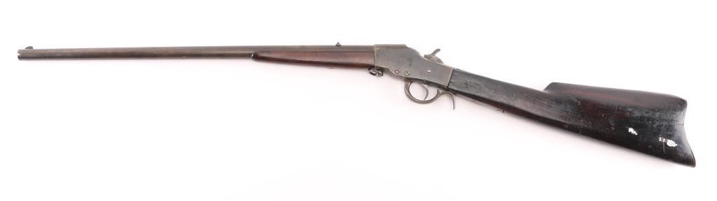 Single-Shot. Falling Block. Take-Down rifle. 22" with fixed blade/notch sights. Bore is fair with rifling, scattered light pitting. Walnut stock, and forearm are sound with a couple of cracks/sctraches, a couple of spots of white paint on the left butt stock. Blued barrel has faded to a gray/brown patina with traces of blue. Blue receiver has faded, with loss to the edges. Action is smooth/tight.. NRA Condition-Very Good. Antique Firearm.