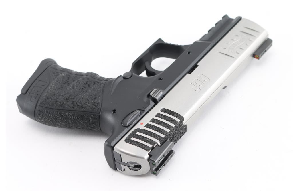 Made in Germany, this is a semi-auto pistol chambered for 9mm ammunition. It has a stainless slide, synthetic frame with accessory rail, nicely textured grip, and three dot green fiber optic sights. Metal finish looks great. Frame looks great. Bore looks great. Comes with original factory hard case, owners manual, and two magazines. Condition is NRA Excellent *Modern Firearm*