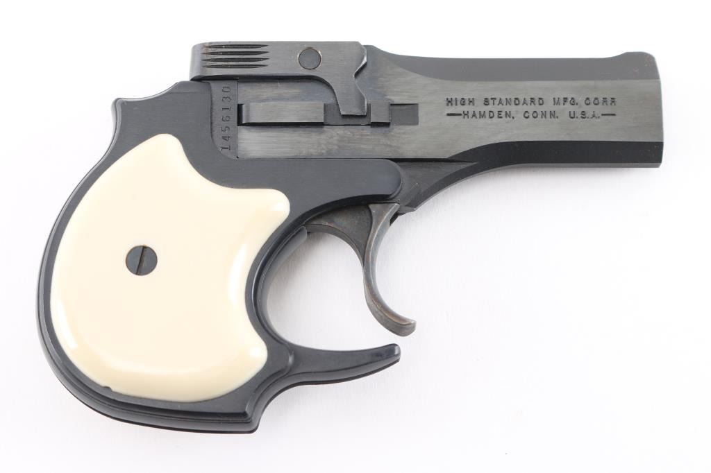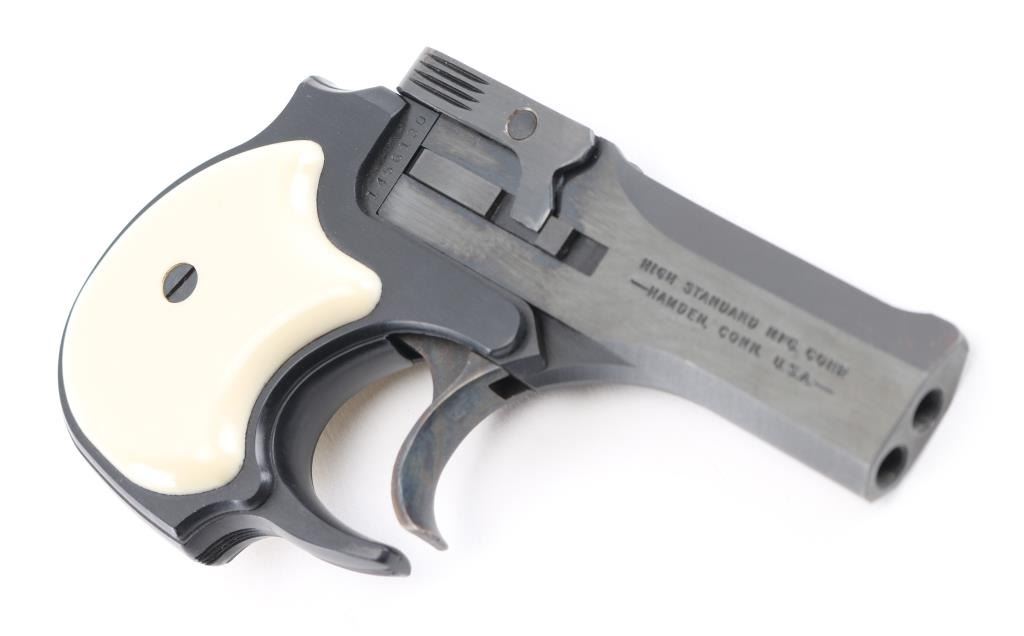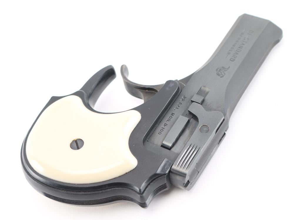 O/U double barrel derringer chambered for .22 S/L/LR. Tip open, blued finish, faux ivory grips. Comes with factory hard case. Pistol retains nearly all of its original blued finish showing minor tool marks on the barrel latch. Condition is near NRA Excellent. *Modern Firearm*