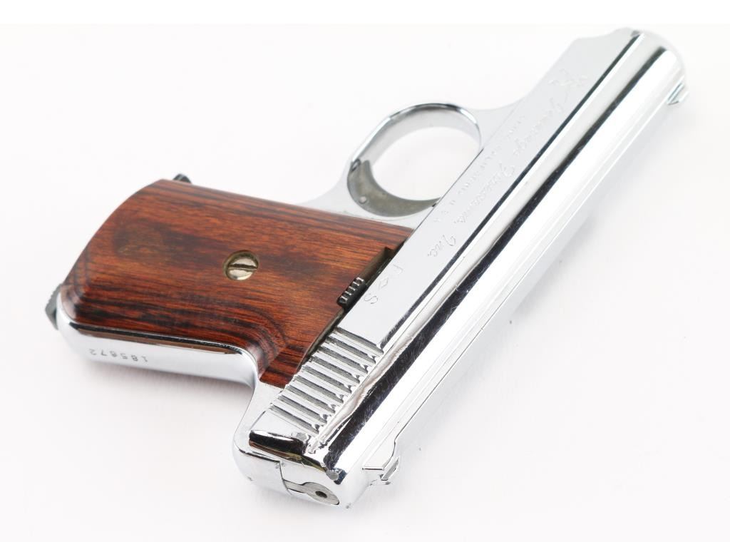 Semiautomatic rimfire pistol features approx 2.5" barrel, nickel (or chrome) finish, wood grips, fixed sights, manual safety, detachable magazine with heel style release. Bore is fair with some scattered light pitting. Metal finish is excellent with no observed peeling or flaking. Grips are very good condition. Comes in a brown suede clip-on holster. NRA Condition-Good. Modern Firearm.