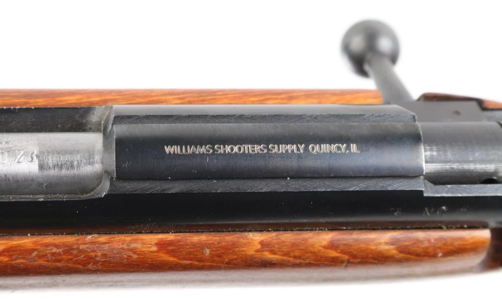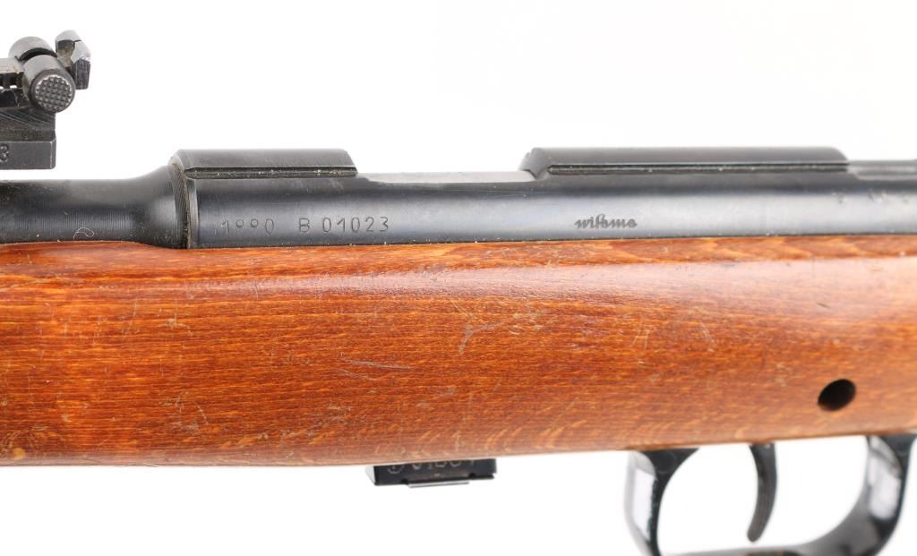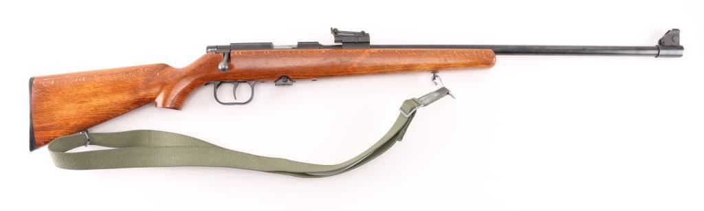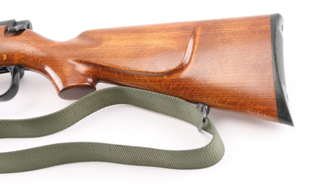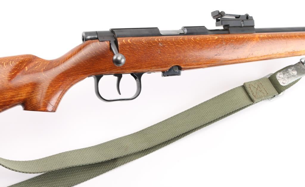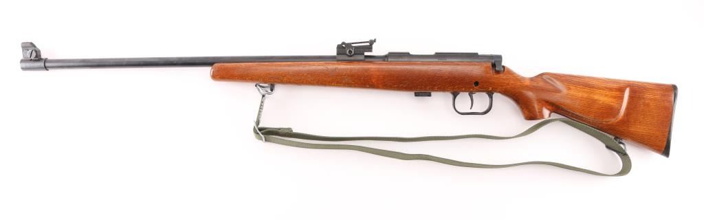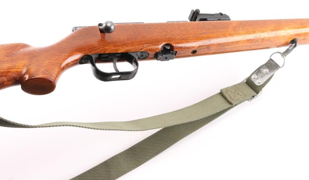 Polish bolt action right hand 22LR training rifle, Imported by Williams Shooting Supplies, Quincy, Ill. , Blued finish, open sights the mimic the AK sight picture (numbered to gun), Magazine has Ser # etched on side, adjustable trigger, large triggerguard, manual safety, detachable 5-rd magazine. Plane wood stock with cheek rest 26 Inch barrel bore is excellent action is smooth, Receiver is milled for scope rings, Finish is very good. Wood stock has minor scratches. Correct Green web sling. NRA Condition-Very Good. Modern Firearm.